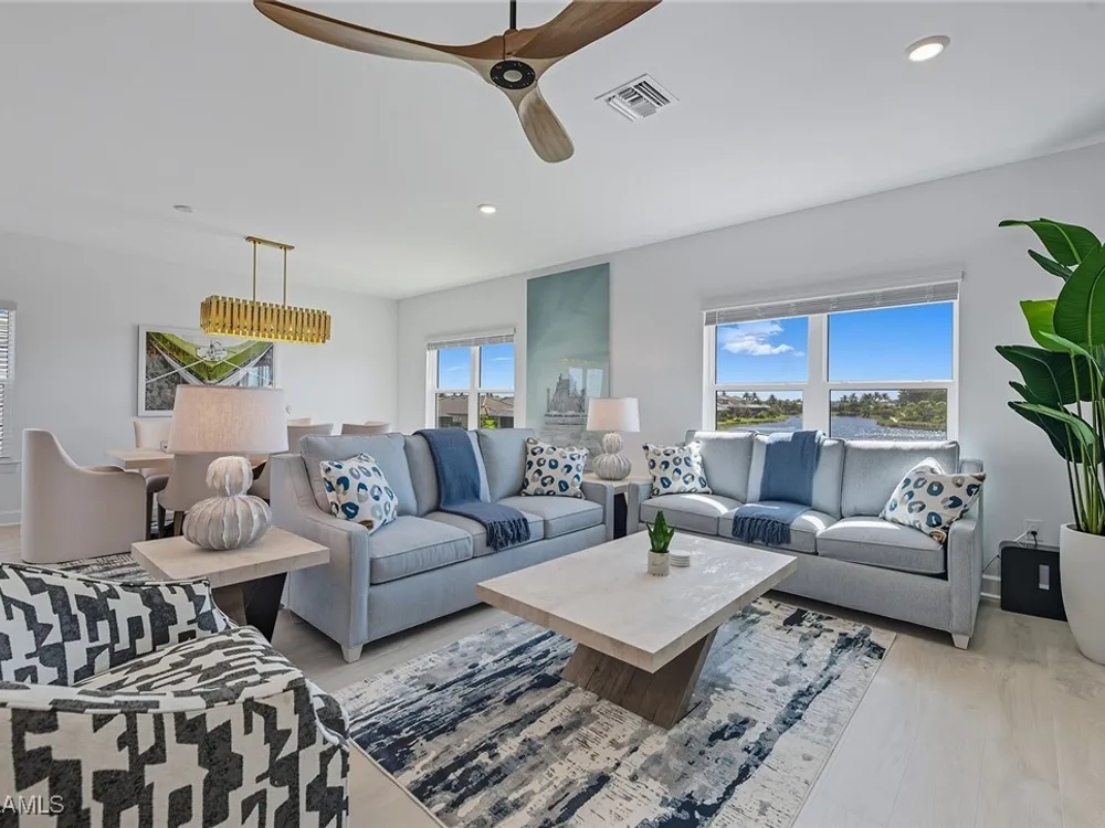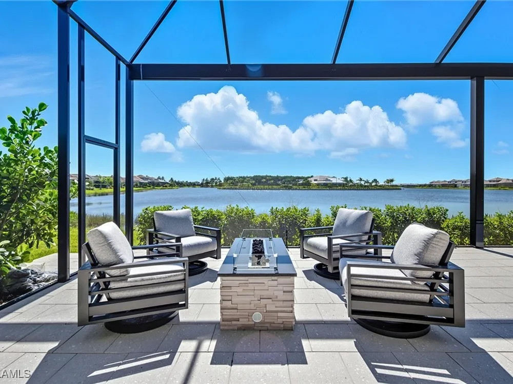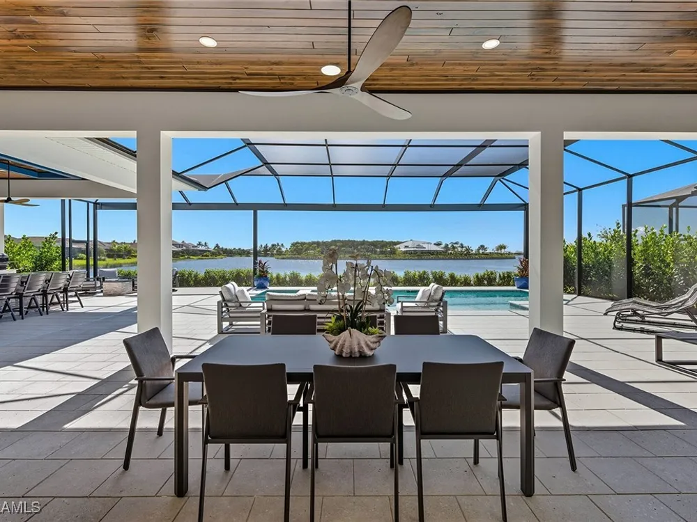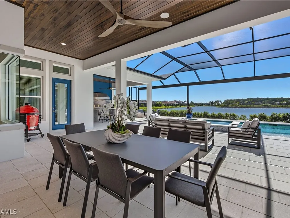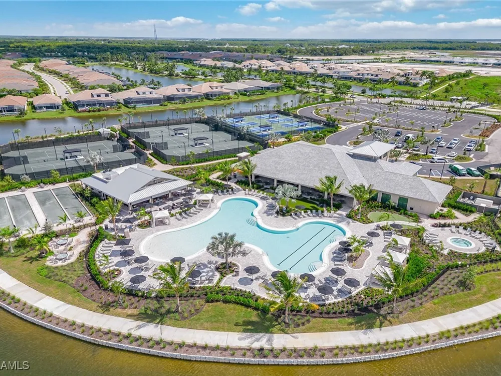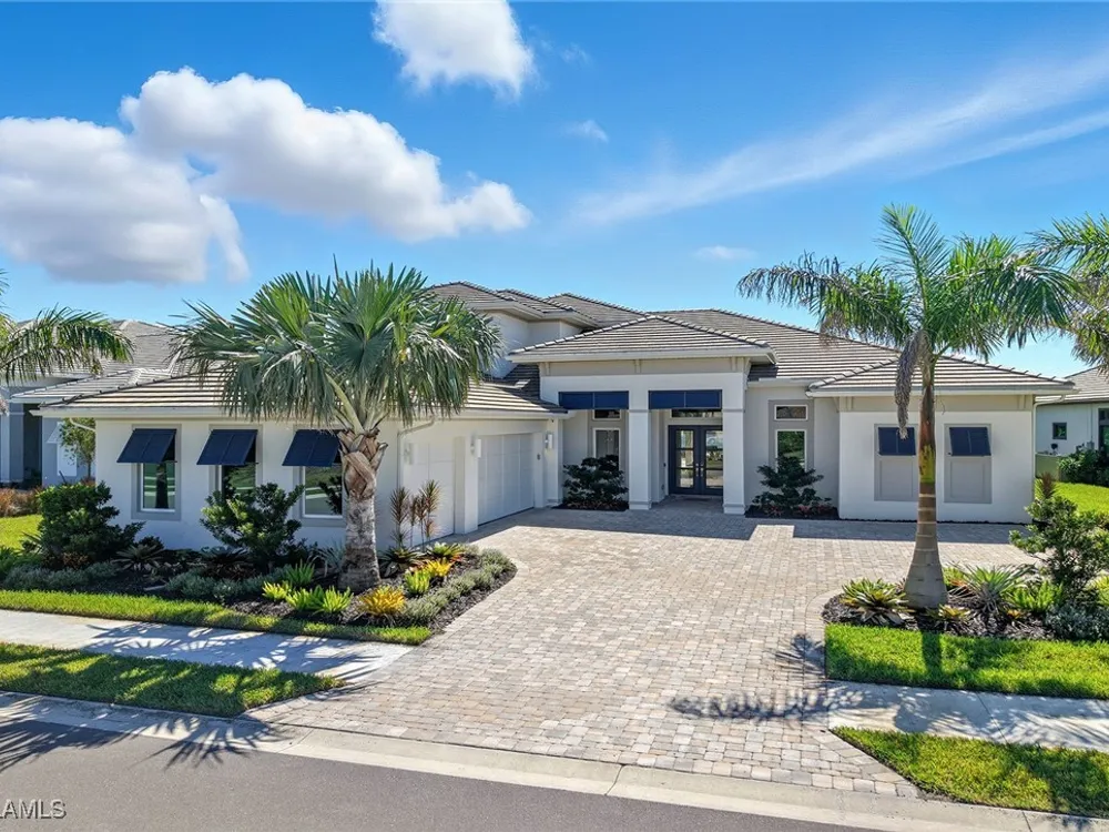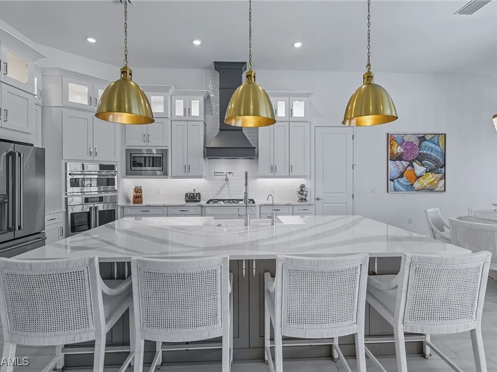 Experience modern luxury and breathtaking wide-water vistas from this magnificent newly built and fully furnished two-story residence in the popular gated community of Esplanade by the Islands. Completed in 2024, this better-than-new masterpiece was designed to capture unobstructed lake views from nearly every room-offering a serene and elegant backdrop for everyday living. Exquisite craftsmanship is evident throughout, with extensive millwork, refined finishes, and upgraded landscaping and lighting that elevate its exceptional curb appeal. Featuring four bedrooms plus a den, four full and two half baths, and a three-car garage, this residence seamlessly combines sophistication, comfort and functionality. Go through impressive impact-rated double doors into an open-concept living space highlighted by tray ceilings, designer chandeliers, transom windows and recessed lighting. The great room showcases a shiplap accent wall, built-in fireplace, and expansive glass sliders that open to the lanai for effortless indoor-outdoor living. The gourmet kitchen is a chef’s dream, complete with white shaker cabinetry, in- and under-cabinet lighting, quartz counters, white subway tile backsplash, dual beverage refrigerators and GE Café stainless appliances, including a natural gas cooktop. A large island with pendant lighting and an adjacent dining area create an inviting space for gatherings. The den, accented with French doors and a shiplap feature wall, offers a private workspace or cozy retreat. The primary suite is a peaceful sanctuary with panoramic pool and lake views, lanai access, dual walk-in closets and a spa-inspired bath featuring a soaking tub, dual quartz vanities and a frameless glass shower. Two main-level guest suites each offer walk-in closets and beautifully appointed en-suite baths, one with pool access. Upstairs, a spacious loft serves as an additional living and entertainment area, complete with a sleek wet bar featuring quartz counters, GE stainless appliances (mini refrigerator, dishwasher, microwave and sink), and an adjacent powder bath. A private guest bedroom with en-suite bath completes this level, providing a comfortable retreat with stunning lake views. The outdoor living area is an entertainer’s dream. Enjoy a panoramic screen enclosure, paver-tiled lanai, and a covered seating area with tongue-and-groove ceiling, recessed lighting, and a full outdoor kitchen complete with quartz counters and backsplash, grill, double-drawer refrigerator and island seating. Additional highlights include a wide brick-paver driveway, impact-resistant doors and windows, a tankless natural gas water heater, three Lennox air handlers, and a climate-controlled three-car garage with epoxy flooring, natural light and an air-conditioning mini split. Residents enjoy resort-style amenities, including a pool and spa, fitness center, pickleball and tennis courts, salon and spa services, and poolside dining at The Bahama Bar, with Culinary Center coming soon.