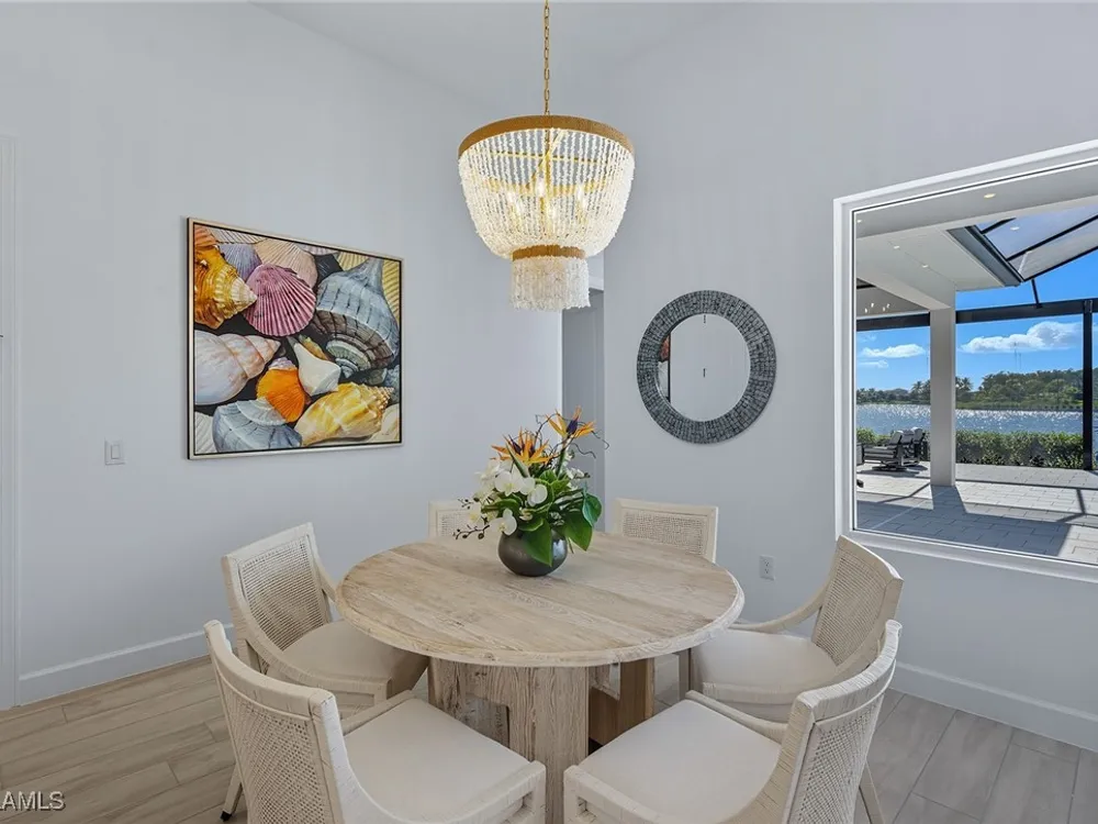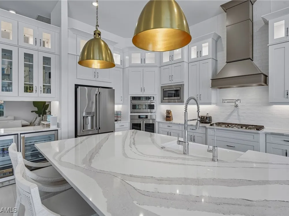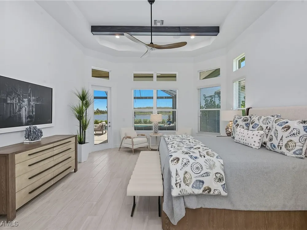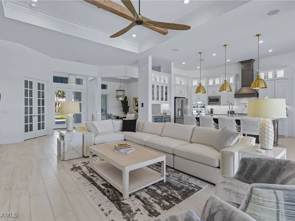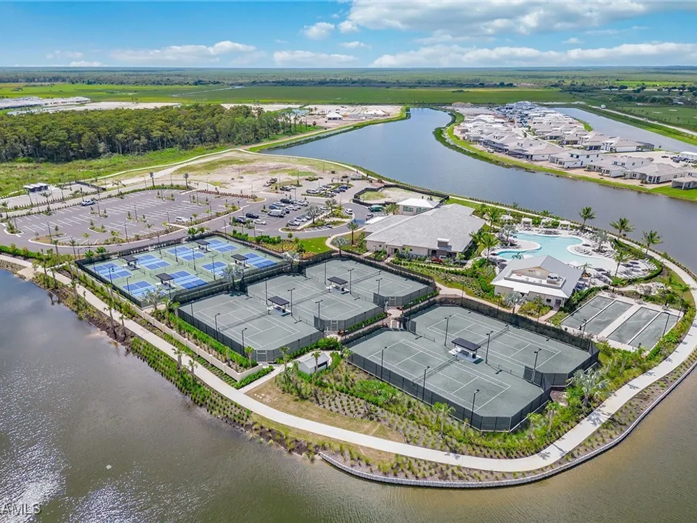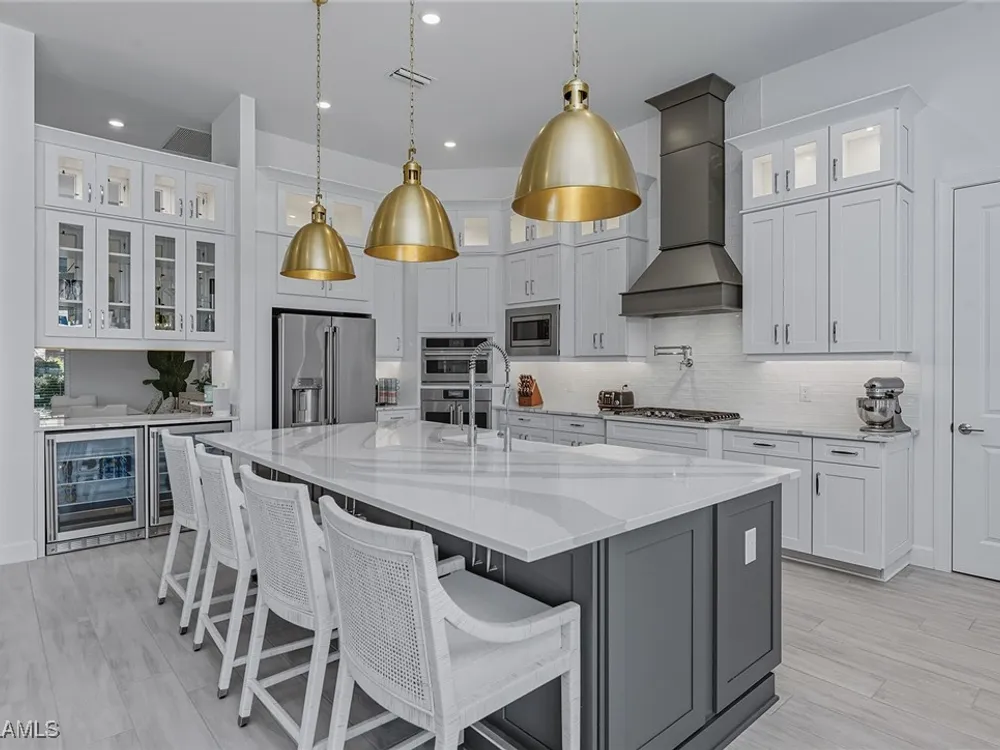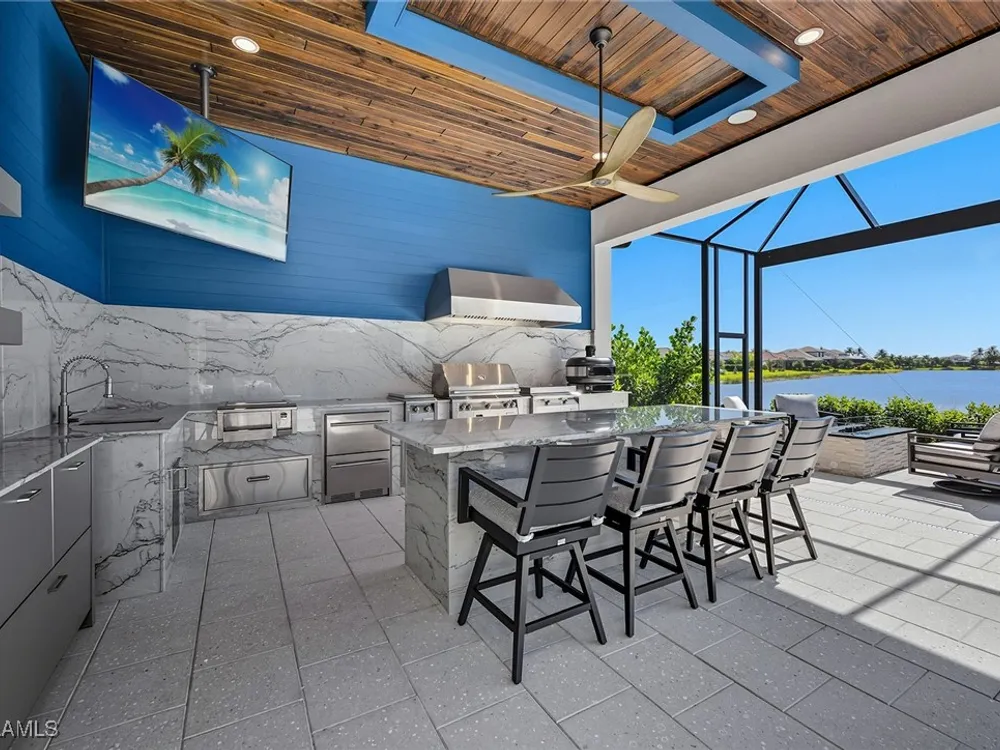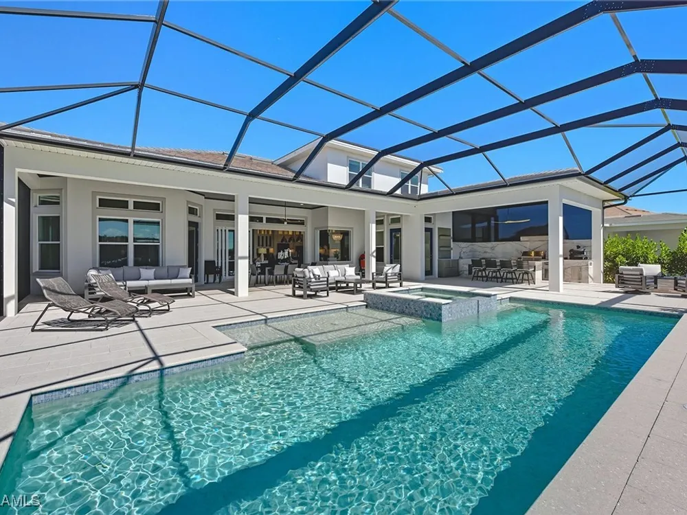 Experience modern luxury and breathtaking wide-water vistas from this magnificent newly built and fully furnished two-story residence in the popular gated community of Esplanade by the Islands. Completed in 2024, this better-than-new masterpiece was designed to capture unobstructed lake views from nearly every room-offering a serene and elegant backdrop for everyday living. Exquisite craftsmanship is evident throughout, with extensive millwork, refined finishes, and upgraded landscaping and lighting that elevate its exceptional curb appeal. Featuring four bedrooms plus a den, four full and two half baths, and a three-car garage, this residence seamlessly combines sophistication, comfort and functionality. Go through impressive impact-rated double doors into an open-concept living space highlighted by tray ceilings, designer chandeliers, transom windows and recessed lighting. The great room showcases a shiplap accent wall, built-in fireplace, and expansive glass sliders that open to the lanai for effortless indoor-outdoor living. The gourmet kitchen is a chef’s dream, complete with white shaker cabinetry, in- and under-cabinet lighting, quartz counters, white subway tile backsplash, dual beverage refrigerators and GE Café stainless appliances, including a natural gas cooktop. A large island with pendant lighting and an adjacent dining area create an inviting space for gatherings. The den, accented with French doors and a shiplap feature wall, offers a private workspace or cozy retreat. The primary suite is a peaceful sanctuary with panoramic pool and lake views, lanai access, dual walk-in closets and a spa-inspired bath featuring a soaking tub, dual quartz vanities and a frameless glass shower. Two main-level guest suites each offer walk-in closets and beautifully appointed en-suite baths, one with pool access. Upstairs, a spacious loft serves as an additional living and entertainment area, complete with a sleek wet bar featuring quartz counters, GE stainless appliances (mini refrigerator, dishwasher, microwave and sink), and an adjacent powder bath. A private guest bedroom with en-suite bath completes this level, providing a comfortable retreat with stunning lake views. The outdoor living area is an entertainer’s dream. Enjoy a panoramic screen enclosure, paver-tiled lanai, and a covered seating area with tongue-and-groove ceiling, recessed lighting, and a full outdoor kitchen complete with quartz counters and backsplash, grill, double-drawer refrigerator and island seating. Additional highlights include a wide brick-paver driveway, impact-resistant doors and windows, a tankless natural gas water heater, three Lennox air handlers, and a climate-controlled three-car garage with epoxy flooring, natural light and an air-conditioning mini split. Residents enjoy resort-style amenities, including a pool and spa, fitness center, pickleball and tennis courts, salon and spa services, and poolside dining at The Bahama Bar, with Culinary Center coming soon.