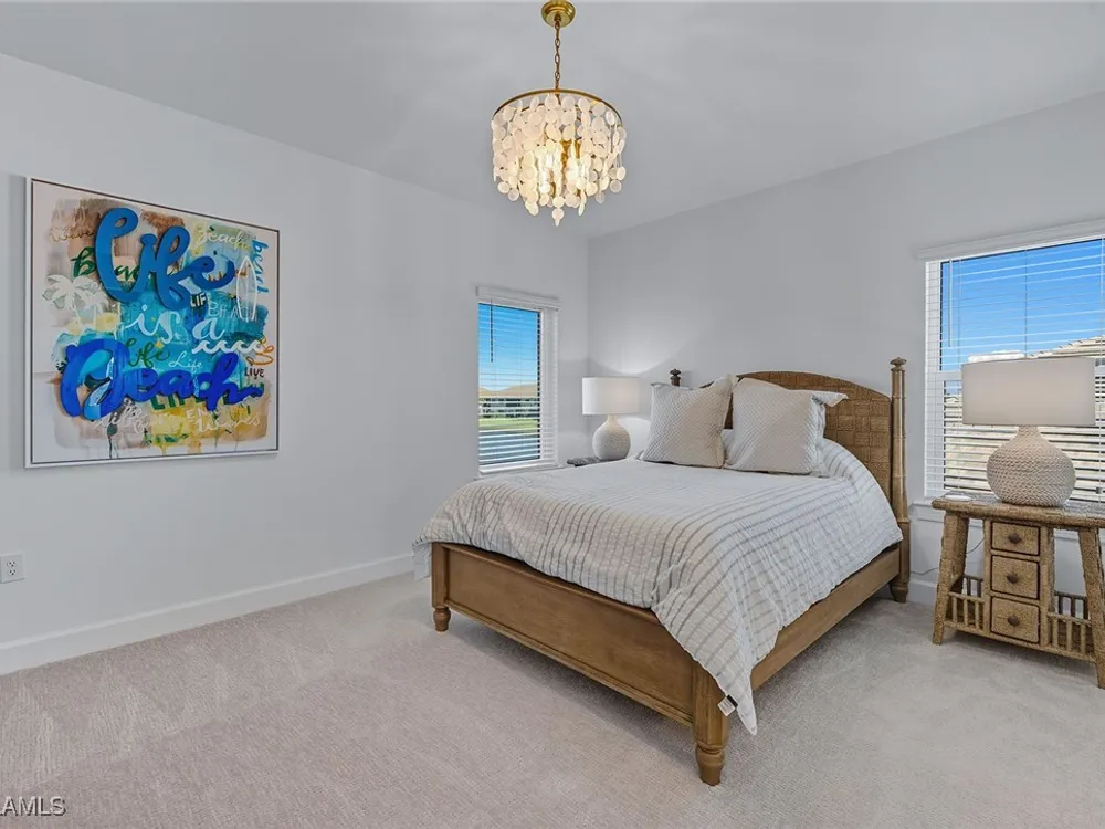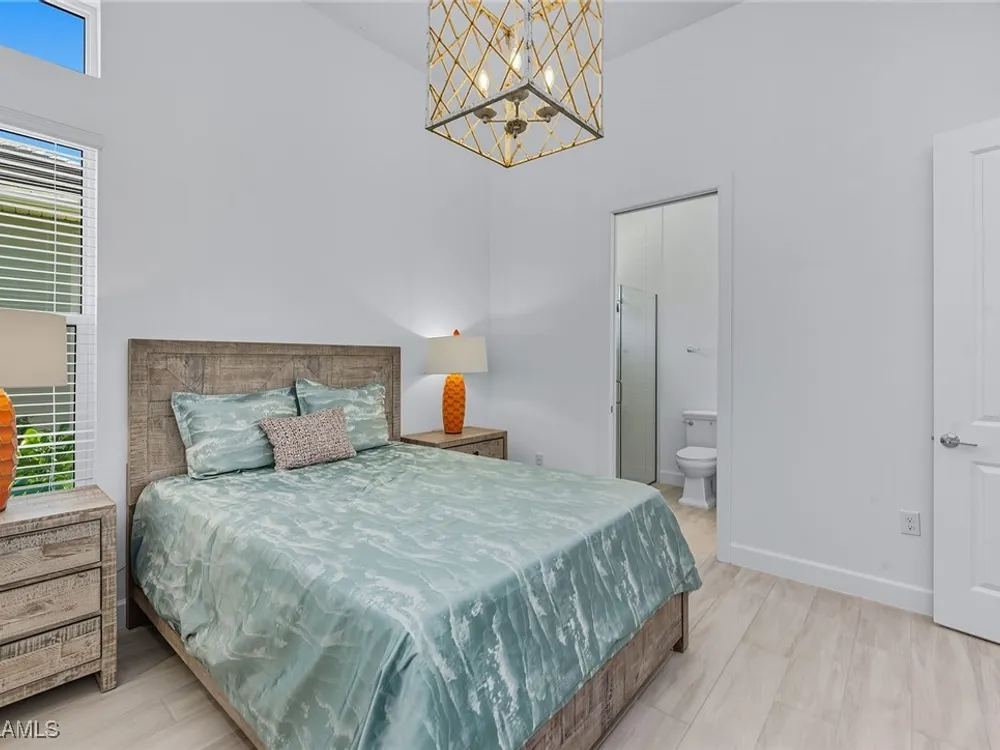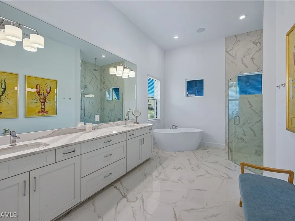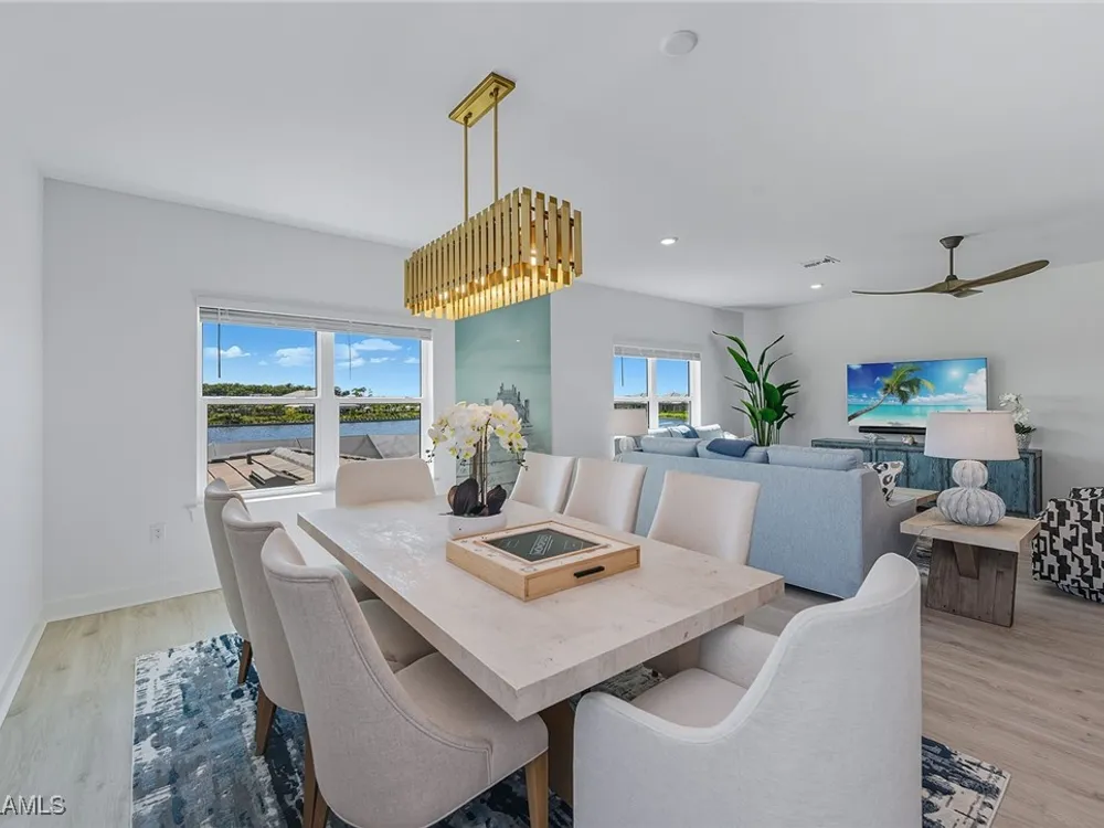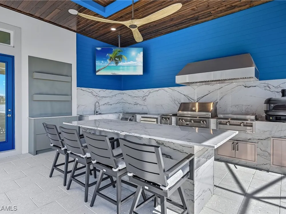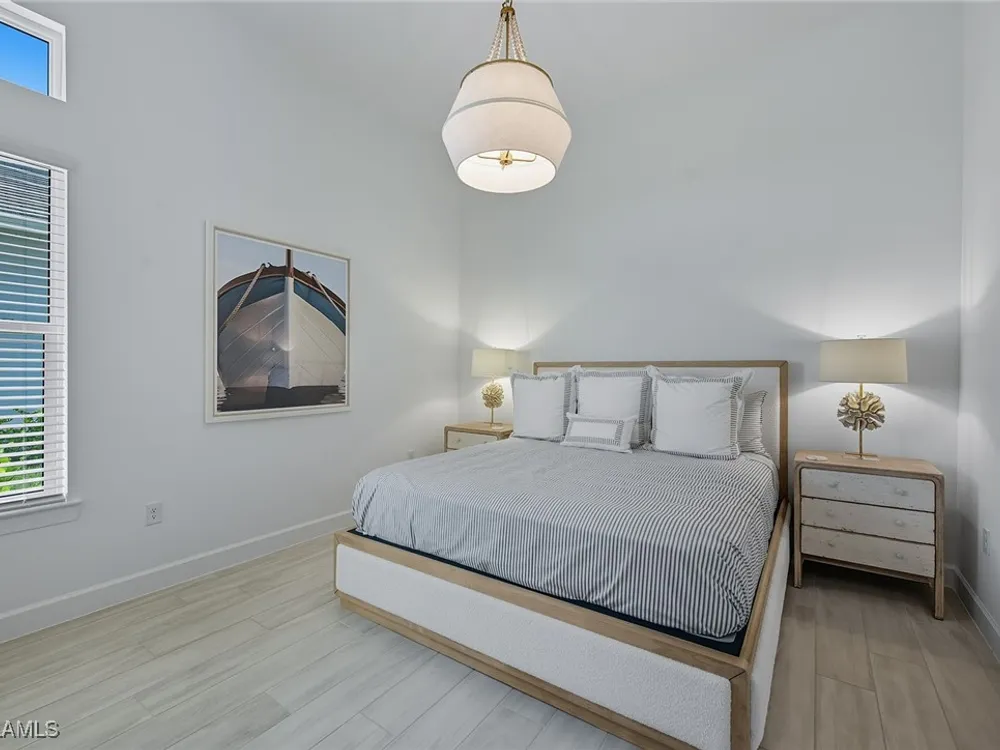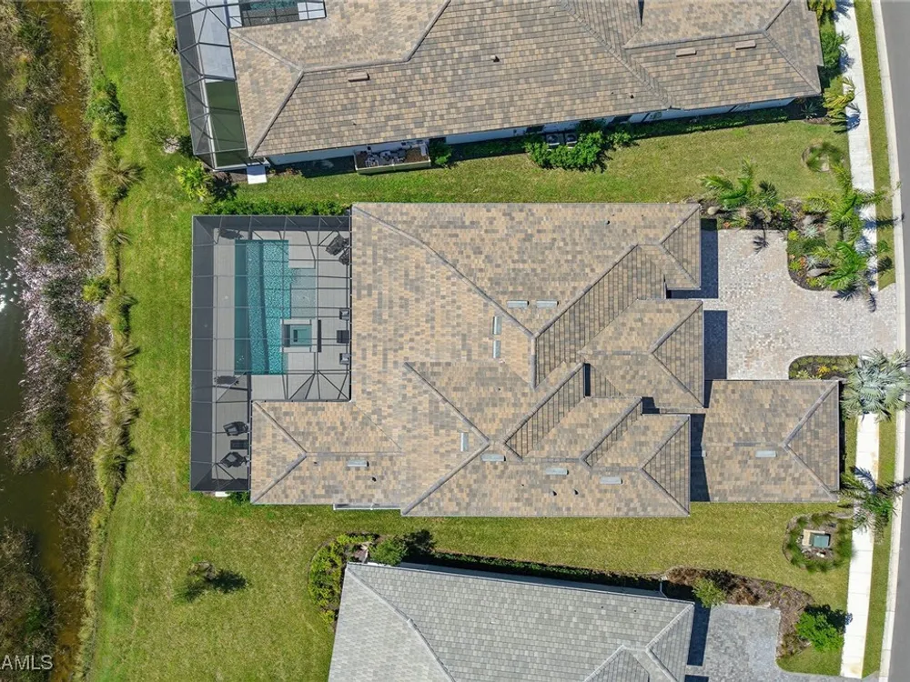 Experience modern luxury and breathtaking wide-water vistas from this magnificent newly built and fully furnished two-story residence in the popular gated community of Esplanade by the Islands. Completed in 2024, this better-than-new masterpiece was designed to capture unobstructed lake views from nearly every room-offering a serene and elegant backdrop for everyday living. Exquisite craftsmanship is evident throughout, with extensive millwork, refined finishes, and upgraded landscaping and lighting that elevate its exceptional curb appeal. Featuring four bedrooms plus a den, four full and two half baths, and a three-car garage, this residence seamlessly combines sophistication, comfort and functionality. Go through impressive impact-rated double doors into an open-concept living space highlighted by tray ceilings, designer chandeliers, transom windows and recessed lighting. The great room showcases a shiplap accent wall, built-in fireplace, and expansive glass sliders that open to the lanai for effortless indoor-outdoor living. The gourmet kitchen is a chef’s dream, complete with white shaker cabinetry, in- and under-cabinet lighting, quartz counters, white subway tile backsplash, dual beverage refrigerators and GE Café stainless appliances, including a natural gas cooktop. A large island with pendant lighting and an adjacent dining area create an inviting space for gatherings. The den, accented with French doors and a shiplap feature wall, offers a private workspace or cozy retreat. The primary suite is a peaceful sanctuary with panoramic pool and lake views, lanai access, dual walk-in closets and a spa-inspired bath featuring a soaking tub, dual quartz vanities and a frameless glass shower. Two main-level guest suites each offer walk-in closets and beautifully appointed en-suite baths, one with pool access. Upstairs, a spacious loft serves as an additional living and entertainment area, complete with a sleek wet bar featuring quartz counters, GE stainless appliances (mini refrigerator, dishwasher, microwave and sink), and an adjacent powder bath. A private guest bedroom with en-suite bath completes this level, providing a comfortable retreat with stunning lake views. The outdoor living area is an entertainer’s dream. Enjoy a panoramic screen enclosure, paver-tiled lanai, and a covered seating area with tongue-and-groove ceiling, recessed lighting, and a full outdoor kitchen complete with quartz counters and backsplash, grill, double-drawer refrigerator and island seating. Additional highlights include a wide brick-paver driveway, impact-resistant doors and windows, a tankless natural gas water heater, three Lennox air handlers, and a climate-controlled three-car garage with epoxy flooring, natural light and an air-conditioning mini split. Residents enjoy resort-style amenities, including a pool and spa, fitness center, pickleball and tennis courts, salon and spa services, and poolside dining at The Bahama Bar, with Culinary Center coming soon.