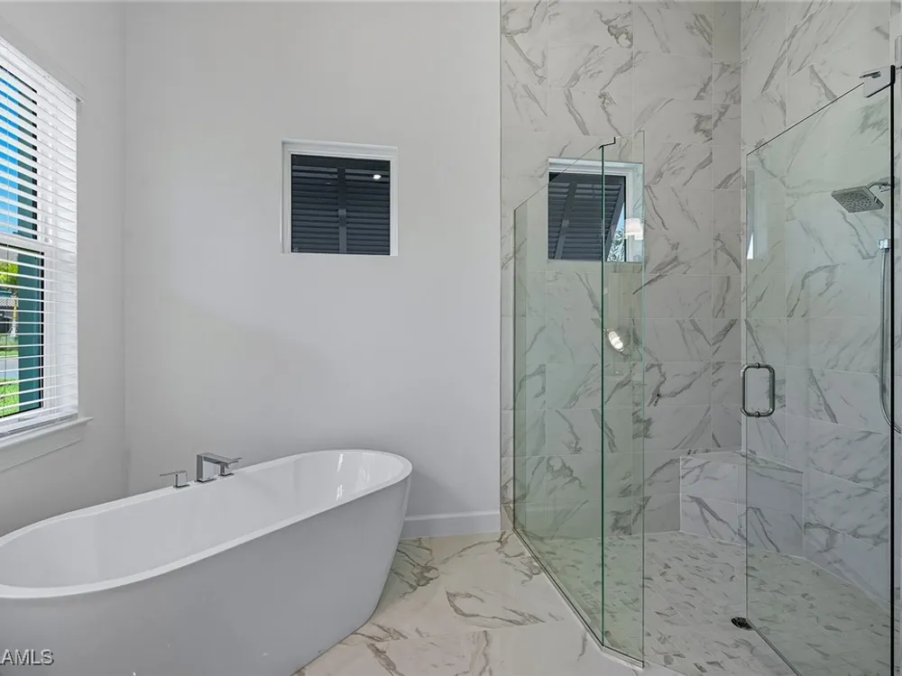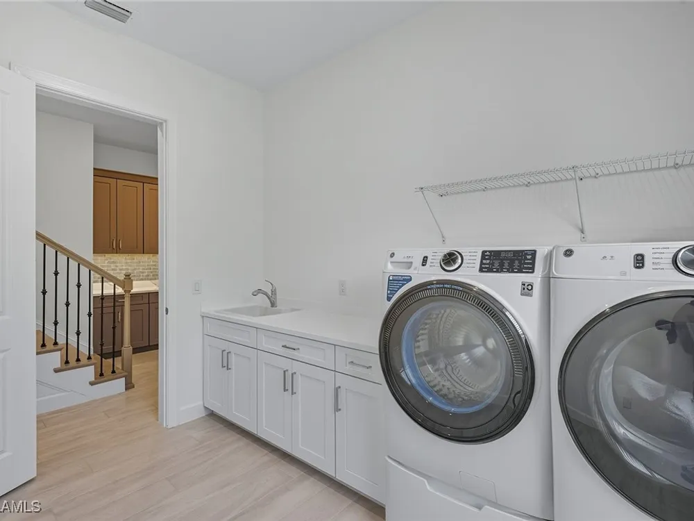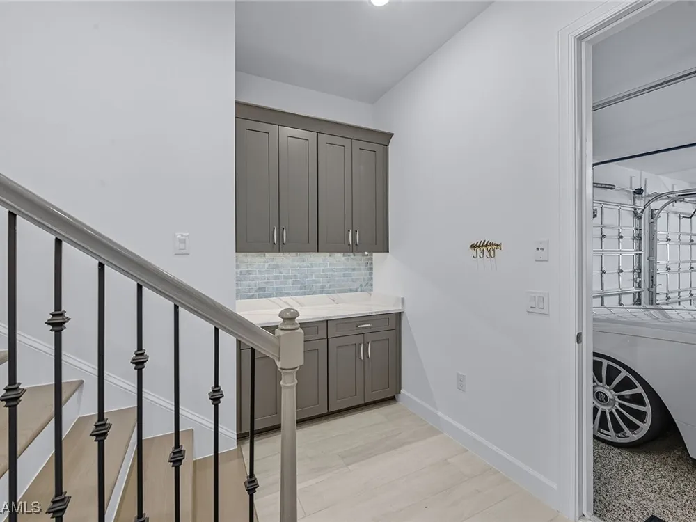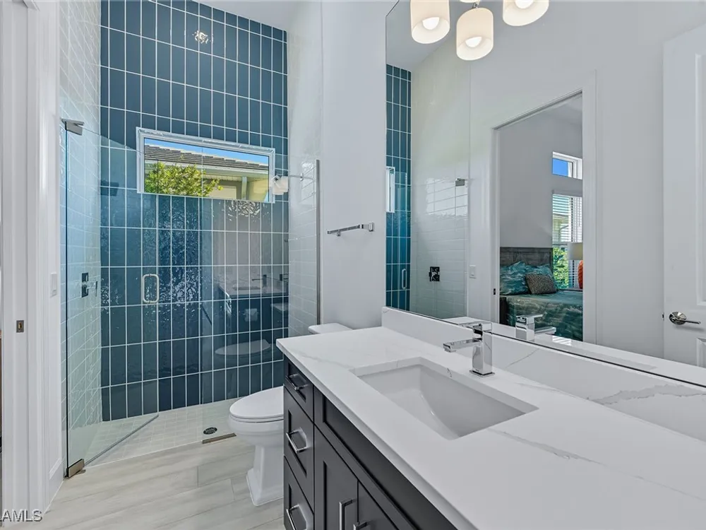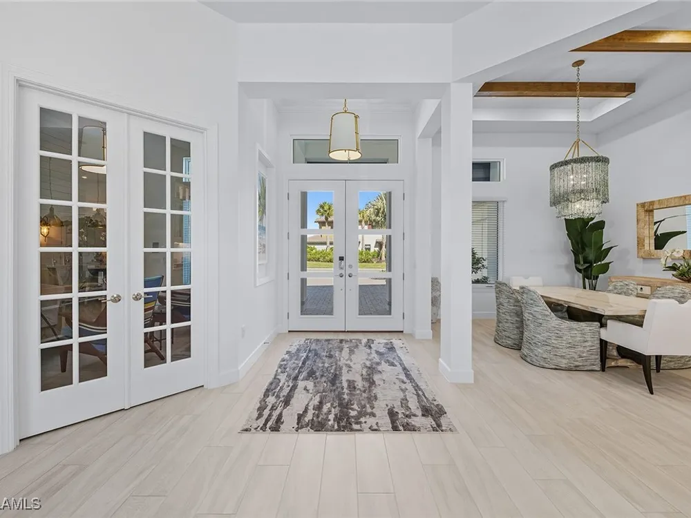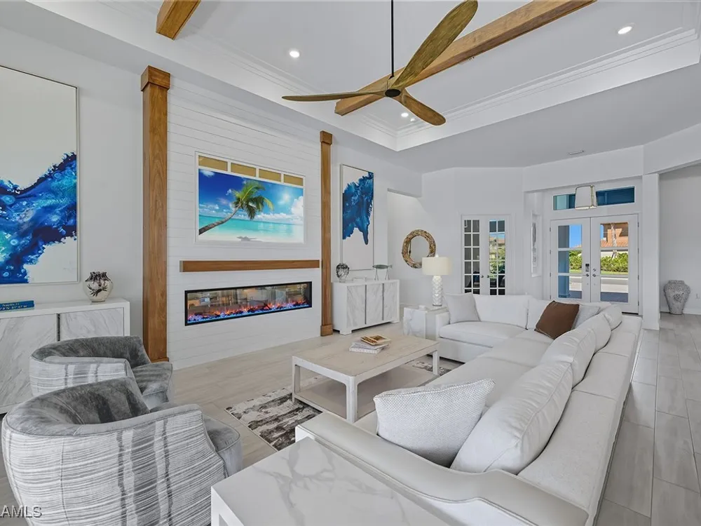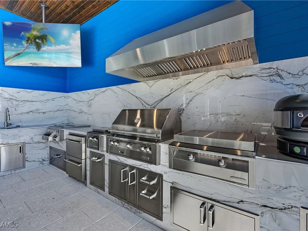 Experience modern luxury and breathtaking wide-water vistas from this magnificent newly built and fully furnished two-story residence in the popular gated community of Esplanade by the Islands. Completed in 2024, this better-than-new masterpiece was designed to capture unobstructed lake views from nearly every room-offering a serene and elegant backdrop for everyday living. Exquisite craftsmanship is evident throughout, with extensive millwork, refined finishes, and upgraded landscaping and lighting that elevate its exceptional curb appeal. Featuring four bedrooms plus a den, four full and two half baths, and a three-car garage, this residence seamlessly combines sophistication, comfort and functionality. Go through impressive impact-rated double doors into an open-concept living space highlighted by tray ceilings, designer chandeliers, transom windows and recessed lighting. The great room showcases a shiplap accent wall, built-in fireplace, and expansive glass sliders that open to the lanai for effortless indoor-outdoor living. The gourmet kitchen is a chef’s dream, complete with white shaker cabinetry, in- and under-cabinet lighting, quartz counters, white subway tile backsplash, dual beverage refrigerators and GE Café stainless appliances, including a natural gas cooktop. A large island with pendant lighting and an adjacent dining area create an inviting space for gatherings. The den, accented with French doors and a shiplap feature wall, offers a private workspace or cozy retreat. The primary suite is a peaceful sanctuary with panoramic pool and lake views, lanai access, dual walk-in closets and a spa-inspired bath featuring a soaking tub, dual quartz vanities and a frameless glass shower. Two main-level guest suites each offer walk-in closets and beautifully appointed en-suite baths, one with pool access. Upstairs, a spacious loft serves as an additional living and entertainment area, complete with a sleek wet bar featuring quartz counters, GE stainless appliances (mini refrigerator, dishwasher, microwave and sink), and an adjacent powder bath. A private guest bedroom with en-suite bath completes this level, providing a comfortable retreat with stunning lake views. The outdoor living area is an entertainer’s dream. Enjoy a panoramic screen enclosure, paver-tiled lanai, and a covered seating area with tongue-and-groove ceiling, recessed lighting, and a full outdoor kitchen complete with quartz counters and backsplash, grill, double-drawer refrigerator and island seating. Additional highlights include a wide brick-paver driveway, impact-resistant doors and windows, a tankless natural gas water heater, three Lennox air handlers, and a climate-controlled three-car garage with epoxy flooring, natural light and an air-conditioning mini split. Residents enjoy resort-style amenities, including a pool and spa, fitness center, pickleball and tennis courts, salon and spa services, and poolside dining at The Bahama Bar, with Culinary Center coming soon.