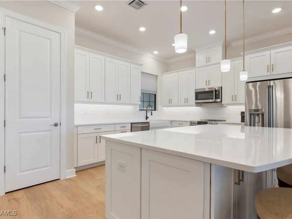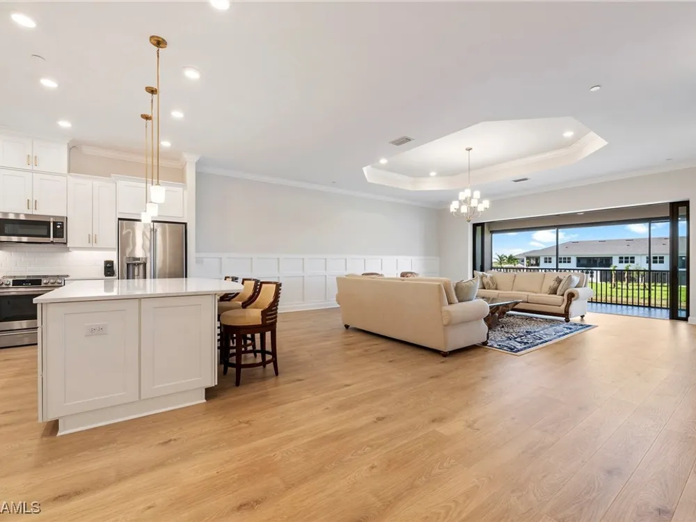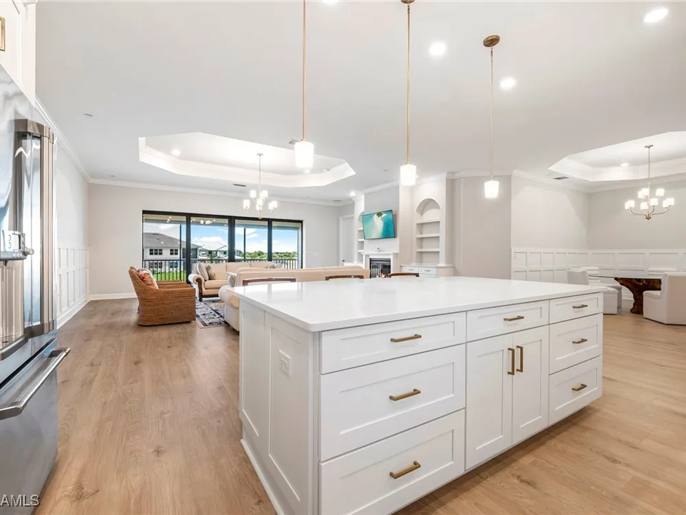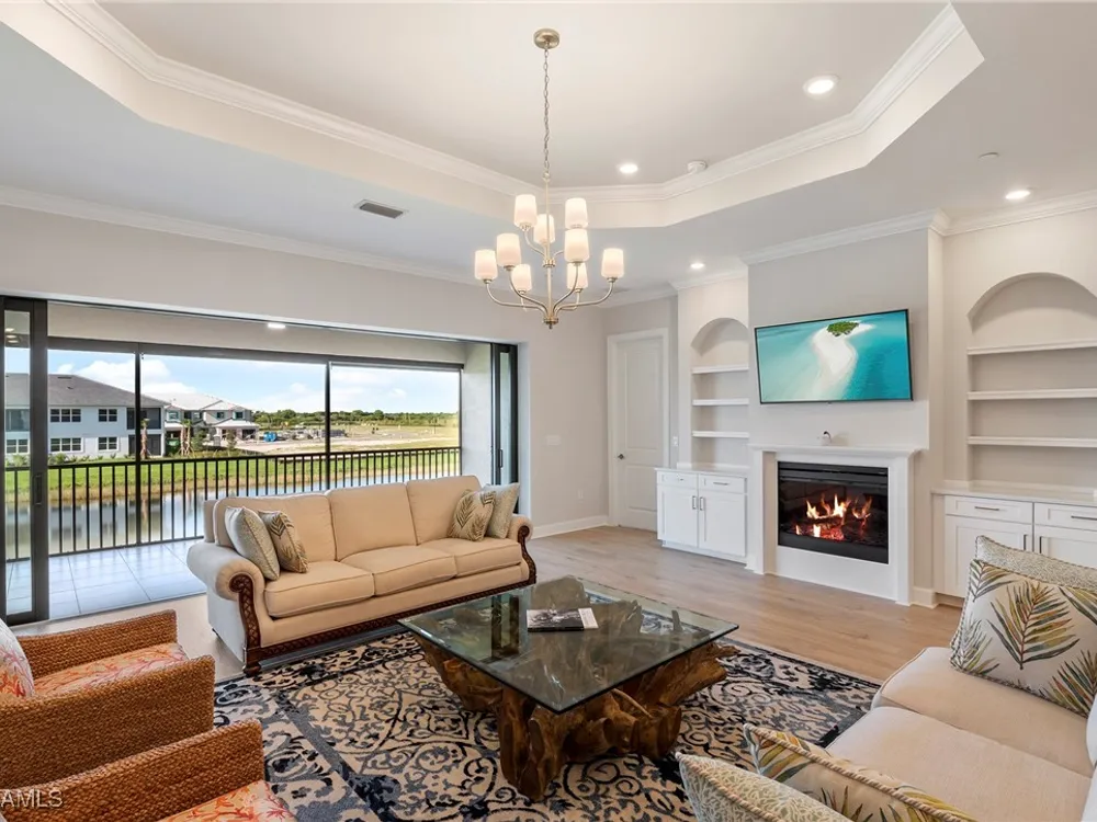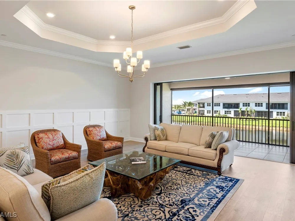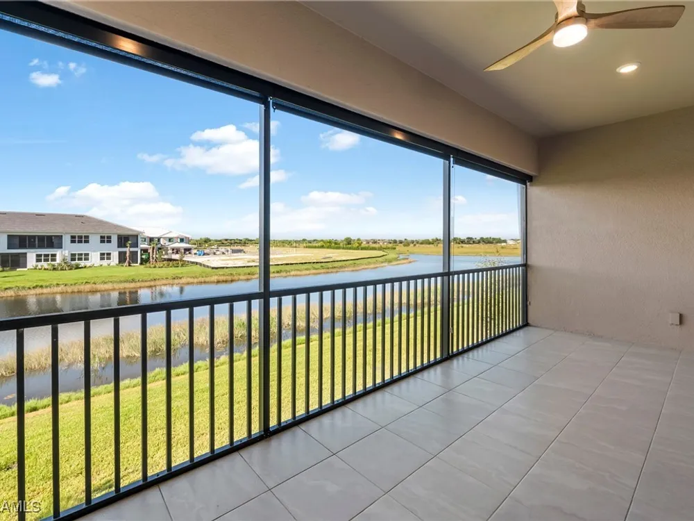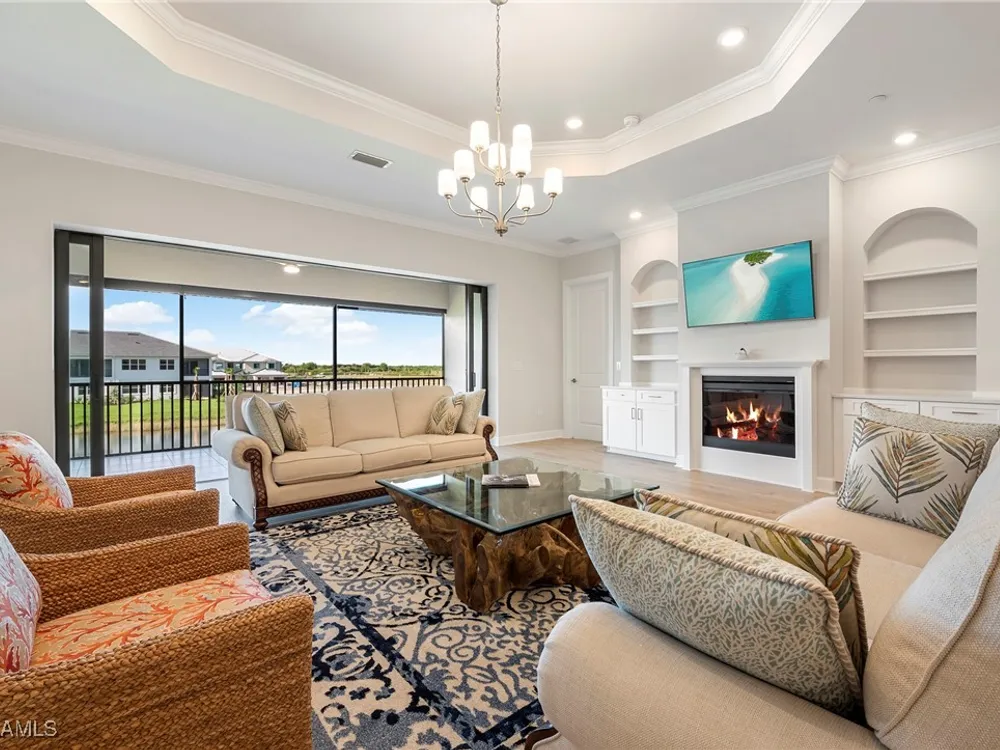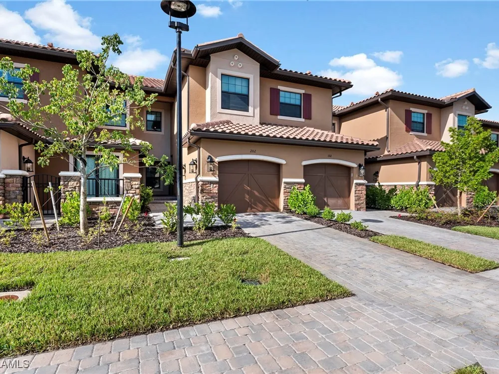 Welcome to luxury living at Esplanade by the Islands in beautiful Naples, Florida. This stunning, second-floor Bellissimo floorplan coach home offers 2,343 sq. ft. of refined living space, 600+ sqft of outdoor private lanai space, featuring 3 spacious bedrooms, 3 bathrooms, and a sun-drenched lanai with a wide, serene water view—better than what's currently available brand-new. Sale includes custom high-end chandeliers and Tommy Bahama brand furnishings. This home is heavily upgraded, with over $100,000 in premium finishes, including upgraded flooring, custom cabinetry, custom woodwork and high-end Café appliances. The open-concept design creates a natural flow from the expansive great room to the gourmet kitchen, which is beautifully appointed with quartz countertops, stainless steel appliances, a beverage fridge, and modern designer touches. The luxurious owner’s suite is a private retreat featuring a dual sink vanity, large walk-in shower, water closet, and spacious walk-in closet. Two additional bedrooms and bathrooms are thoughtfully placed for privacy, along with a well-equipped laundry room. Additional highlights include hurricane impact-resistant windows, a 1-car attached garage, and the peace of mind that comes with brand-new construction. Located just off US-41, Esplanade by the Islands offers the best of resort-style living just minutes from Marco Island, Gulf beaches, and vibrant downtown Naples. As a resident, you'll enjoy access to a wide range of world-class amenities, including the Bahama Bar & Grille, Wellness Center & Day Spa (offering hair, nails, facials, and massage), multiple resort-style pools and hot tubs, a state-of-the-art Fitness Center, Tennis and Pickleball courts, dog park, and scenic walking trails. Future plans include a dedicated Culinary Arts Center, enhancing the community’s focus on food, wine, and social experiences. Lifestyle programming includes wine tastings, spa and wellness events, live concerts, and curated excursions, all designed to enrich your daily living. With very low HOA fees that cover landscaping, irrigation, pest control, water, and full access to the incredible amenities, this home offers both luxury and value. A brand-new Publix supermarket is conveniently located next door, making everyday errands effortless. Don’t miss this exceptional opportunity to own a fully upgraded, move-in-ready residence in one of Naples’ most sought-after resort communities. Discover the elevated lifestyle that awaits you at Esplanade by the Islands, located in America’s #1 place to live—Naples, Florida.