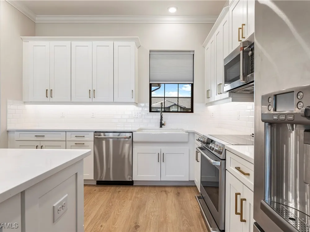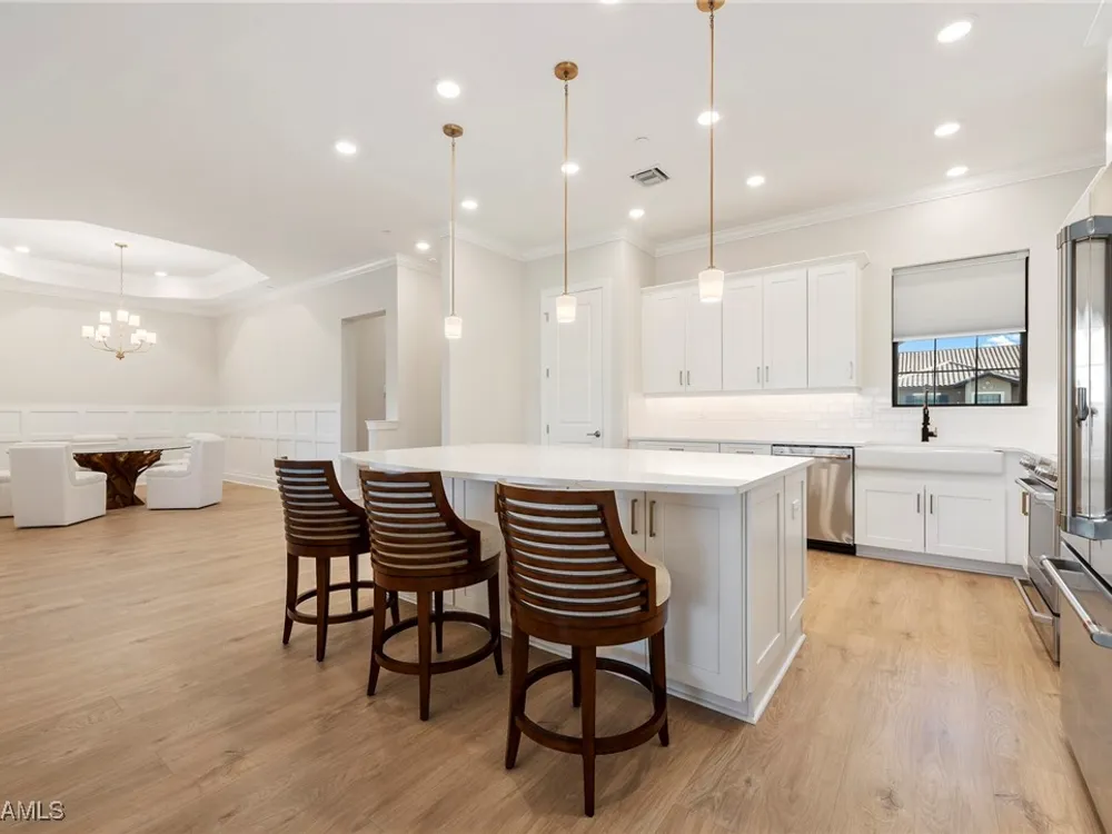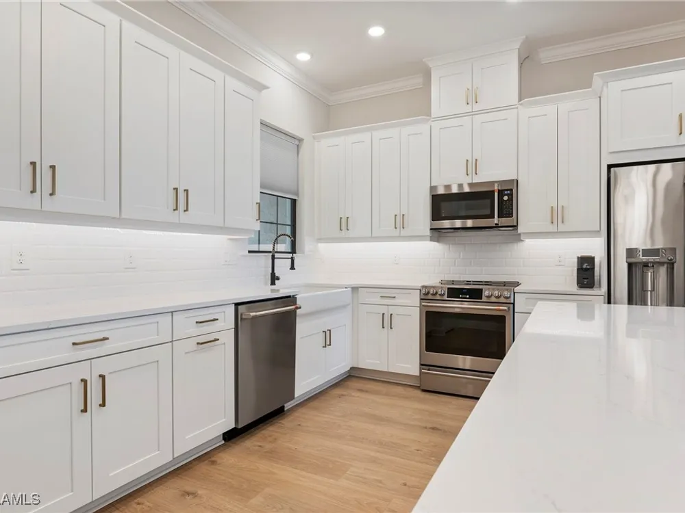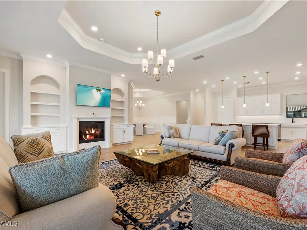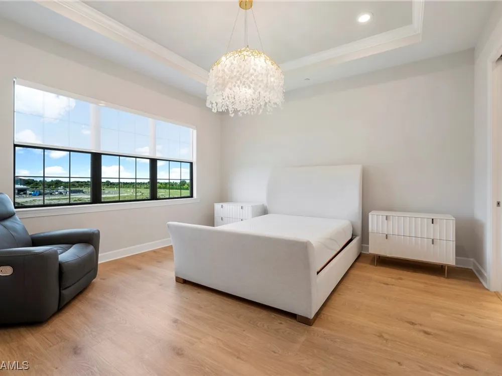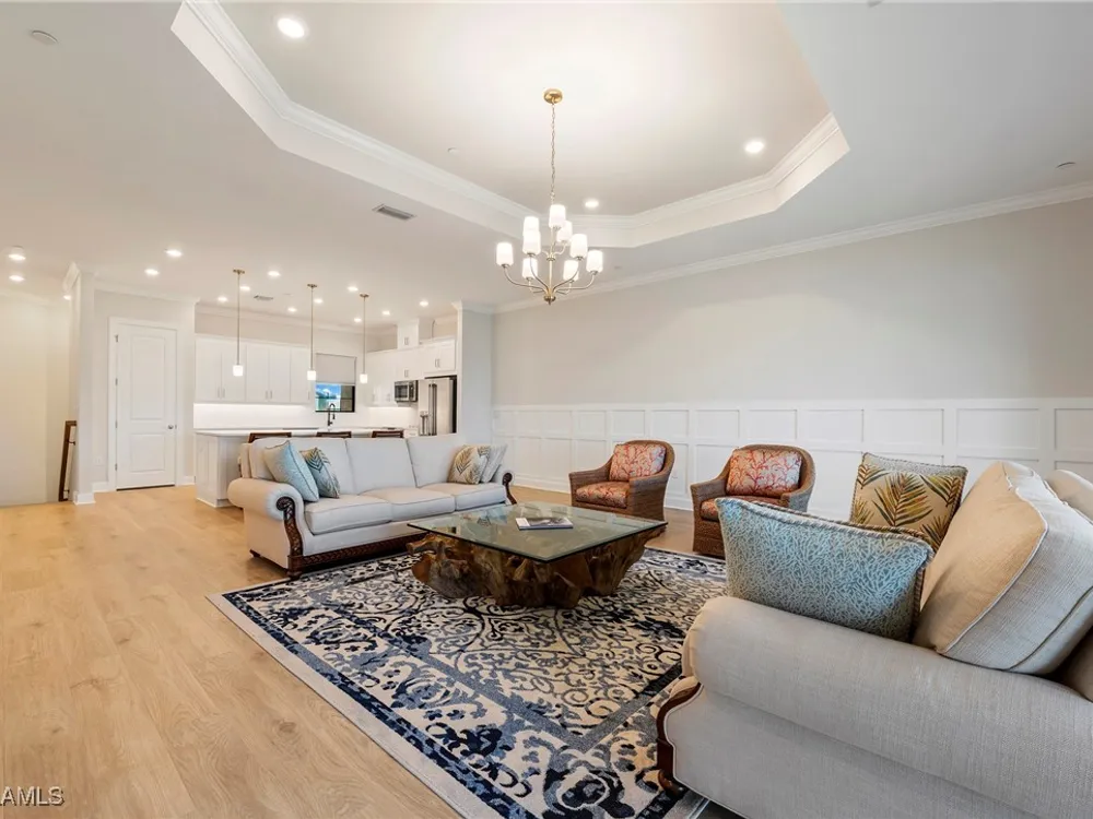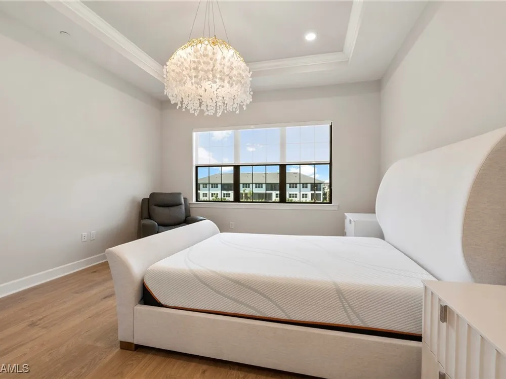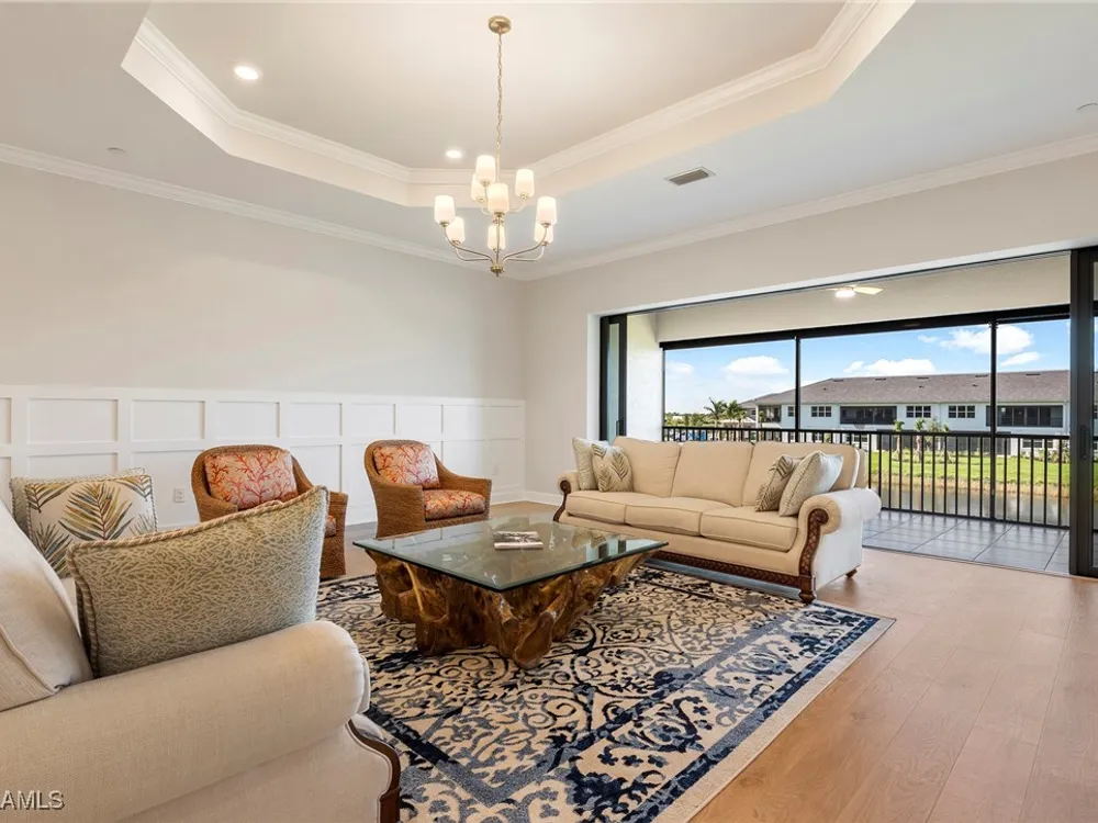 Welcome to luxury living at Esplanade by the Islands in beautiful Naples, Florida. This stunning, second-floor Bellissimo floorplan coach home offers 2,343 sq. ft. of refined living space, 600+ sqft of outdoor private lanai space, featuring 3 spacious bedrooms, 3 bathrooms, and a sun-drenched lanai with a wide, serene water view—better than what's currently available brand-new. Sale includes custom high-end chandeliers and Tommy Bahama brand furnishings. This home is heavily upgraded, with over $100,000 in premium finishes, including upgraded flooring, custom cabinetry, custom woodwork and high-end Café appliances. The open-concept design creates a natural flow from the expansive great room to the gourmet kitchen, which is beautifully appointed with quartz countertops, stainless steel appliances, a beverage fridge, and modern designer touches. The luxurious owner’s suite is a private retreat featuring a dual sink vanity, large walk-in shower, water closet, and spacious walk-in closet. Two additional bedrooms and bathrooms are thoughtfully placed for privacy, along with a well-equipped laundry room. Additional highlights include hurricane impact-resistant windows, a 1-car attached garage, and the peace of mind that comes with brand-new construction. Located just off US-41, Esplanade by the Islands offers the best of resort-style living just minutes from Marco Island, Gulf beaches, and vibrant downtown Naples. As a resident, you'll enjoy access to a wide range of world-class amenities, including the Bahama Bar & Grille, Wellness Center & Day Spa (offering hair, nails, facials, and massage), multiple resort-style pools and hot tubs, a state-of-the-art Fitness Center, Tennis and Pickleball courts, dog park, and scenic walking trails. Future plans include a dedicated Culinary Arts Center, enhancing the community’s focus on food, wine, and social experiences. Lifestyle programming includes wine tastings, spa and wellness events, live concerts, and curated excursions, all designed to enrich your daily living. With very low HOA fees that cover landscaping, irrigation, pest control, water, and full access to the incredible amenities, this home offers both luxury and value. A brand-new Publix supermarket is conveniently located next door, making everyday errands effortless. Don’t miss this exceptional opportunity to own a fully upgraded, move-in-ready residence in one of Naples’ most sought-after resort communities. Discover the elevated lifestyle that awaits you at Esplanade by the Islands, located in America’s #1 place to live—Naples, Florida.