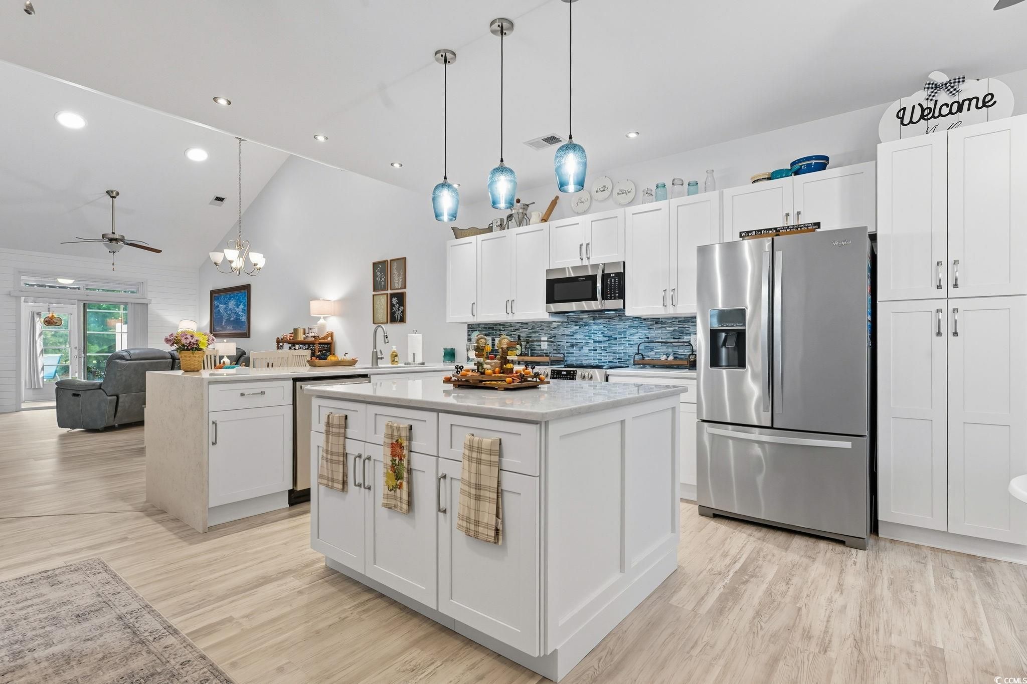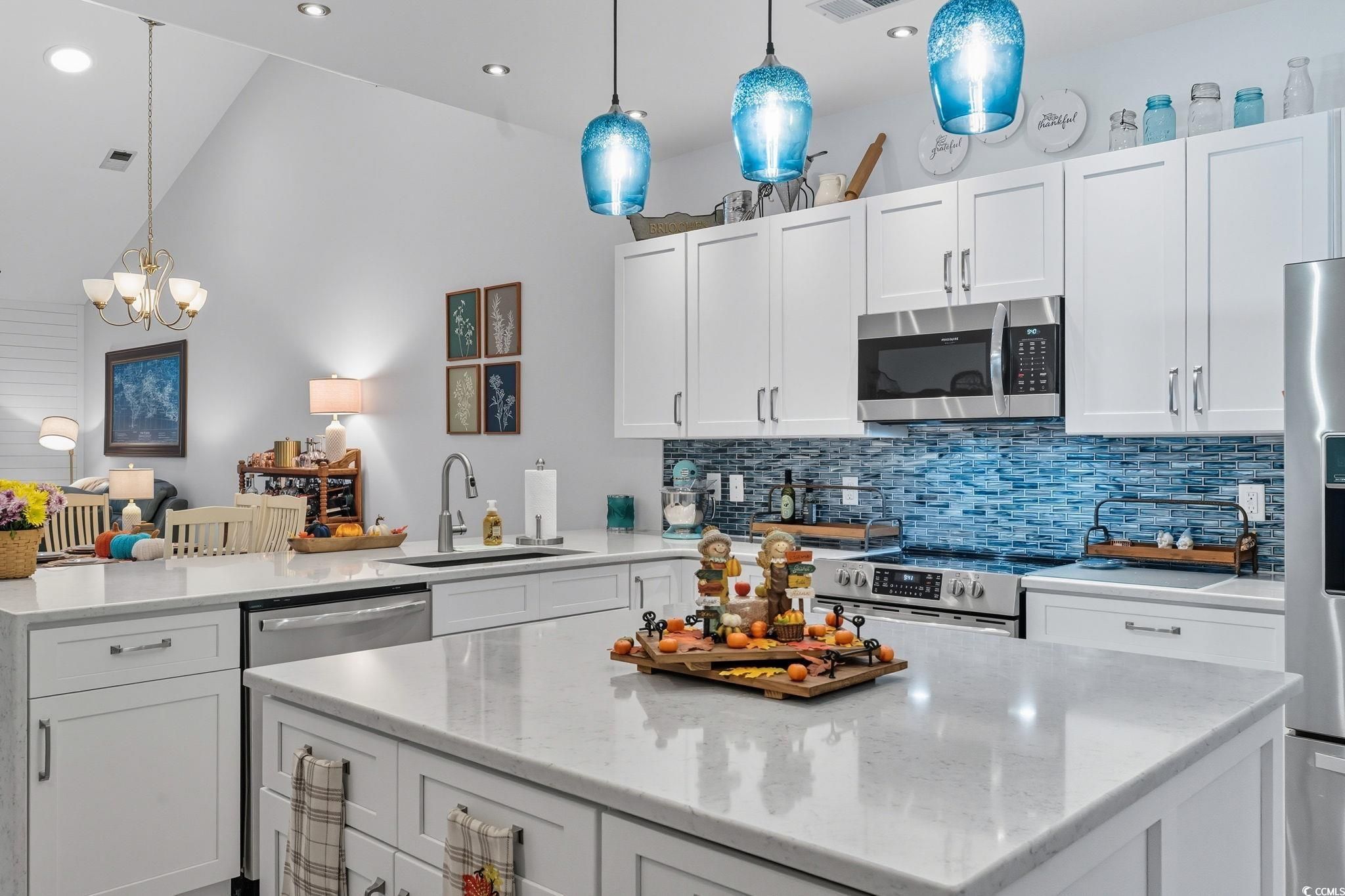 Welcome to this sought-after home in Cameron Village Garden Homes, built by Beazer Homes— beautifully updated and truly move-in ready! This single-level townhome offers a spacious and comfortable layout with 3 bedrooms, 2 full baths, a 1.5-car garage, a new HVAC system (Feb 2025), a new roof (Aug 2025), and a Carolina Room with Eze-Breeze windows which overlooks the pond. The fully renovated kitchen features expanded white cabinetry, an oversized island with extra storage and pullout drawers, upgraded stainless steel appliances, a tile backsplash, and stunning white quartz countertops with a waterfall edge. The bar seating and stylish lighting add the perfect finishing touches. The open concept living and dining area boasts vaulted ceilings, solar tubes for natural light, and LVP flooring throughout. The primary suite offers a tray ceiling, a spacious bathroom with a garden tub, a separate shower, and updated cabinetry — combining comfort and elegance in every detail. This home also includes hurricane shutters. Garage attic is partially floored with pull down stairs. The HOA covers landscaping & lawn maintenance, outdoor saltwater pool, clubhouse, cable/internet access, water, sewer, common area electric, trash, and exterior insurance. Homeowners are responsible for their electric, monthly HOA fee, taxes and HO6 insurance. Don't miss your opportunity to make this beautiful home your piece of paradise.