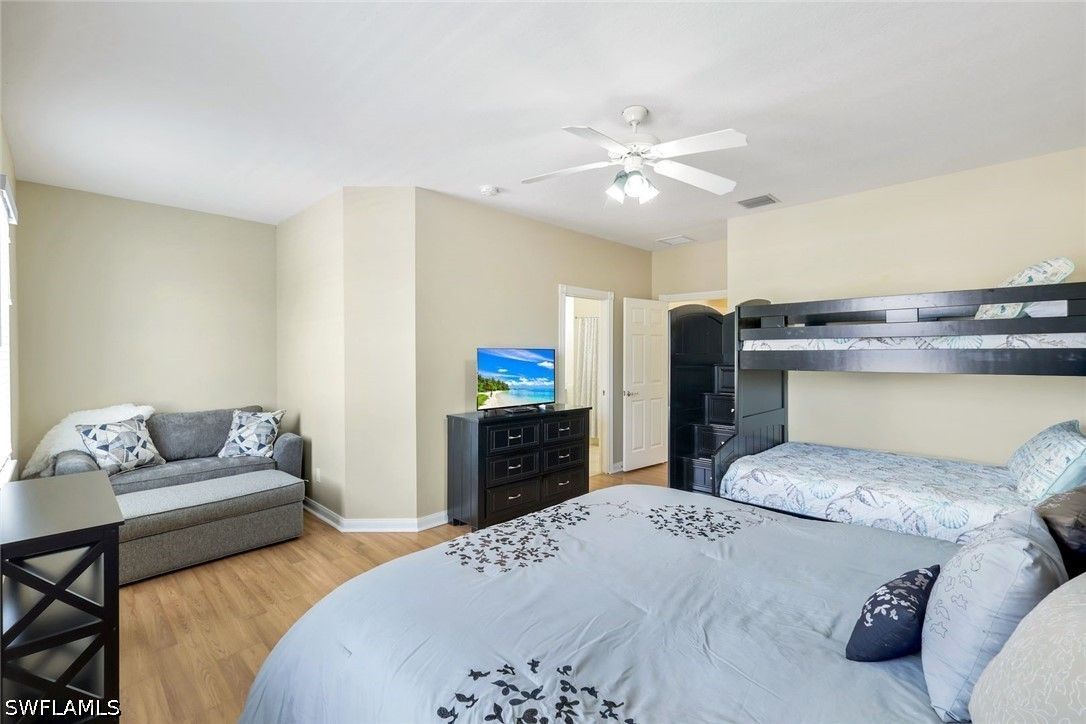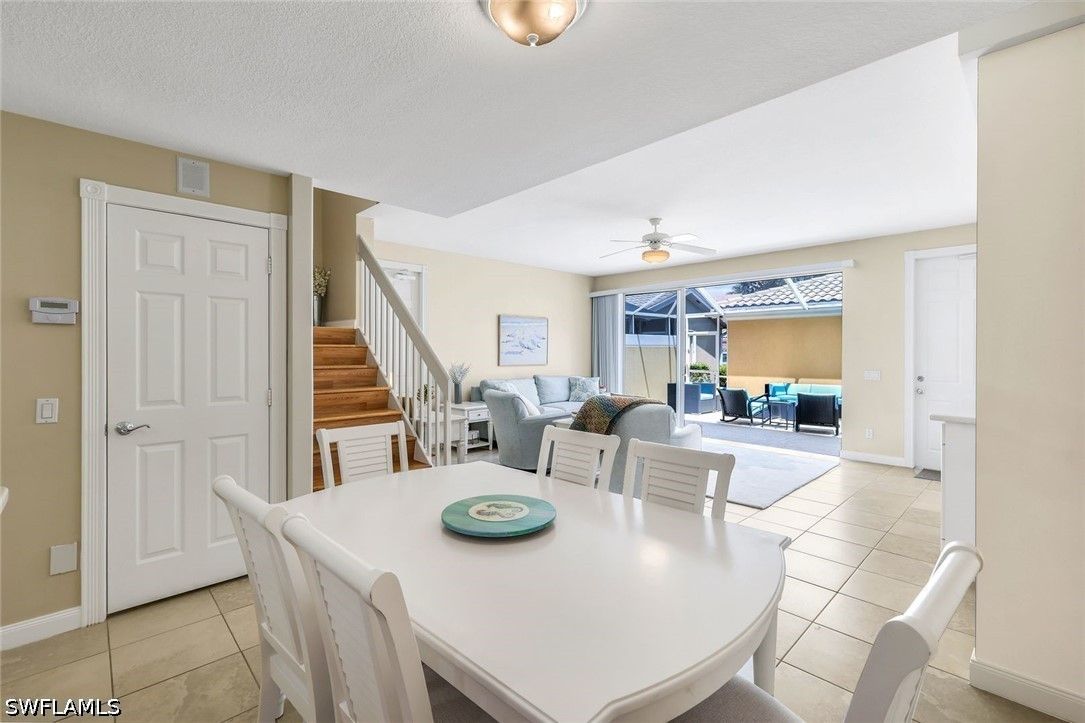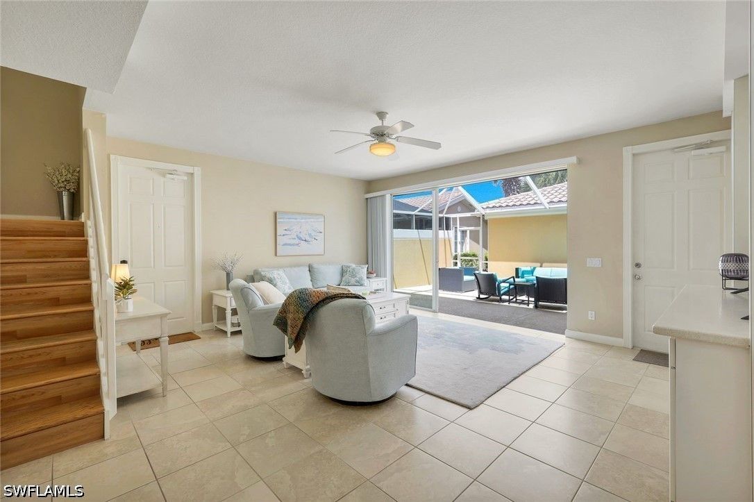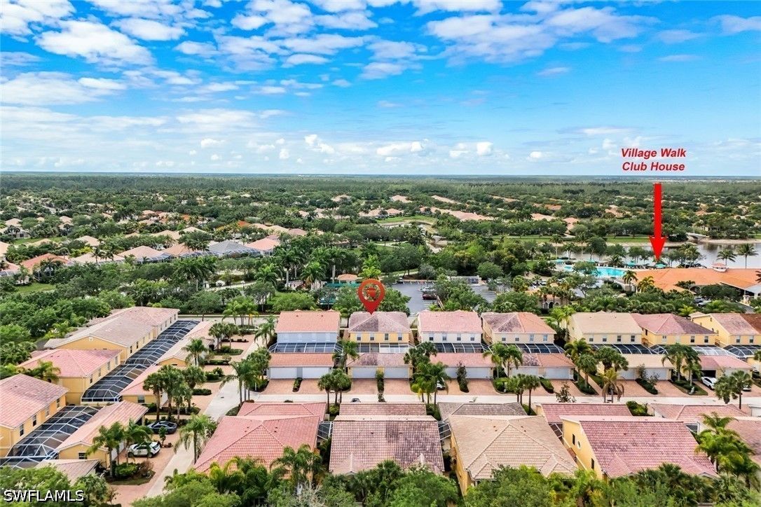Welcome to Village Walk of Bonita Springs, where comfort, convenience, and resort-style living come together in this beautifully maintained turnkey furnished townhome. Featuring light coastal décor and a spacious layout, this home easily accommodates a large family or guests, making it an exceptional value. Offering three bedrooms, three full baths, and a two-car garage, the flexible floor plan is designed for both everyday living and entertaining. The first floor includes a private bedroom suite with a full bath, walk-in closet, and access to a secluded patio—ideal as a primary suite or guest retreat. Tile flooring runs throughout the main level, complemented by a custom built-in wall unit and a spacious screened lanai. The kitchen is tastefully updated with a marble backsplash and enhanced recessed lighting, creating a bright, functional space. Upstairs, a wood-accented staircase leads to two en-suite bedrooms with walk-in closets and wood laminate flooring. One suite features a soaking tub and private balcony overlooking the Town Center, while both baths include walk-in showers. Ideally located near the hub of the community, directly across from the Town Center, residents enjoy immediate access to Village Walk’s exceptional amenities, including a resort-style pool, lap pool, eight Har-Tru tennis courts, fitness center, and convenient on-site services such as a bank, post office, gas station, car wash, park, and restaurant—all within a 24-hour guard-gated community. Located in one of Southwest Florida’s fastest-growing areas, this move-in-ready home offers the perfect blend of lifestyle, location, and value.