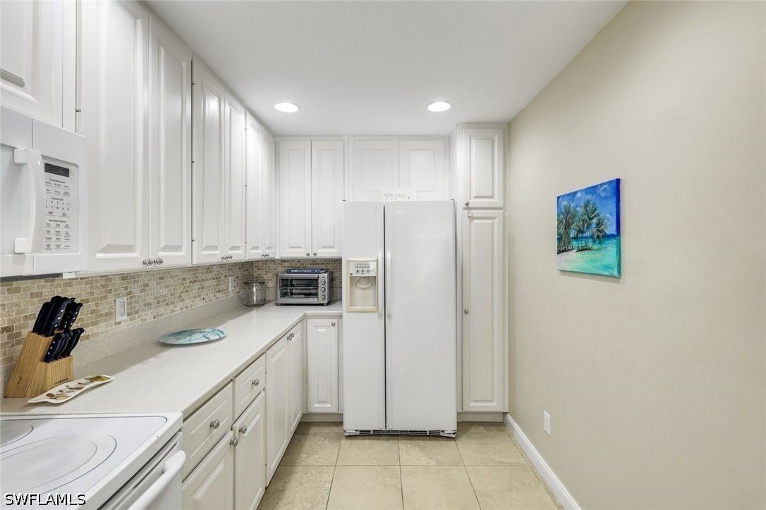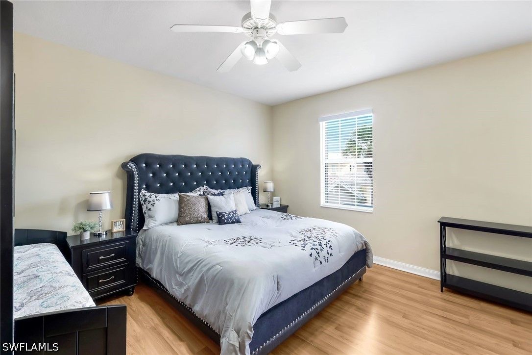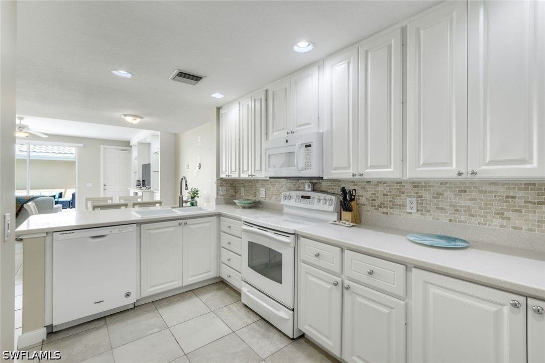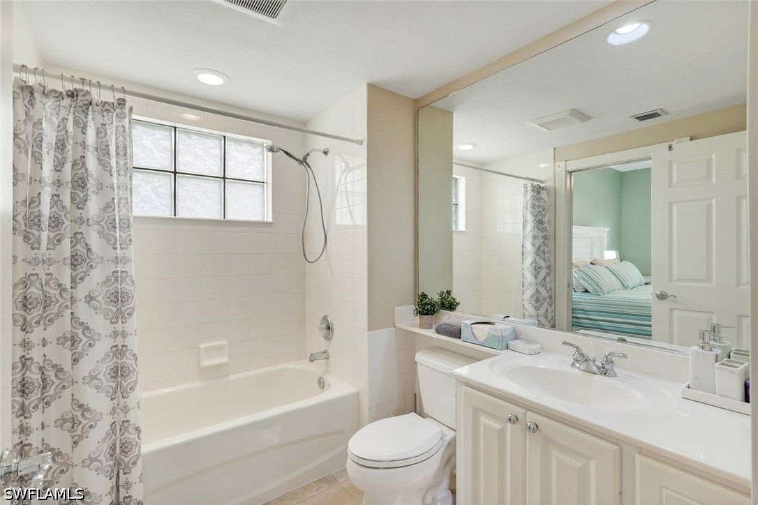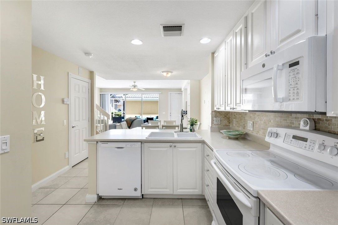 Welcome to Village Walk of Bonita Springs, where comfort, convenience, and resort-style living come together in this beautifully maintained turnkey furnished townhome. Featuring light coastal décor and a spacious layout, this home easily accommodates a large family or guests, making it an exceptional value. Offering three bedrooms, three full baths, and a two-car garage, the flexible floor plan is designed for both everyday living and entertaining. The first floor includes a private bedroom suite with a full bath, walk-in closet, and access to a secluded patio—ideal as a primary suite or guest retreat. Tile flooring runs throughout the main level, complemented by a custom built-in wall unit and a spacious screened lanai. The kitchen is tastefully updated with a marble backsplash and enhanced recessed lighting, creating a bright, functional space. Upstairs, a wood-accented staircase leads to two en-suite bedrooms with walk-in closets and wood laminate flooring. One suite features a soaking tub and private balcony overlooking the Town Center, while both baths include walk-in showers. Ideally located near the hub of the community, directly across from the Town Center, residents enjoy immediate access to Village Walk’s exceptional amenities, including a resort-style pool, lap pool, eight Har-Tru tennis courts, fitness center, and convenient on-site services such as a bank, post office, gas station, car wash, park, and restaurant—all within a 24-hour guard-gated community. Located in one of Southwest Florida’s fastest-growing areas, this move-in-ready home offers the perfect blend of lifestyle, location, and value.