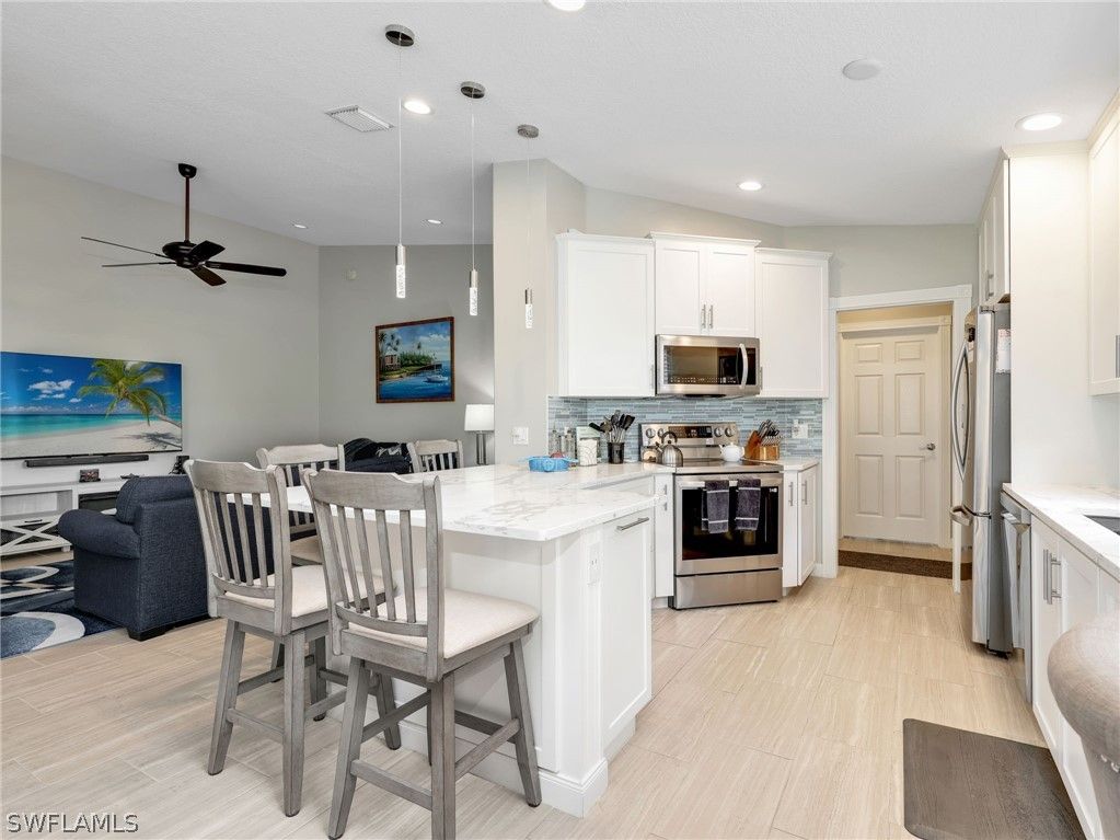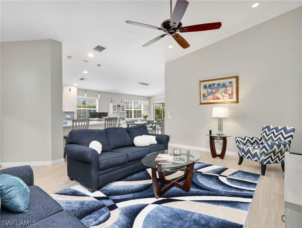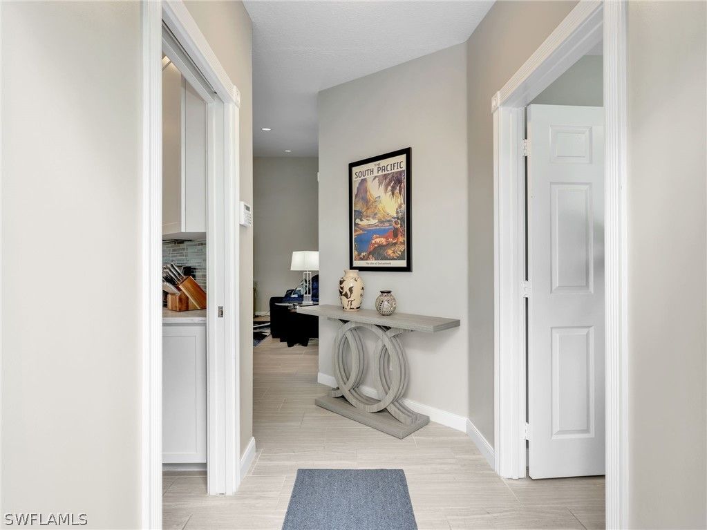 Discover this exceptional Capri villa on a coveted corner homesite, where privacy, lush tropical landscaping, and tranquil lake views create a special offering. Perfectly positioned near the community’s butterfly gardens, this residence delivers the ideal blend of serenity, style, and convenience—making it a must-see opportunity in VillageWalk of Bonita. Thoughtfully updated to appeal to today’s discerning buyers, the home features two spacious primary-sized split bedrooms, two bathrooms, and a two-car attached garage, complemented by a large screened lanai overlooking the peaceful lake—the perfect setting for morning coffee or sunset relaxation. Inside, the home showcases 12” x 24” ceramic tile flooring throughout, creating a clean, contemporary feel. The kitchen has been beautifully refreshed with white shaker cabinetry featuring extensive pull-out storage, custom white quartz countertops, and an expanded counter designed to accommodate a wine cooler or beverage refrigerator. Newer stainless steel appliances complete the space, making it both stylish and functional. Additional upgrades include an updated guest bath with new vanity, countertop, mirror, lighting, and toilet, a new washer and dryer, electric roll-down shades in the great room, electric roll-down hurricane shutters on the lanai, custom designer lighting, and an epoxy garage floor. The primary suite enjoys serene lake views and features a spacious bath with dual sinks and a walk-in shower, creating a private retreat. The guest suite is equally inviting, with a pocket door that transforms the guest bath into a private en-suite, perfect for visiting family or friends. Situated on a quiet, tree-lined street, this home is just a short walk or bike ride to the community’s vibrant Towne Center, where residents enjoy an unmatched lifestyle. VillageWalk offers 24-hour guard-gated security and a remarkable collection of resort-style amenities, including a grand ballroom, card and game rooms, library, catering kitchen, fitness center, group exercise classes, resort and lap pools, tennis, pickleball, basketball, and bocce courts. Unique conveniences include a restaurant and bar with indoor and outdoor seating (no minimums), deli and bagel shop, ice cream parlor, salon, spa, gas station, car wash, ATM, and post office—creating a truly self-contained lifestyle. Residents also enjoy 22 miles of scenic walking and biking trails, 37 charming bridges, and beautifully maintained butterfly gardens. Ideally located near RSW International Airport, medical facilities, top-rated schools, places of worship, pristine Gulf beaches, parks, premier shopping, and exceptional dining, this home captures the relaxed yet vibrant lifestyle that makes Bonita Springs one of Southwest Florida’s most desirable destinations. If you’ve been waiting for the perfect Capri in VillageWalk, this beautifully updated lakefront corner residence is one you won’t want to miss.