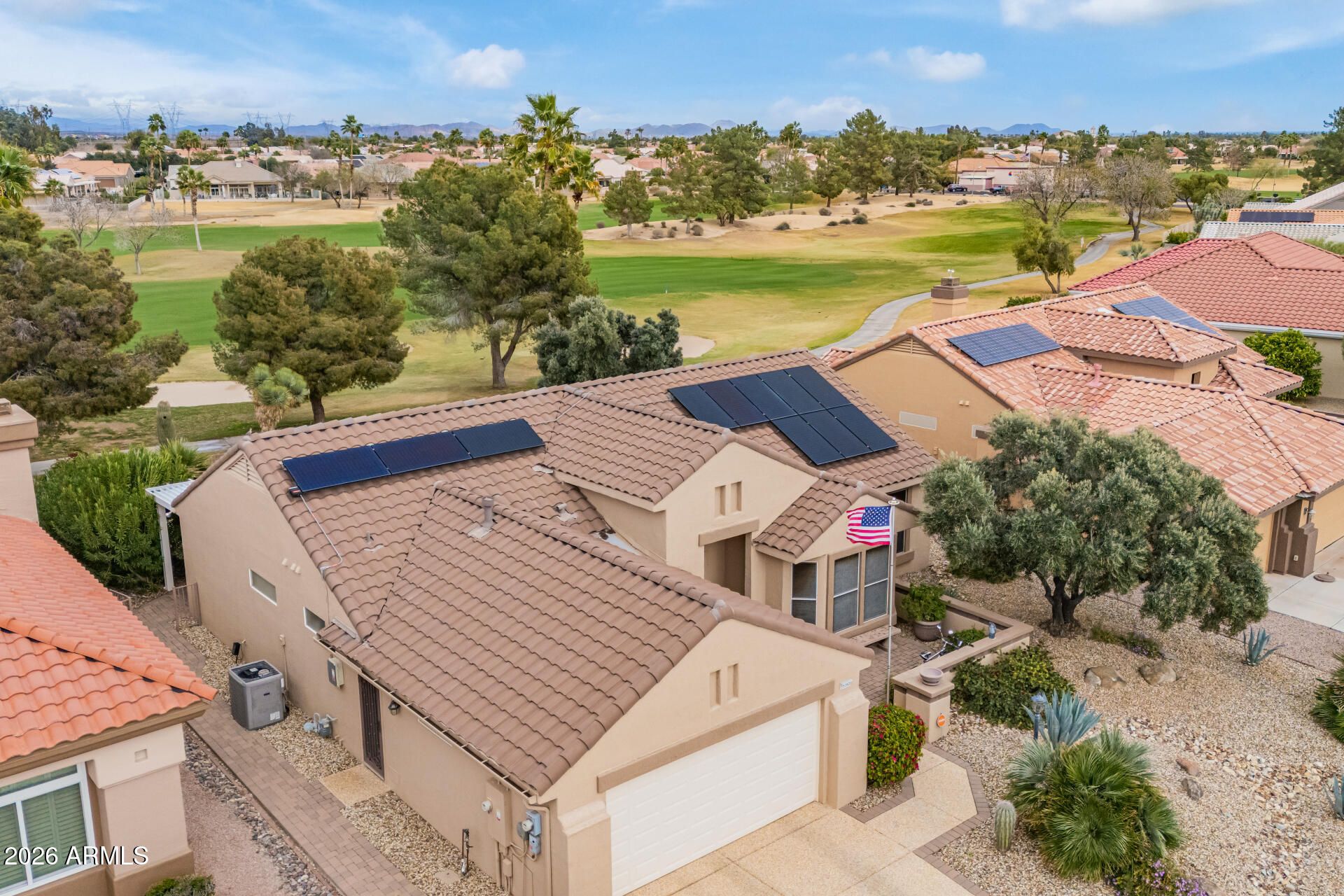 Golf course living at its finest in the desirable Prescott model! Enjoy double fairway views of holes 9 and 10 on Desert Trails Golf Course from the extended northeast-facing patio. This 2 BR 2 BA home with a den features brand new tile flooring throughout, a kitchen with maple soft-closing cabinetry, granite countertops, gas cooktop, and expanded pantry. Built-in bookshelves and a desk in the den add functionality. The primary suite includes a bay window, and plantation shutters with custom window treatments. Solar panels provide exceptional efficiency and can generate negative electric bills. Additional highlights include a 2017 roof, soft water and R/O system, insulated garage door, EV charging station, and fenced backyard. Move-in ready with incredible golf course views!