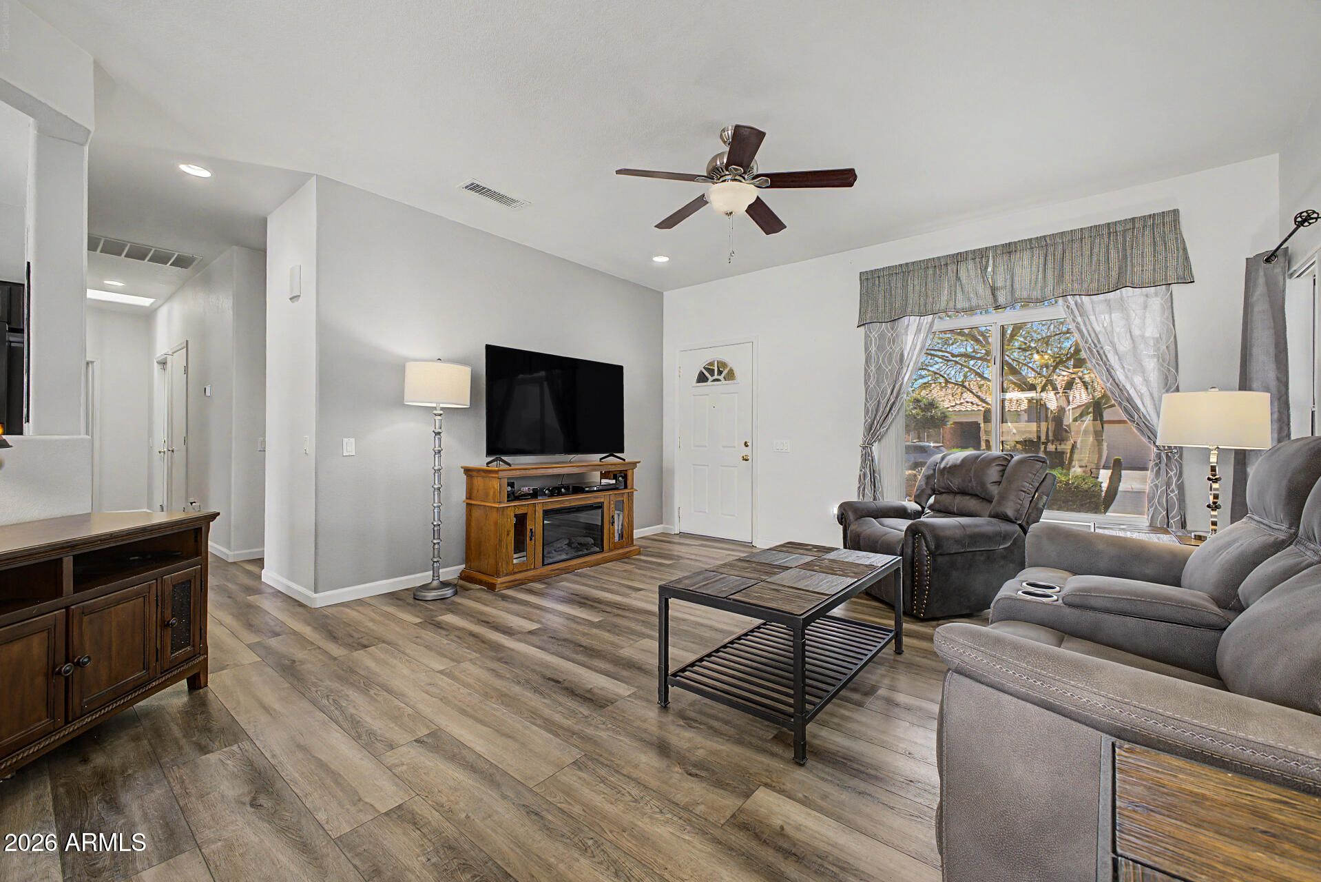Welcome to easy, low-maintenance living in the highly sought-after 55+ community of Sun City West! This beautifully updated 2-bedroom, 2-bathroom single family home offers the perfect blend of comfort, style & peace of mind, all in a thoughtfully designed 1084 s.f. floor plan. Step inside to find new luxury vinyl plank flooring through main living areas, creating a clean, modern feel from the moment you walk in. The light & bright kitchen features quartz countertops, stainless steel appliances, & a convenient breakfast bar, perfect for casual dining or entertaining. Enjoy major system updates that make this home truly move-in ready, including a 2026 HVAC system & water heater, plus a 2020 roof with a 20-year transferrable warranty which will give you peace of mind for years to come