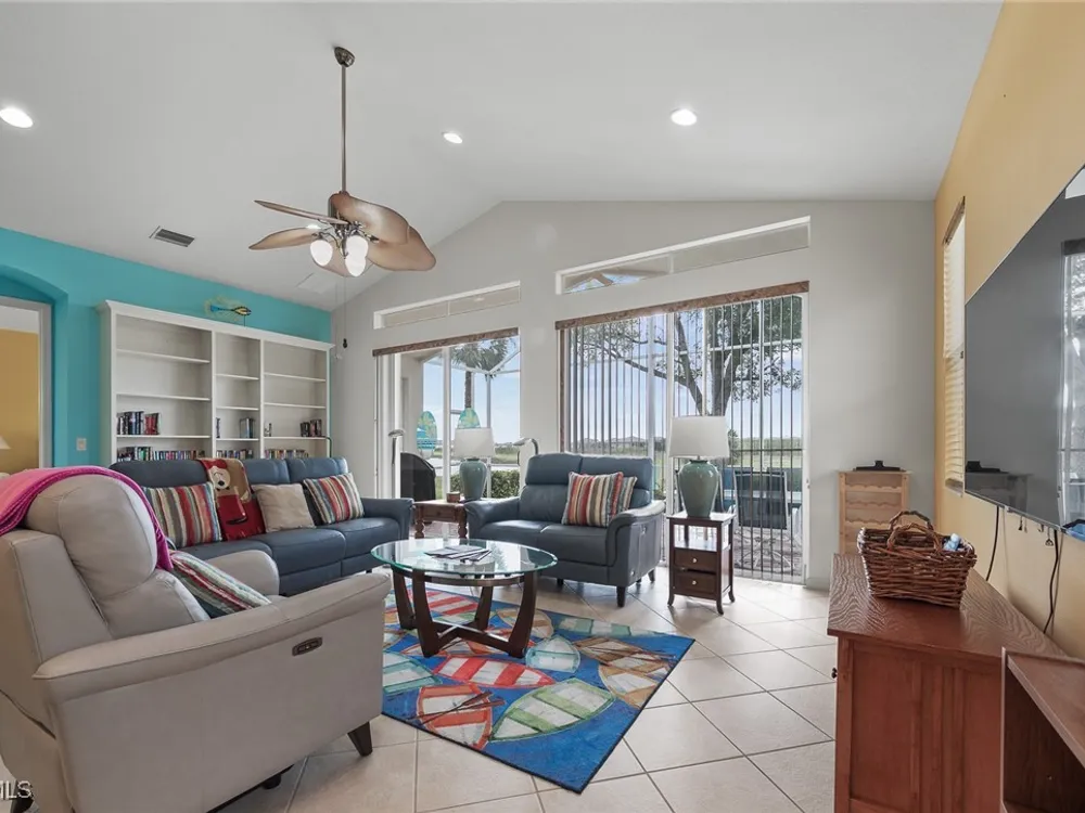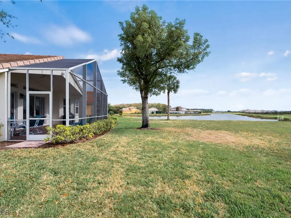 Why pay high rent prices for the season when you can own this beautiful home! Florida living at its finest in this delightful spacious 2 bedroom with den TURNKEY home. Walk right in and start enjoying your time in the sought after 55 + community of Cascades at River Hall. This home was built by Levitt and Sons with impact resistant doors and windows and vaulted ceilings! The seller has added some lovely custom cabinetry to the dining and living space. New AC 2024, no flooding...The home has been extremely well kept and the happy Florida colors set the mood for your future lifestyle. There are approximately $40,000 in furnishings (furniture, carpets, blinds, shades, built-ins (dining room buffet, large bookcase), large television, lanai furniture and BBQ, etc... included with this charming home! The lovely extended lanai over looks a large landscaped area and a lake. Cascades offers resort-style amenities and an active social atmosphere, with LOW monthly HOA which covers all your lawn care needs, full cable and internet, beautiful clubhouse with community pool/spa, fitness center, Bocce, Pickle ball and Tennis courts!