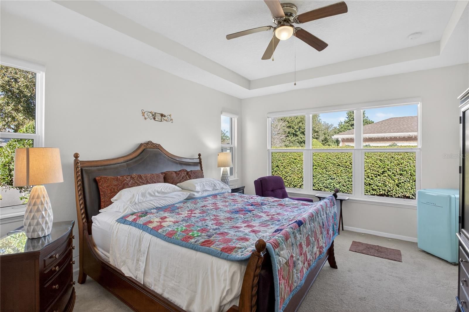 - Ceiling Fan(s), Eat-in Kitchen, High Ceilings, Kitchen/Family Room Combo, Living/Dining Room, Open Floorplan, Main Level Primary, Tray Ceiling(s), Walk-In Closet(s), Window Treatments