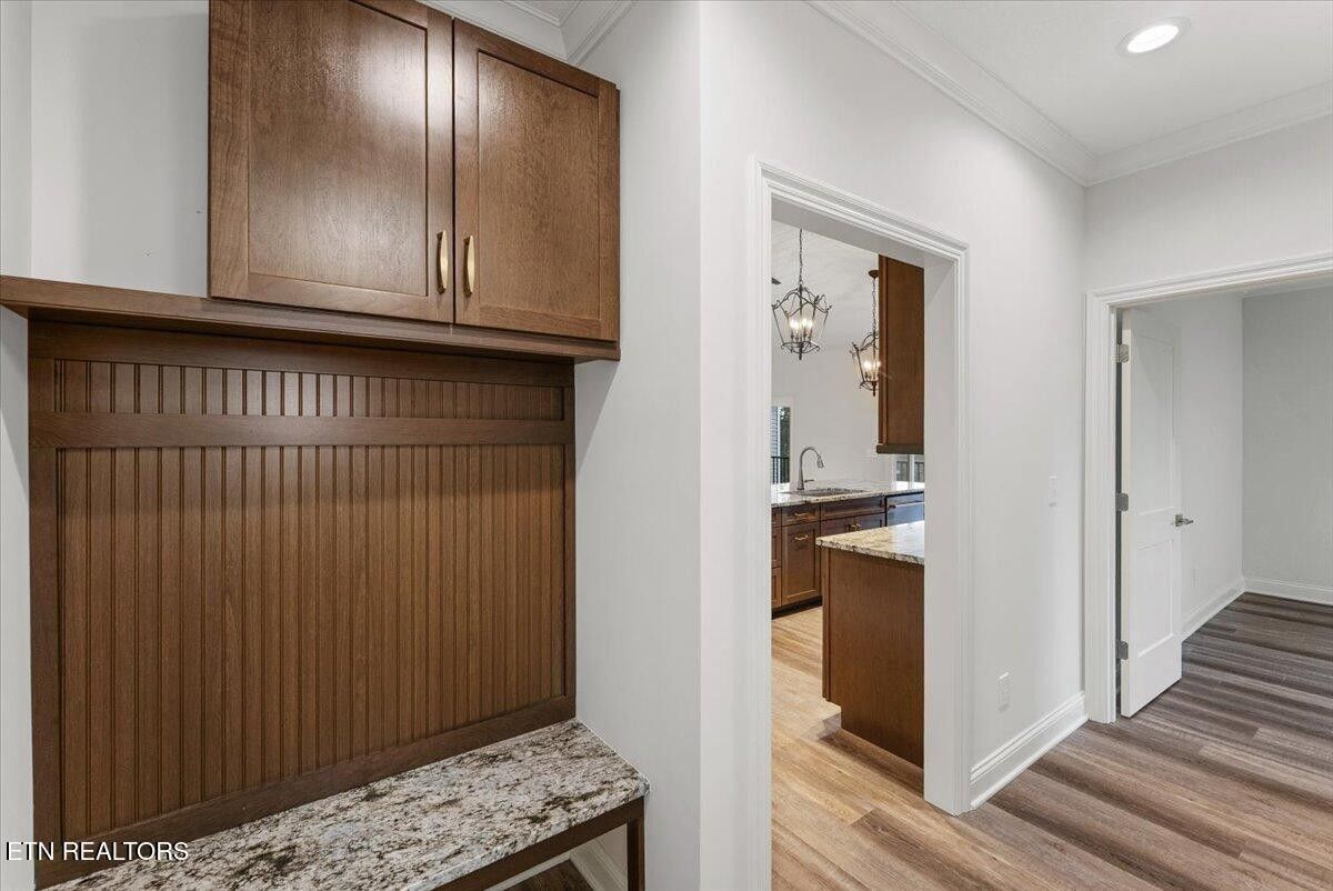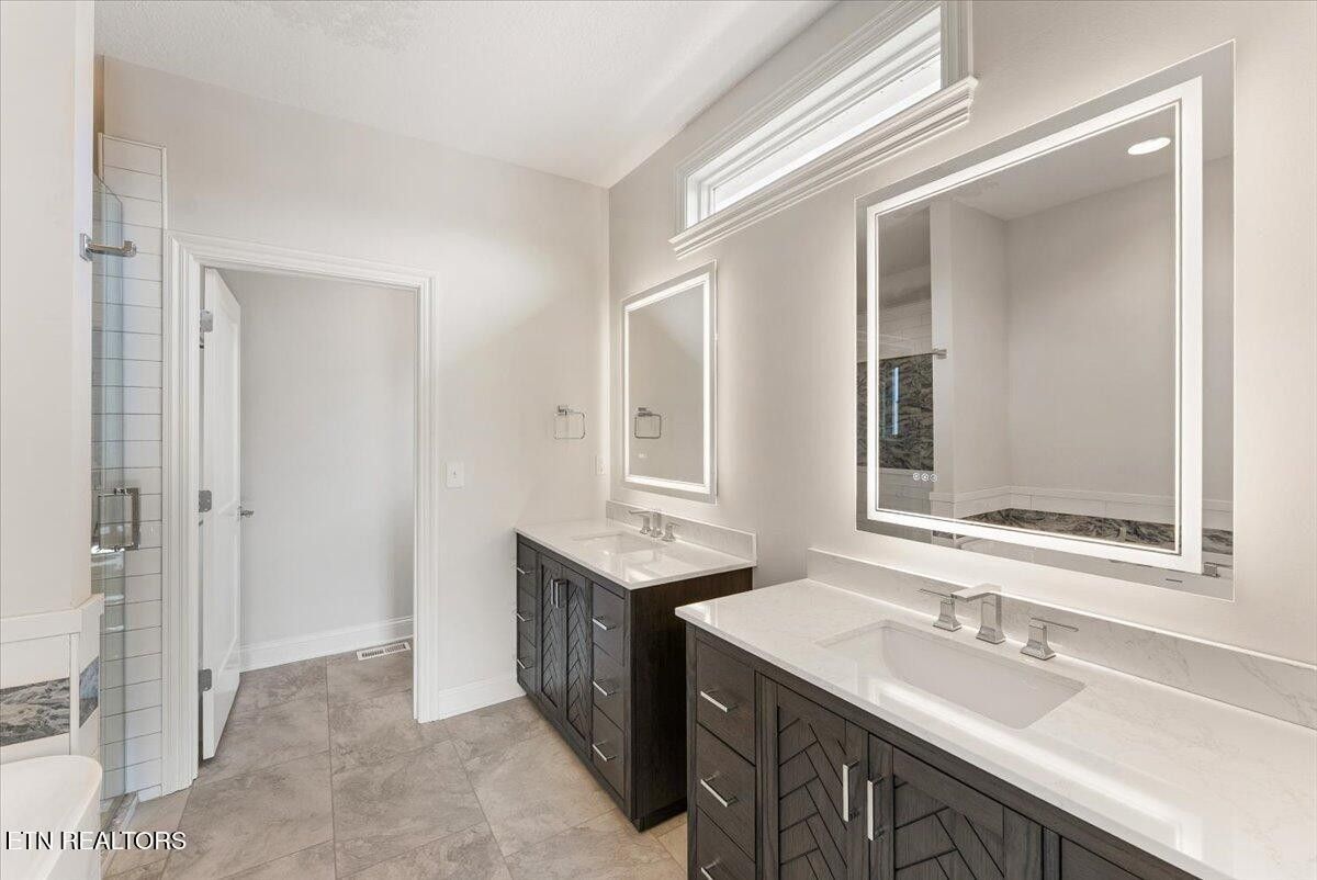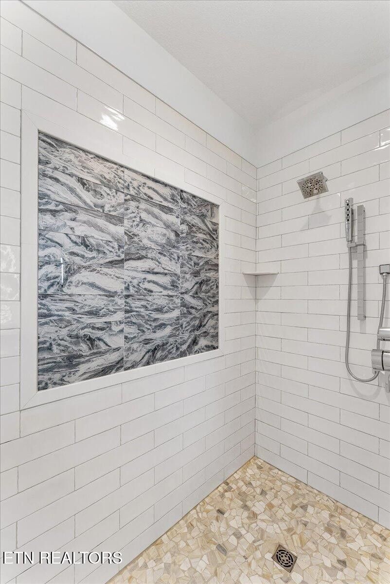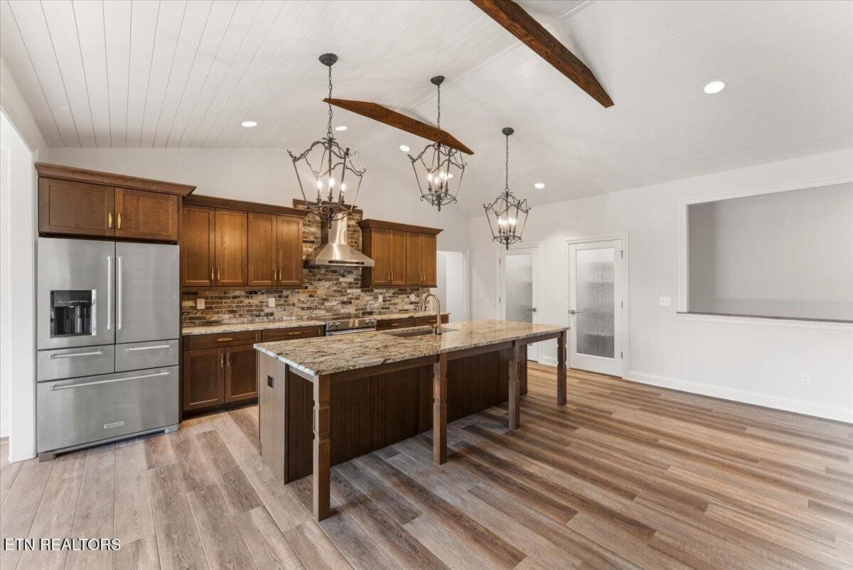 This exceptional new construction showcases the signature craftsmanship of Fred Hans, a long-standing and highly respected custom home builder in Tellico Village for decades. Known for thoughtful design, enduring quality, and attention to detail, his homes are recognized for blending functionality with refined architectural presence. Uniquely designed with a one-of-a-kind floor plan, the home welcomes you through a dramatic foyer featuring double 8' glass doors, intentionally separating the entry from the expansive vaulted great room and kitchen beyond. Inside, you're immediately drawn into a stunning open-concept great room and kitchen highlighted by vaulted shiplap ceilings, abundant natural light, and elevated finishes throughout. The great room opens through 4 panel sliding doors to a maintenance-free screened deck, ideal for year-round enjoyment. The spacious dining area—also accented with shiplap ceilings—features two additional sliding doors leading to a second maintenance-free covered deck with an exterior staircase to the backyard, offering seamless indoor-outdoor living and entertaining. The kitchen is as functional as it is beautiful, featuring granite countertops, upgraded KitchenAid appliances, a brick backsplash, and an oversized island with decorative posts that comfortably seats 6. Custom cherry cabinetry and two separate pantries with rain-glass doors complete this well-appointed space. The thoughtfully planned main level includes two large guest bedrooms with oversized closets, privately positioned away from the primary suite. The luxury primary retreat features two walk-in closets and a spa-inspired bath with a custom tiled walk-in shower with glass door, dual free-standing vanities with granite countertops and lighted mirrors, a dramatic vessel soaking tub, and a private water closet. The home features custom tiled walk-in showers with glass doors and upgraded flooring in all bathrooms.