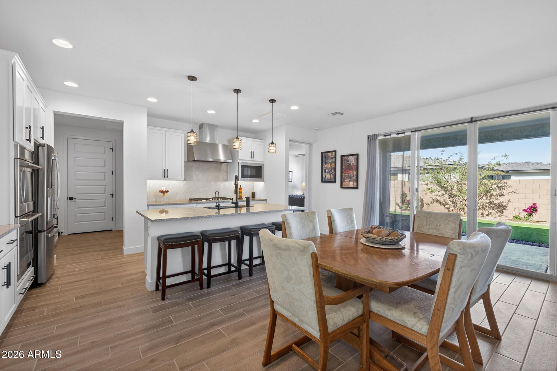 Located in Queen Creek's sought-after 55-plus Ovation at Meridian community, this like-new home blends modern comfort with an easy, low-maintenance lifestyle ideal for active adults. The thoughtfully designed floor plan offers 2 bedrooms plus a den and 2.5 baths in 1811 SqFt, with an open great room layout perfect for entertaining and a split bedroom design that ensures privacy for guests. The gourmet kitchen stands out with Peterson 5-piece 42-inch cabinets, under-cabinet lighting, soft-close drawers, pull-out shelves, a pots and pans drawer, recycle center, upgraded GE appliances including a gas cooktop with double ovens, granite countertops, custom tile backsplash, an island with e-granite sink, motion sensor faucet, breakfast bar, and pendant lighting. Center-meet sliding glass doors open to a full-length covered patio with epoxy flooring, gas stub for a BBQ, and a low-maintenance backyard featuring artificial turf and desert landscaping. The primary suite includes direct access to the laundry room and an en-suite bath with an extended dual-sink vanity with makeup area and an oversized tiled shower with bench seat and glass surround. The guest bedroom also has an en-suite bath. Additional upgrades include 8-foot interior doors, ceiling fans, a Kinetico water softener system, tankless water heater, ADT security system, upgraded plank tile flooring in living areas and baths, plush carpet in bedrooms, an enhanced exterior elevation, and a 2-car garage with shelving and epoxy floors. Ovation at Meridian is a gated 55-plus community offering resort-style amenities designed for an active lifestyle, including a clubhouse and recreation center with a fitness facility, arts and crafts room, lounge areas, billiards room, and outdoor features such as a heated pool and spa, pickleball, tennis and bocce courts, a putting and chipping area, and miles of walking trails throughout the neighborhood.