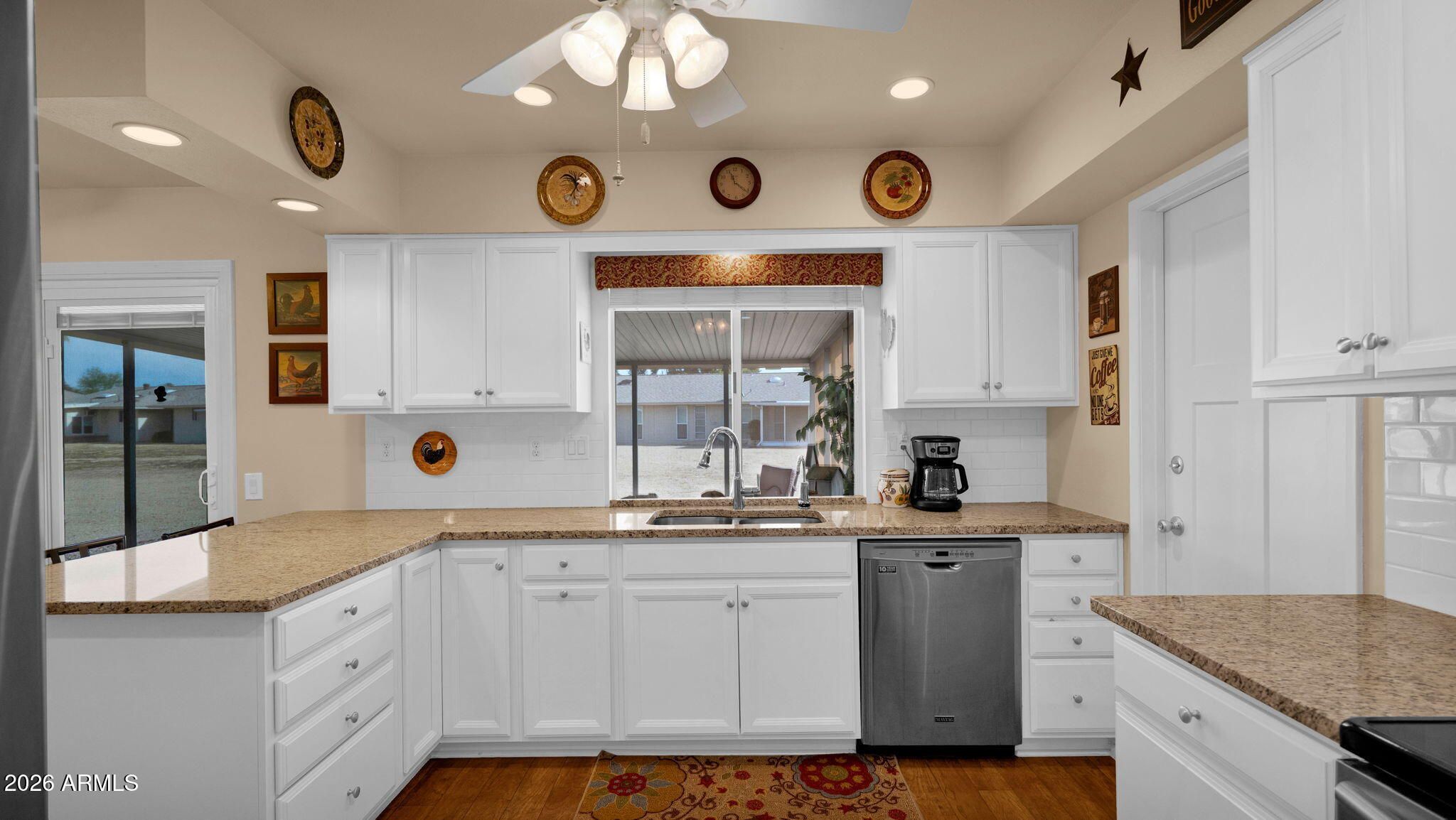 Enjoy easy living in this beautifully updated duplex home in the heart of Sun City's desirable 55+ community. The remodeled kitchen features granite countertops and stainless steel appliances, while wood laminate flooring adds warmth and durability throughout. New windows enhance comfort and energy efficiency. Both bedrooms are generously sized, and the updated bathrooms include granite countertops. Relax year-round in the large screened-in porch—ideal for morning coffee or evening gatherings. Additional upgrades include new interior and exterior doors and a 1.5-car garage with space for a golf cart. Move-in ready and designed for low-maintenance living. Furnishings are available for purchase on a separate bill of sale.
