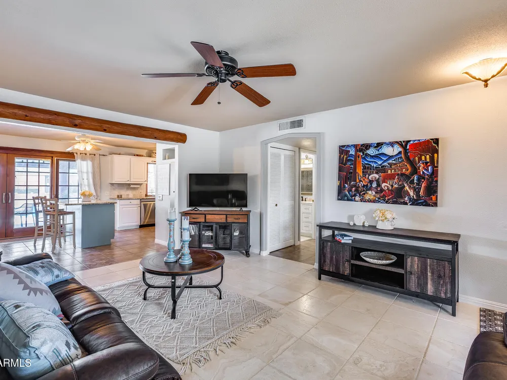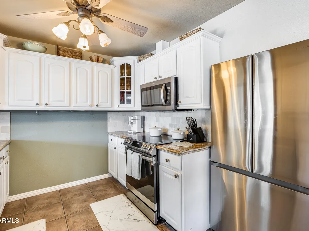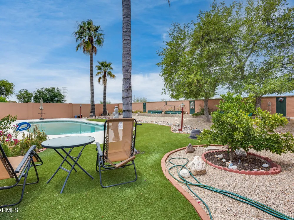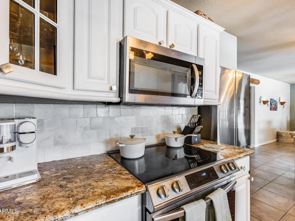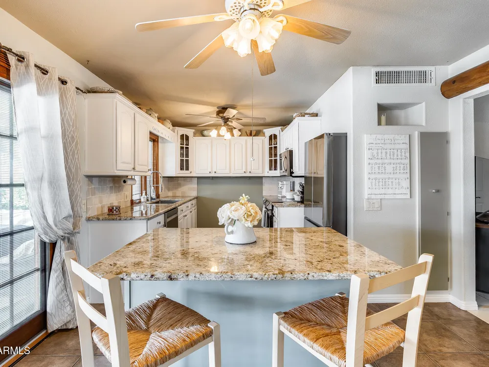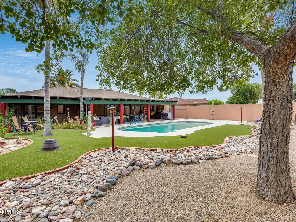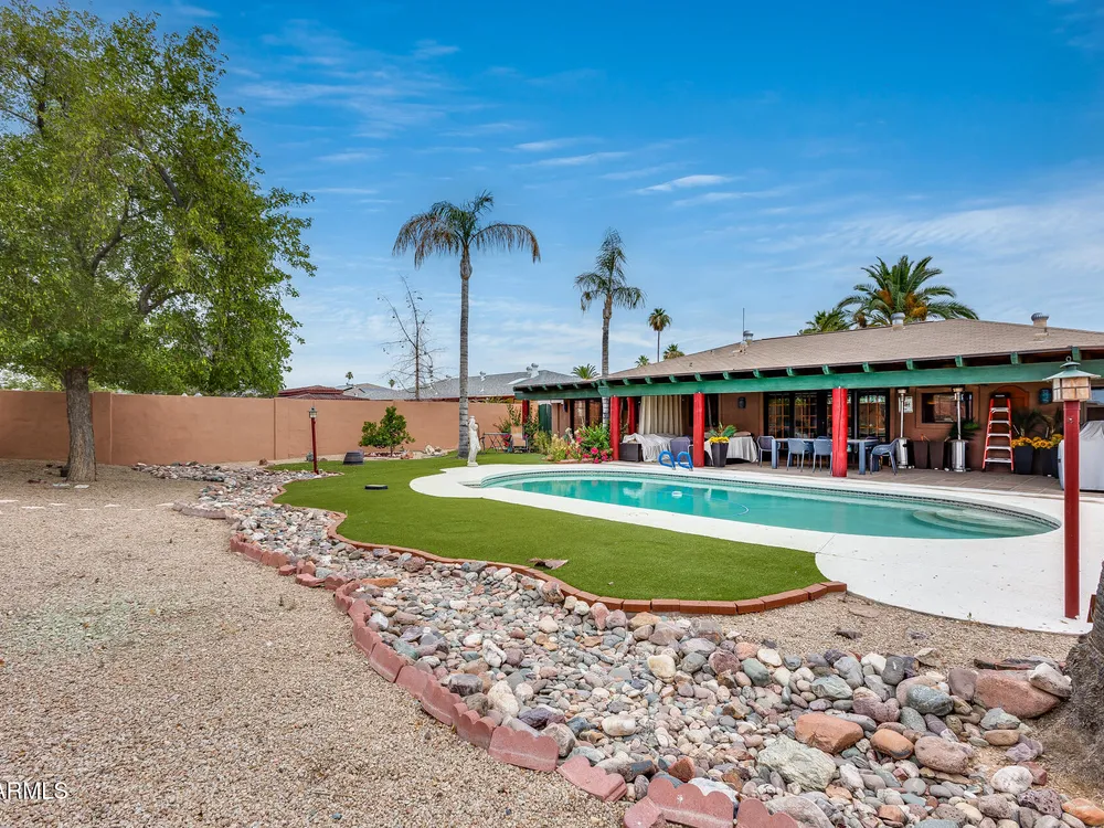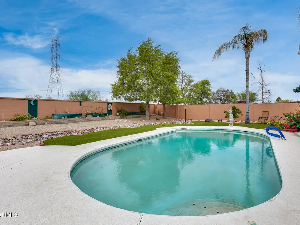 Welcome to this beautifully maintained and tastefully updated 3-bedroom, 2-bath home located in a quiet and desirable community. This property is being sold fully furnished and comes with a tenant already in place, making it an excellent investment opportunity or turnkey purchase for those seeking a ready-to-enjoy Arizona retreat. Step inside to find a bright, inviting living space featuring neutral tile flooring, fresh paint, and modern finishes throughout. The spacious open floor plan seamlessly connects the living, dining, and kitchen areas—perfect for relaxing or entertaining. The kitchen has been thoughtfully updated with granite countertops, white cabinetry, and stainless-steel appliances, offering both style and functionality. Each bedroom is generously sized, with the primary suite featuring a private bath and plenty of natural light. Both bathrooms are well-appointed, maintaining a charming blend of comfort and character. French doors lead to a huge covered patio with Saltillo tile that runs the full length of the home. This outdoor space is ideal for entertaining or unwinding year-round. The diving pool (plumbed for a salt water chlorinator), built-in outdoor shower, and lush artificial turf complete the beautiful, very private backyard with no rear neighbors.