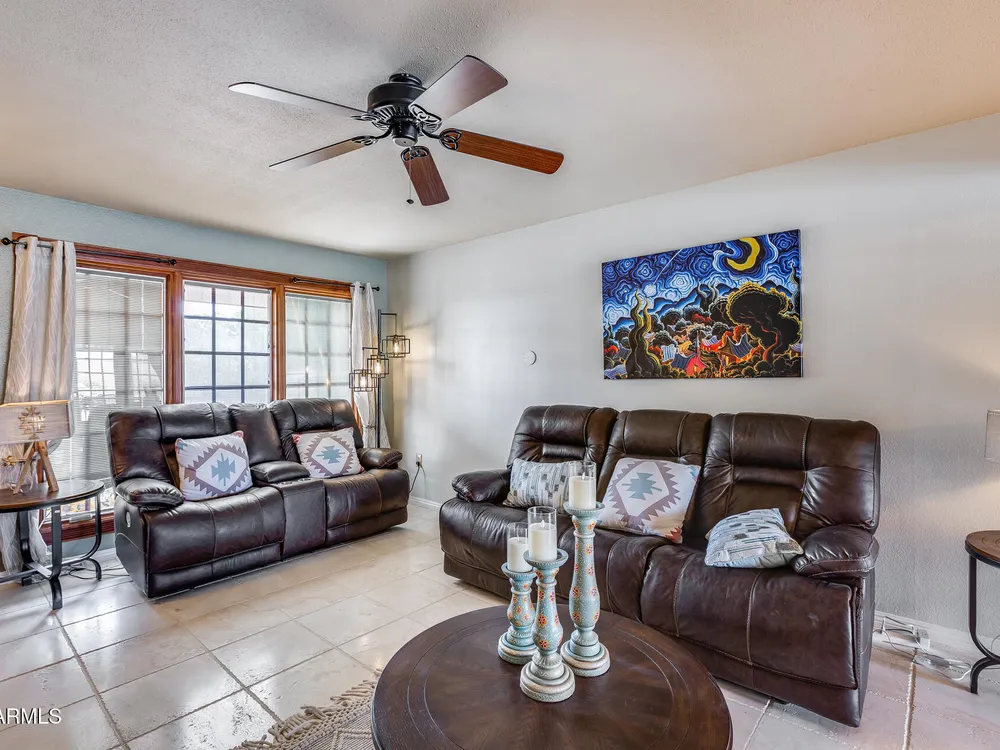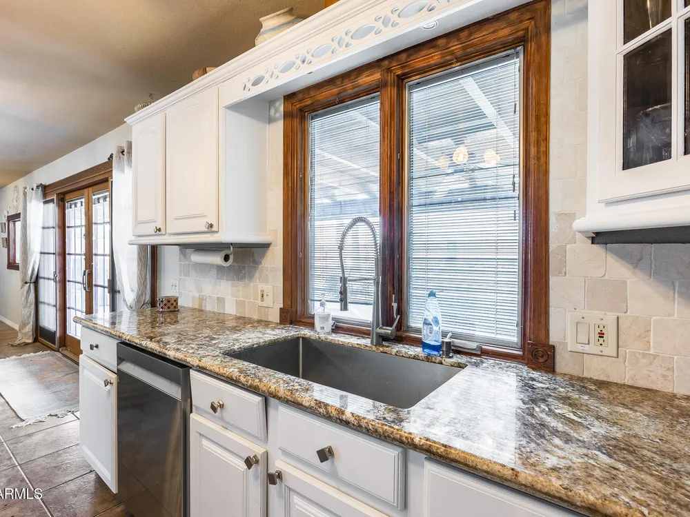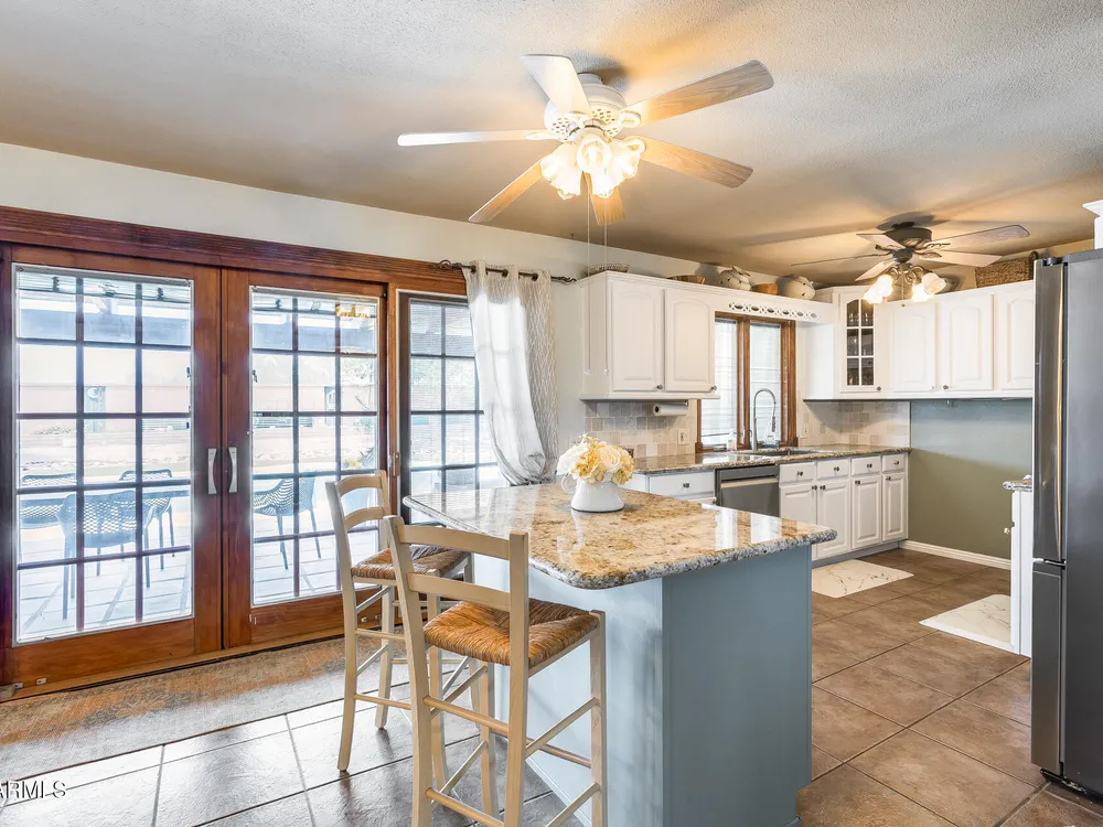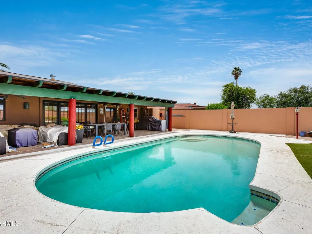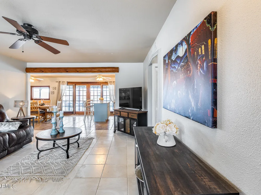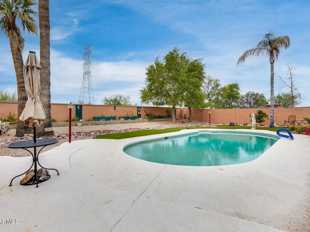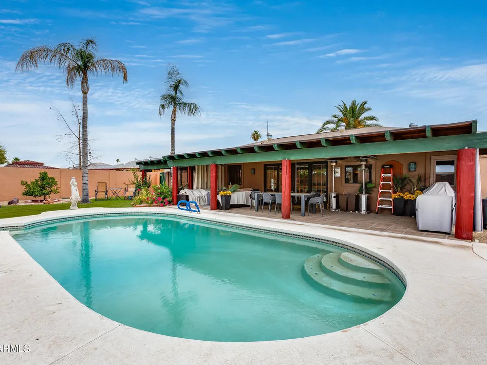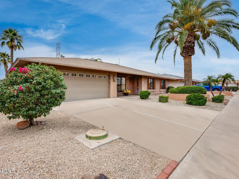 Welcome to this beautifully maintained and tastefully updated 3-bedroom, 2-bath home located in a quiet and desirable community. This property is being sold fully furnished and comes with a tenant already in place, making it an excellent investment opportunity or turnkey purchase for those seeking a ready-to-enjoy Arizona retreat. Step inside to find a bright, inviting living space featuring neutral tile flooring, fresh paint, and modern finishes throughout. The spacious open floor plan seamlessly connects the living, dining, and kitchen areas—perfect for relaxing or entertaining. The kitchen has been thoughtfully updated with granite countertops, white cabinetry, and stainless-steel appliances, offering both style and functionality. Each bedroom is generously sized, with the primary suite featuring a private bath and plenty of natural light. Both bathrooms are well-appointed, maintaining a charming blend of comfort and character. French doors lead to a huge covered patio with Saltillo tile that runs the full length of the home. This outdoor space is ideal for entertaining or unwinding year-round. The diving pool (plumbed for a salt water chlorinator), built-in outdoor shower, and lush artificial turf complete the beautiful, very private backyard with no rear neighbors.