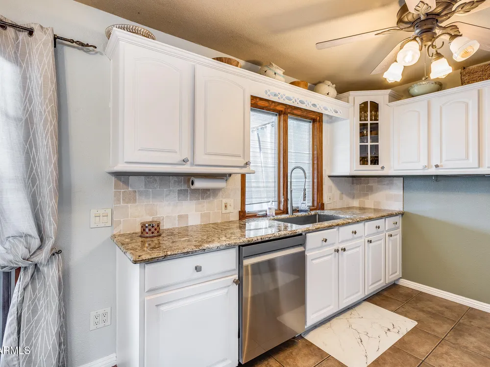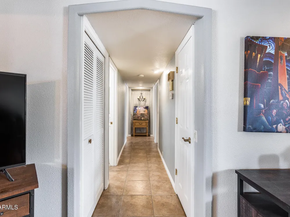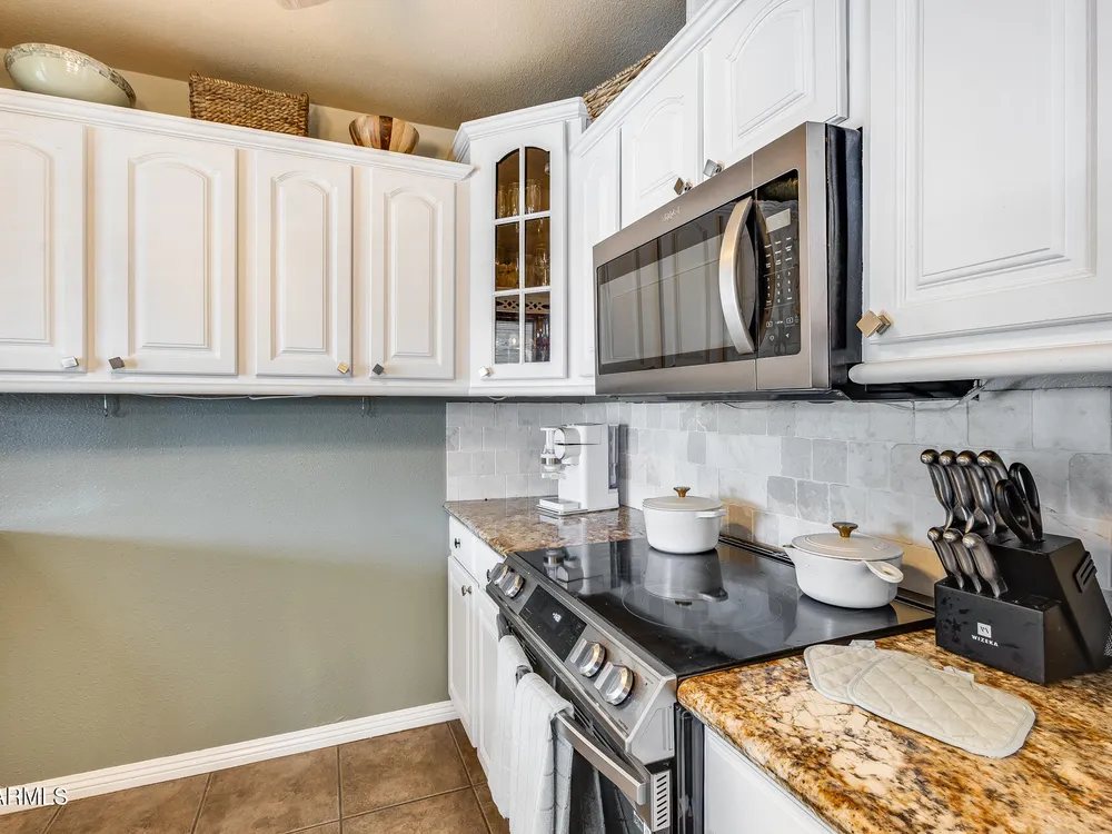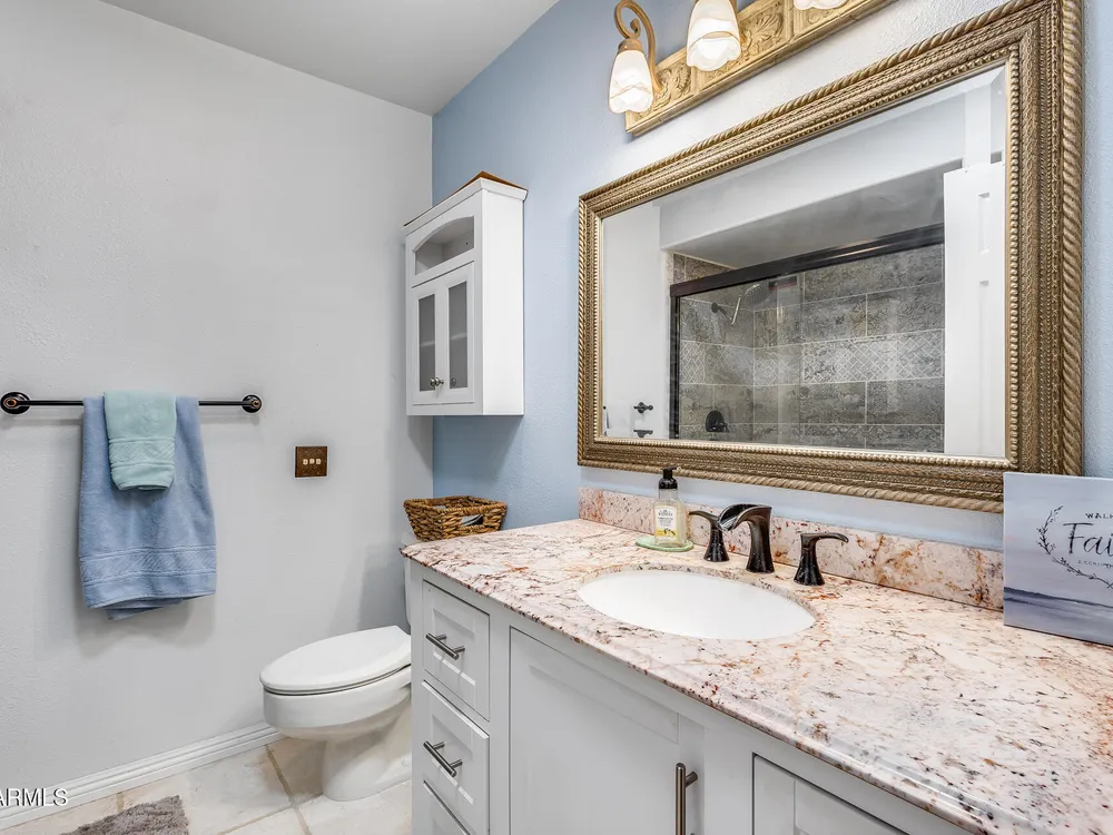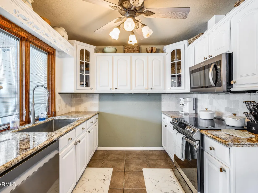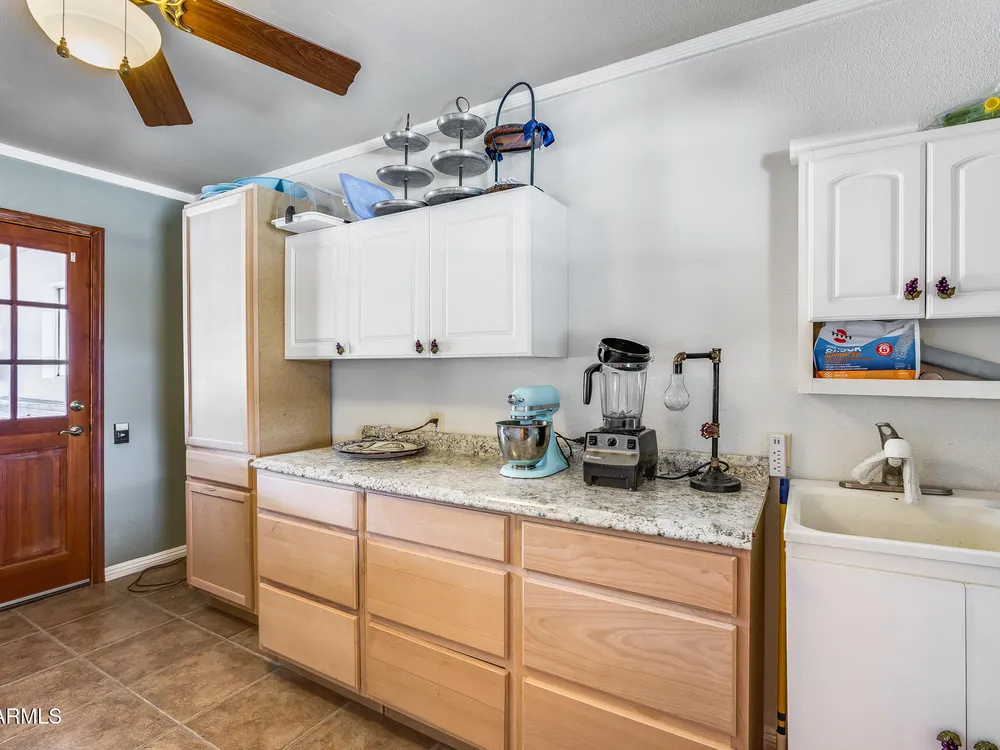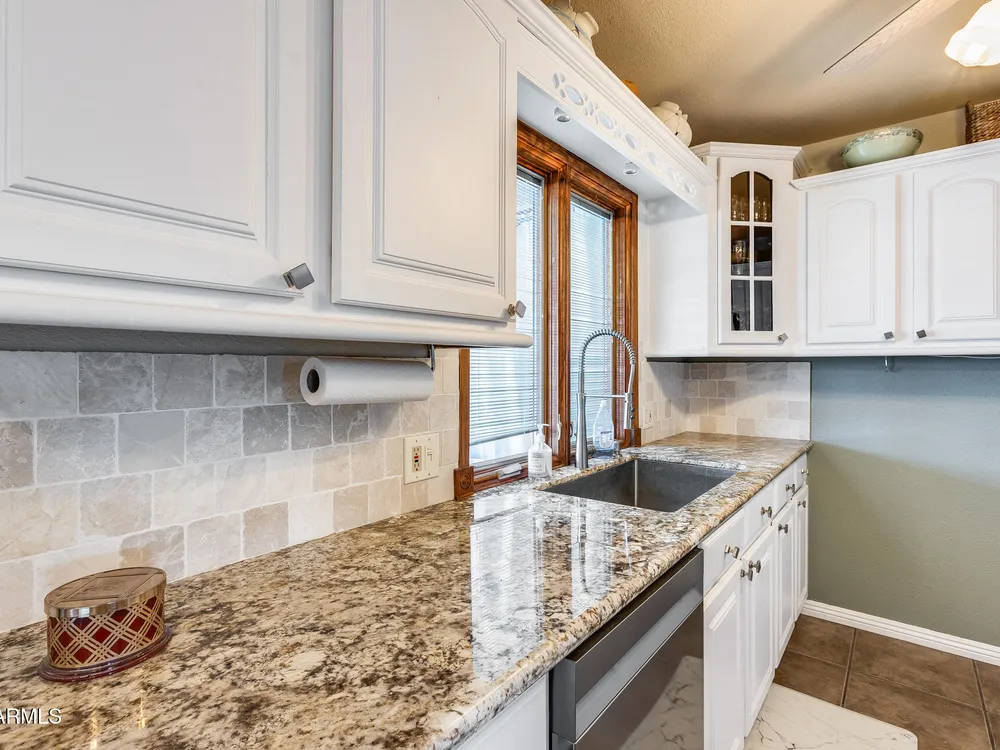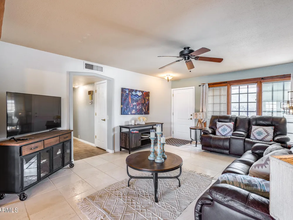 Welcome to this beautifully maintained and tastefully updated 3-bedroom, 2-bath home located in a quiet and desirable community. This property is being sold fully furnished and comes with a tenant already in place, making it an excellent investment opportunity or turnkey purchase for those seeking a ready-to-enjoy Arizona retreat. Step inside to find a bright, inviting living space featuring neutral tile flooring, fresh paint, and modern finishes throughout. The spacious open floor plan seamlessly connects the living, dining, and kitchen areas—perfect for relaxing or entertaining. The kitchen has been thoughtfully updated with granite countertops, white cabinetry, and stainless-steel appliances, offering both style and functionality. Each bedroom is generously sized, with the primary suite featuring a private bath and plenty of natural light. Both bathrooms are well-appointed, maintaining a charming blend of comfort and character. French doors lead to a huge covered patio with Saltillo tile that runs the full length of the home. This outdoor space is ideal for entertaining or unwinding year-round. The diving pool (plumbed for a salt water chlorinator), built-in outdoor shower, and lush artificial turf complete the beautiful, very private backyard with no rear neighbors.