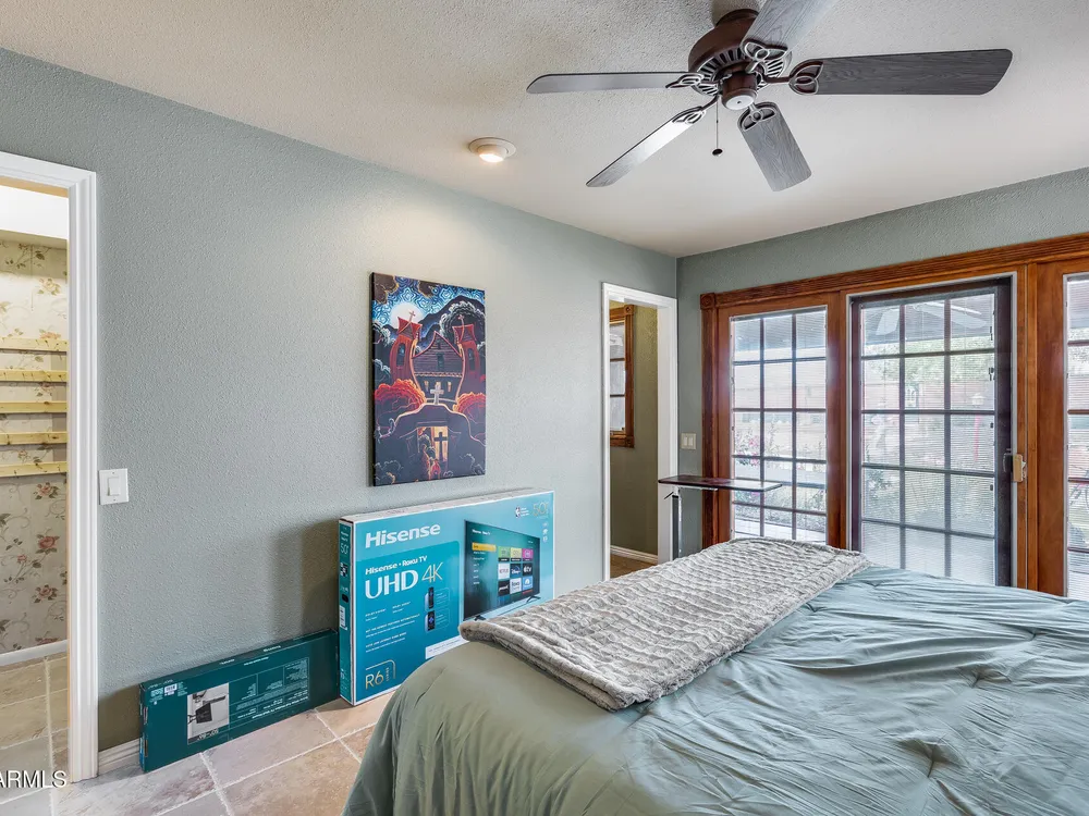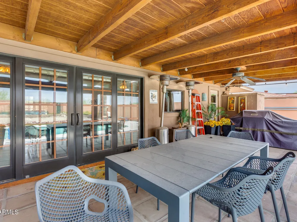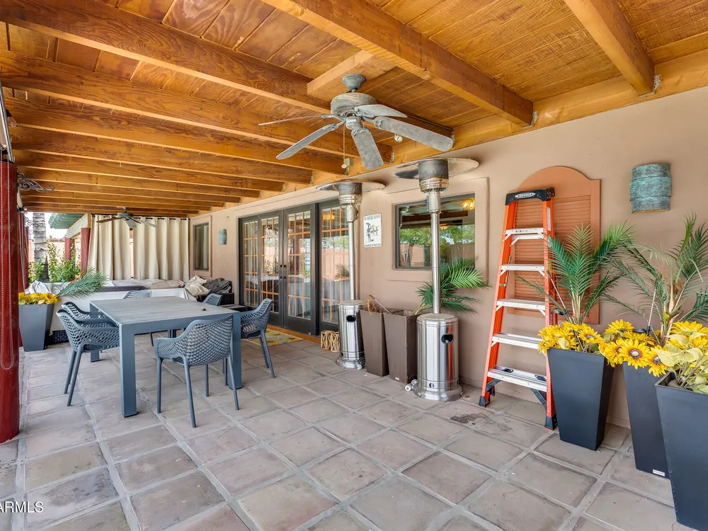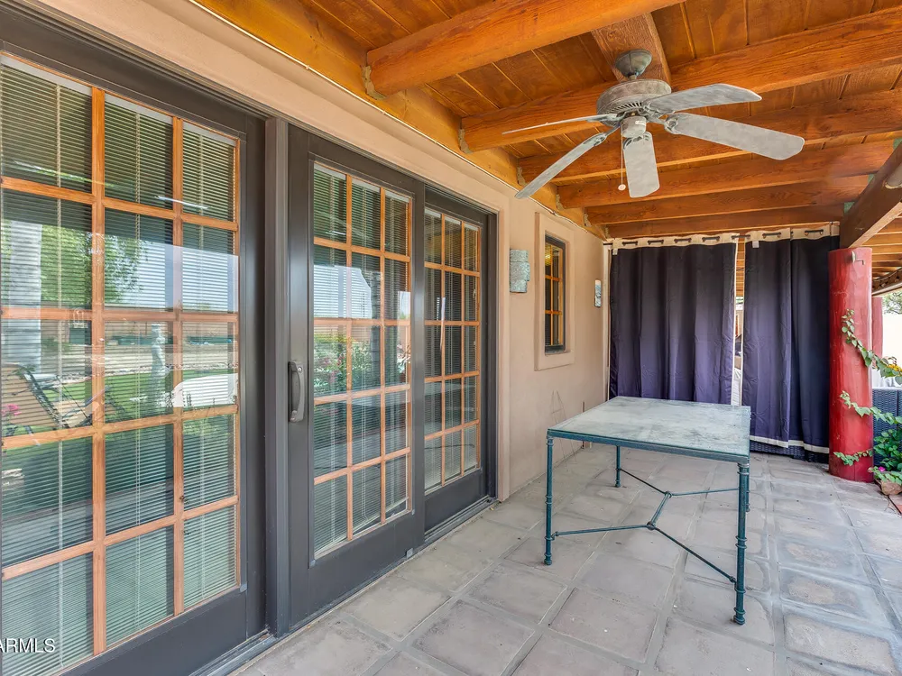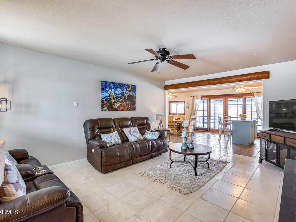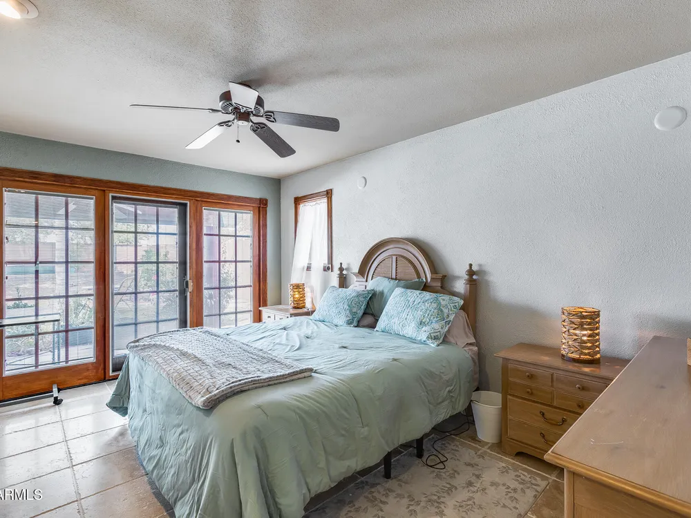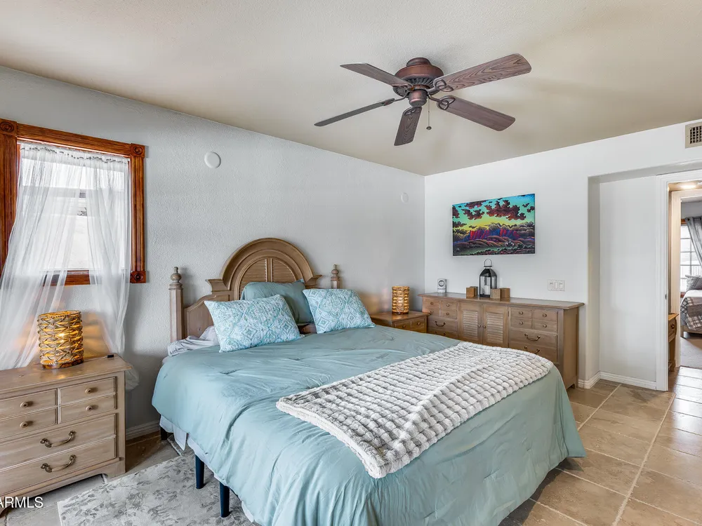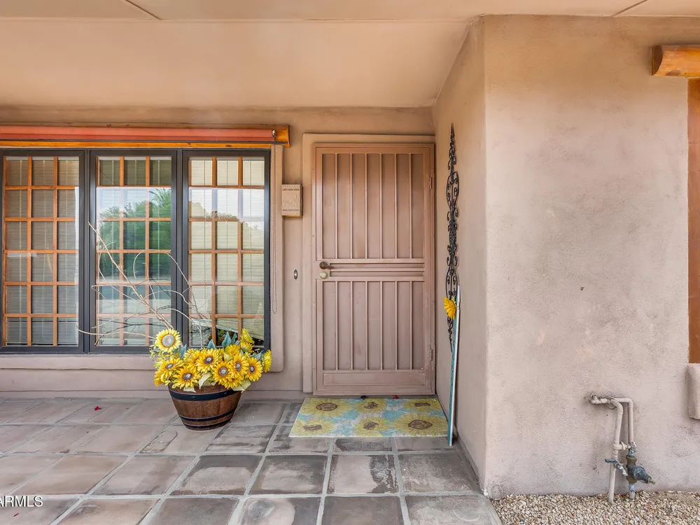 Welcome to this beautifully maintained and tastefully updated 3-bedroom, 2-bath home located in a quiet and desirable community. This property is being sold fully furnished and comes with a tenant already in place, making it an excellent investment opportunity or turnkey purchase for those seeking a ready-to-enjoy Arizona retreat. Step inside to find a bright, inviting living space featuring neutral tile flooring, fresh paint, and modern finishes throughout. The spacious open floor plan seamlessly connects the living, dining, and kitchen areas—perfect for relaxing or entertaining. The kitchen has been thoughtfully updated with granite countertops, white cabinetry, and stainless-steel appliances, offering both style and functionality. Each bedroom is generously sized, with the primary suite featuring a private bath and plenty of natural light. Both bathrooms are well-appointed, maintaining a charming blend of comfort and character. French doors lead to a huge covered patio with Saltillo tile that runs the full length of the home. This outdoor space is ideal for entertaining or unwinding year-round. The diving pool (plumbed for a salt water chlorinator), built-in outdoor shower, and lush artificial turf complete the beautiful, very private backyard with no rear neighbors.