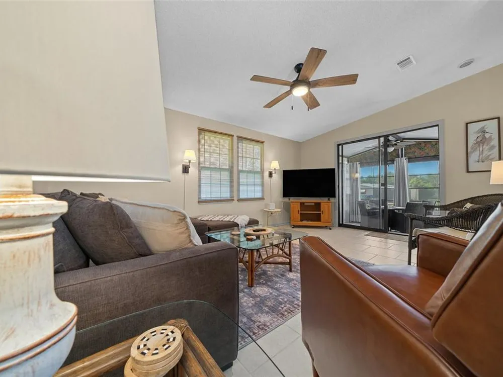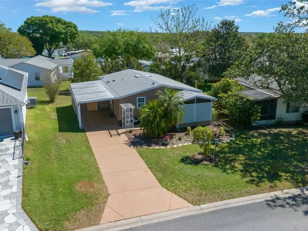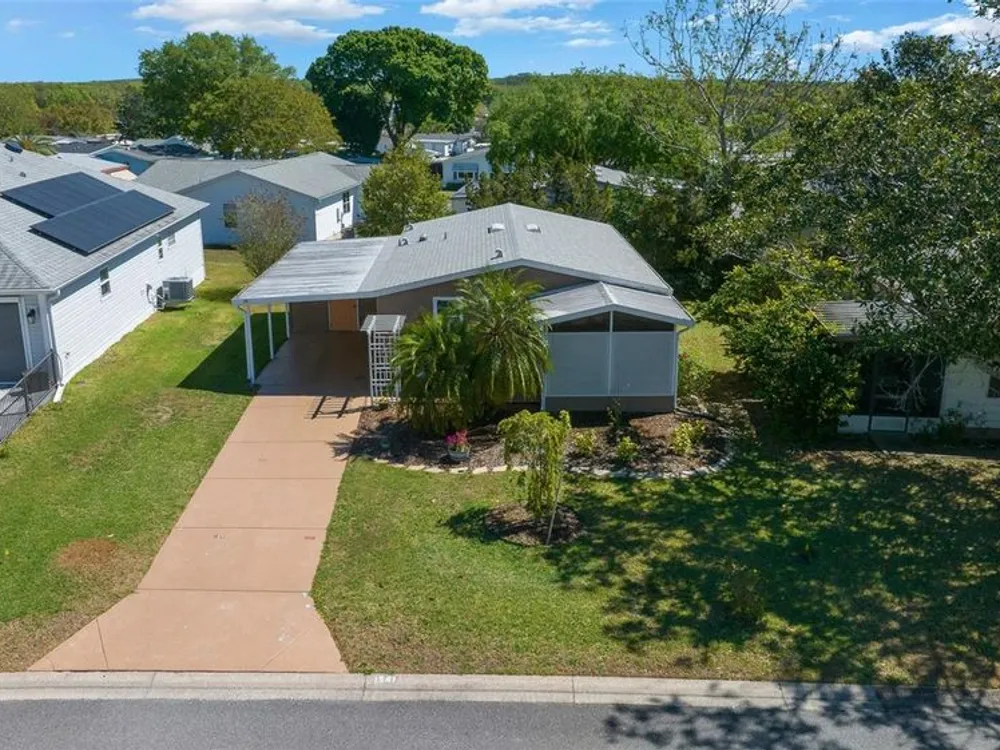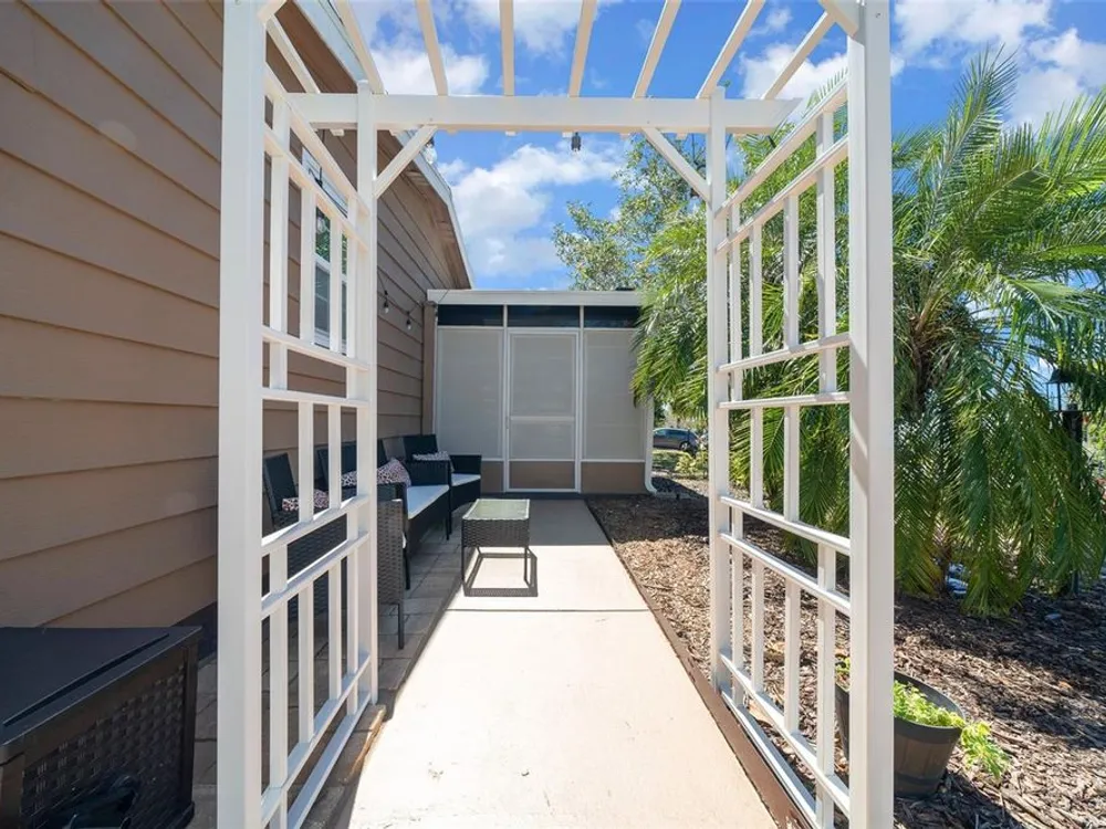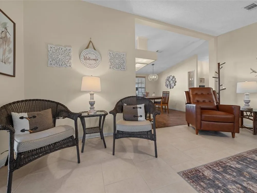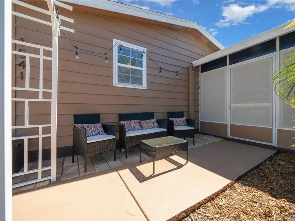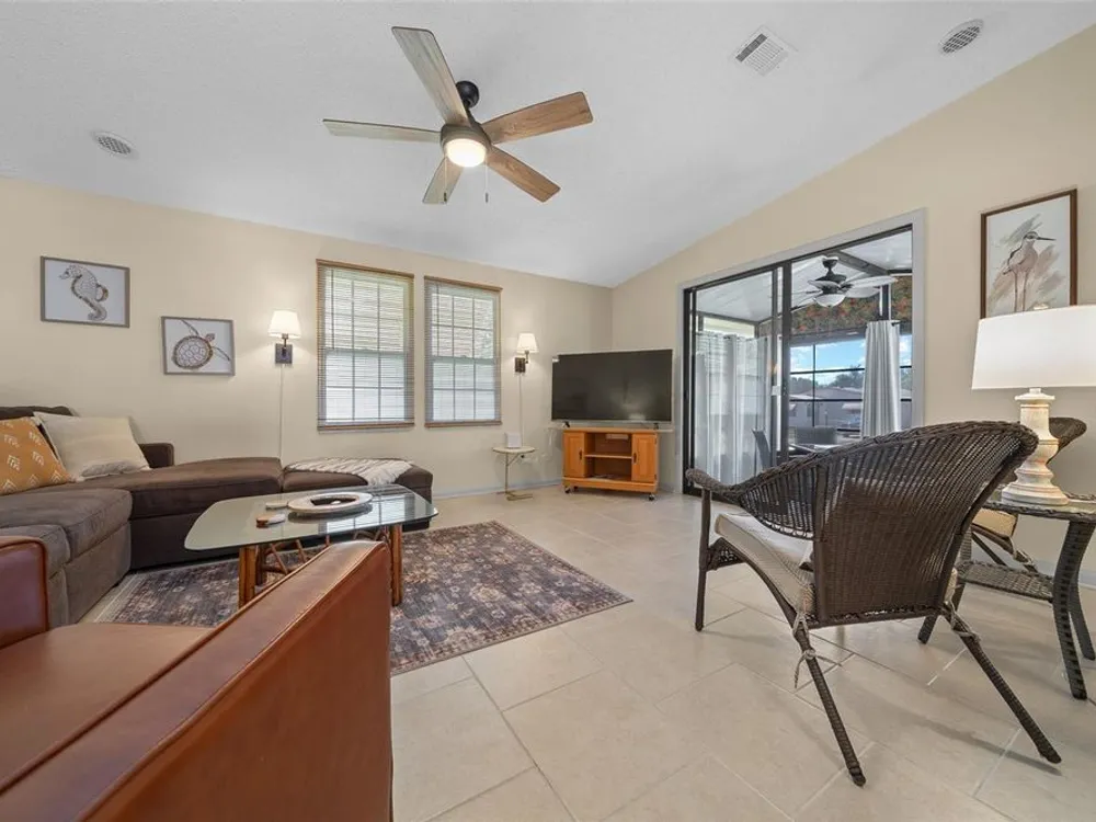 Discover this beautifully refreshed 2BR/2BA home with a GOLF CART GARAGE in the Village of Orange Blossom—just 1.5 miles to Spanish Springs and steps from the Hilltop Adult Pool. Nearly every feature has been updated for comfort and peace of mind: new roof (2022), HVAC (2022), double-pane tilt windows, fresh interior/exterior paint, updated lighting and ceiling fans, blinds, landscaping (2024 & 2025), and refreshed grout throughout (2024). The kitchen received a complete refresh in June 2025 in addition to upgraded plumbing, vented microwave, pull-down faucet, and matching appliances. Bathrooms include COMFORT-HEIGHT TOILETS, new sinks and faucets, and a glass shower door (2023). VAULTED CEILINGS and NO CARPET create a bright, low-maintenance interior. The spacious ENCLOSED LANAI offers new PRIVACY SCREENS and window film (2024), while the newly painted front PATIO with a TRELLIS and lighting extends your outdoor living. Additional highlights include INSIDE LAUNDRY with Whirlpool HE washer, golf cart garage with FRESHLY PAINTED, workbench and added outlets, plus a newly upgraded sprinkler control box (2024). The primary suite includes a walk-in closet, copper sink, and walk-in shower; the guest suite also features vaulted ceilings and a walk-in closet. This home is being offered w/ a separate turn-key (furniture and décor) package —just bring your toothbrush! With NO BOND or bond maintenance and 2024 taxes of $2,749 + fire ($124) + waste ($185) = $3,058, this property is truly move-in ready and perfectly positioned to enjoy The Villages lifestyle.
