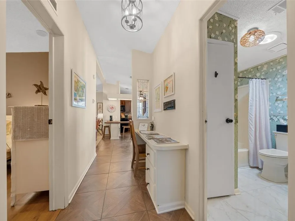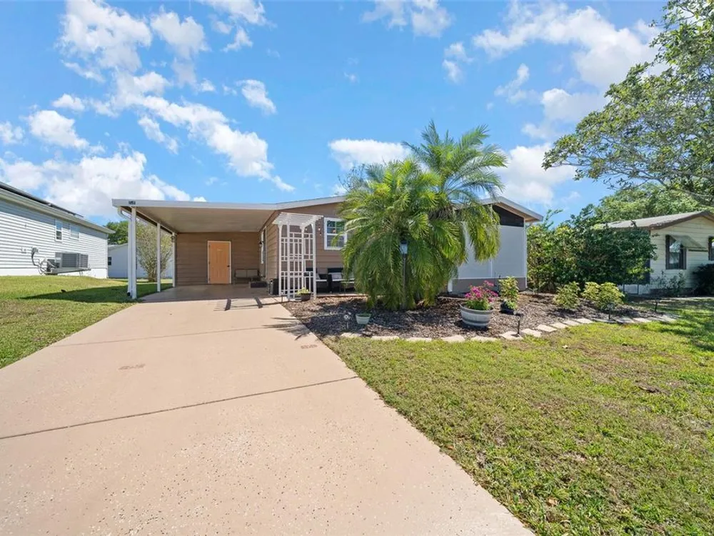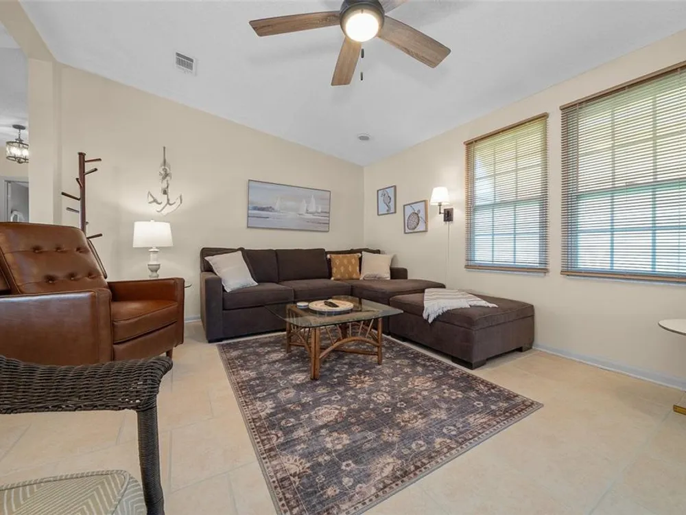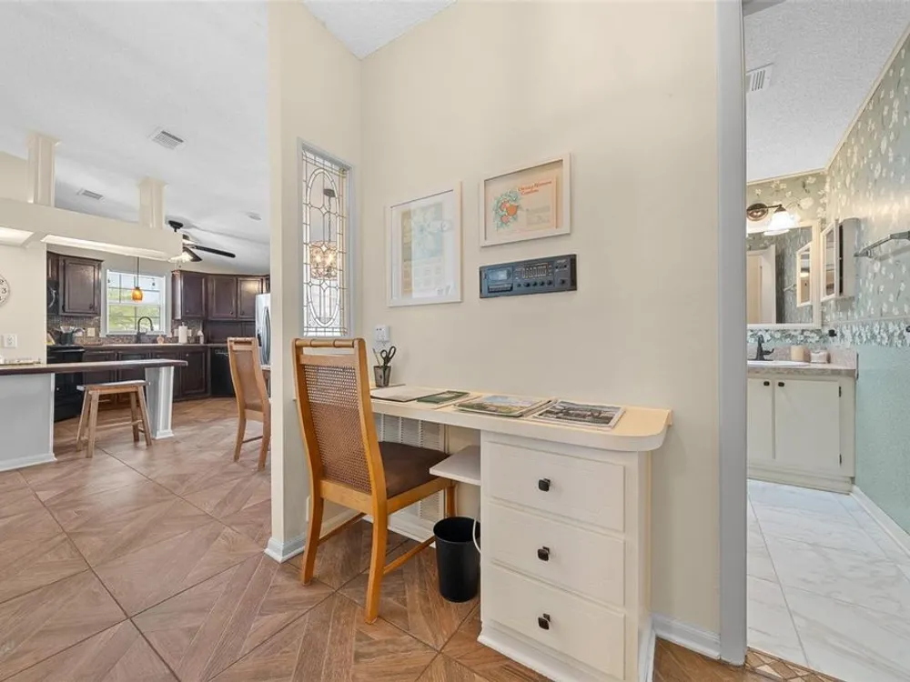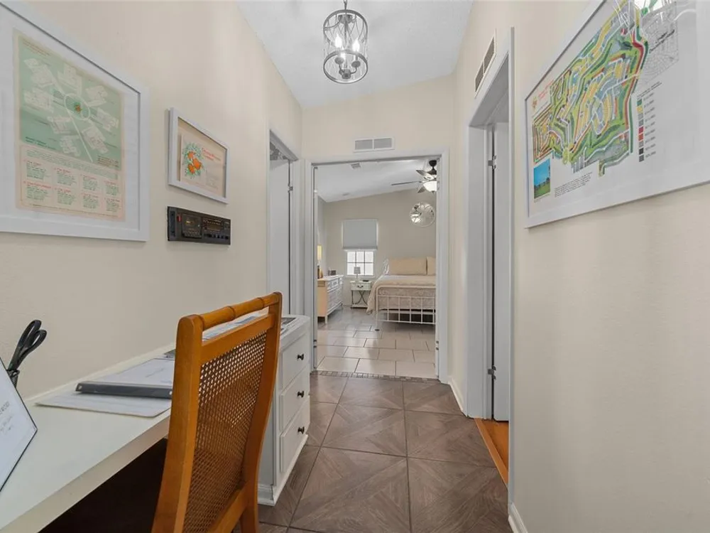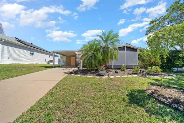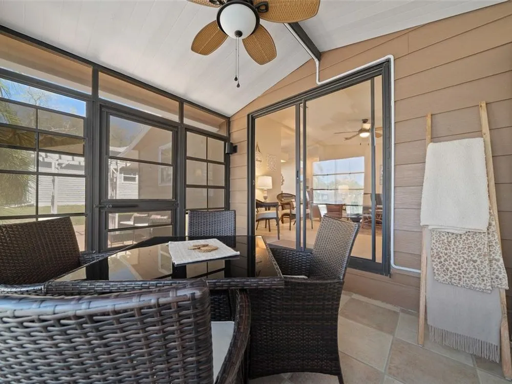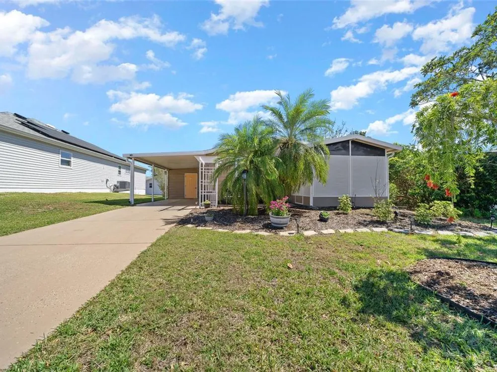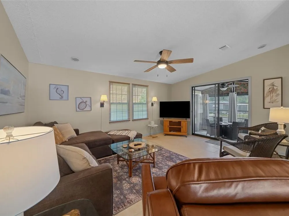 Discover this beautifully refreshed 2BR/2BA home with a GOLF CART GARAGE in the Village of Orange Blossom—just 1.5 miles to Spanish Springs and steps from the Hilltop Adult Pool. Nearly every feature has been updated for comfort and peace of mind: new roof (2022), HVAC (2022), double-pane tilt windows, fresh interior/exterior paint, updated lighting and ceiling fans, blinds, landscaping (2024 & 2025), and refreshed grout throughout (2024). The kitchen received a complete refresh in June 2025 in addition to upgraded plumbing, vented microwave, pull-down faucet, and matching appliances. Bathrooms include COMFORT-HEIGHT TOILETS, new sinks and faucets, and a glass shower door (2023). VAULTED CEILINGS and NO CARPET create a bright, low-maintenance interior. The spacious ENCLOSED LANAI offers new PRIVACY SCREENS and window film (2024), while the newly painted front PATIO with a TRELLIS and lighting extends your outdoor living. Additional highlights include INSIDE LAUNDRY with Whirlpool HE washer, golf cart garage with FRESHLY PAINTED, workbench and added outlets, plus a newly upgraded sprinkler control box (2024). The primary suite includes a walk-in closet, copper sink, and walk-in shower; the guest suite also features vaulted ceilings and a walk-in closet. This home is being offered w/ a separate turn-key (furniture and décor) package —just bring your toothbrush! With NO BOND or bond maintenance and 2024 taxes of $2,749 + fire ($124) + waste ($185) = $3,058, this property is truly move-in ready and perfectly positioned to enjoy The Villages lifestyle.