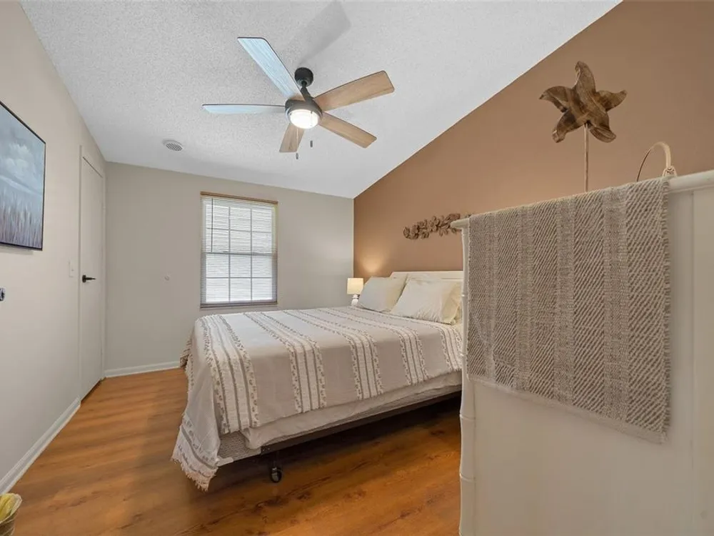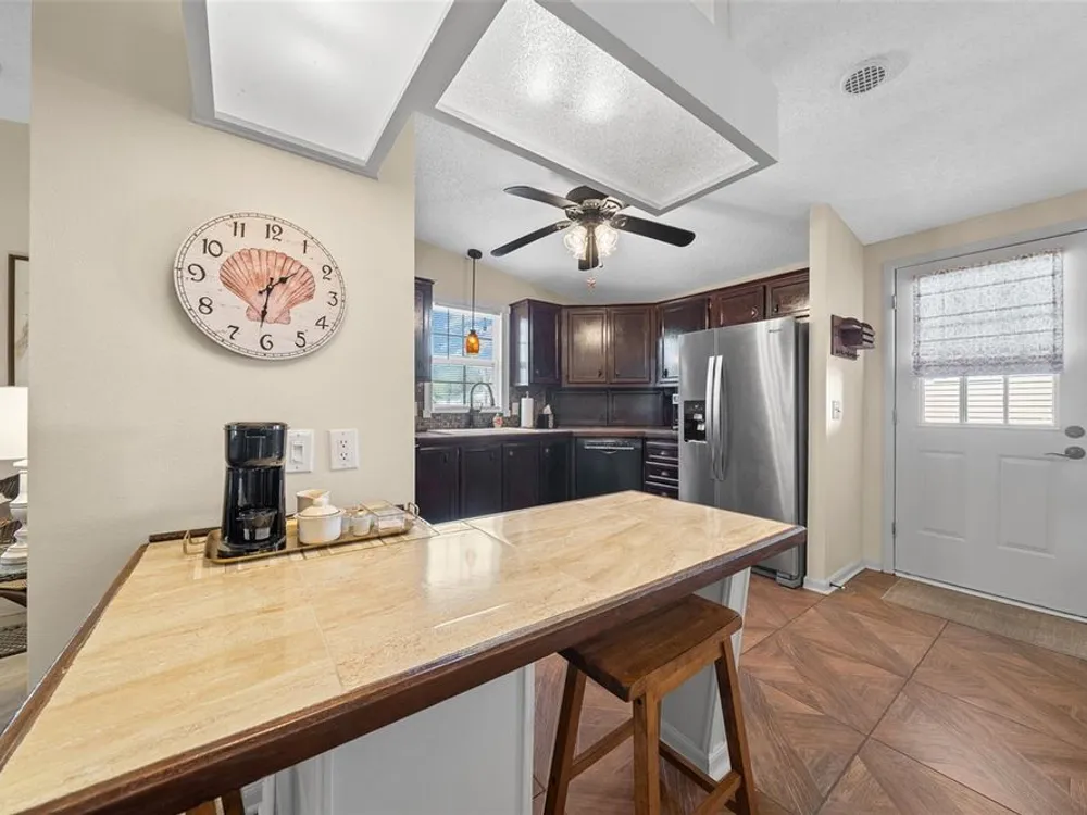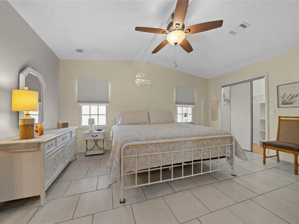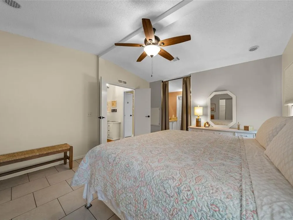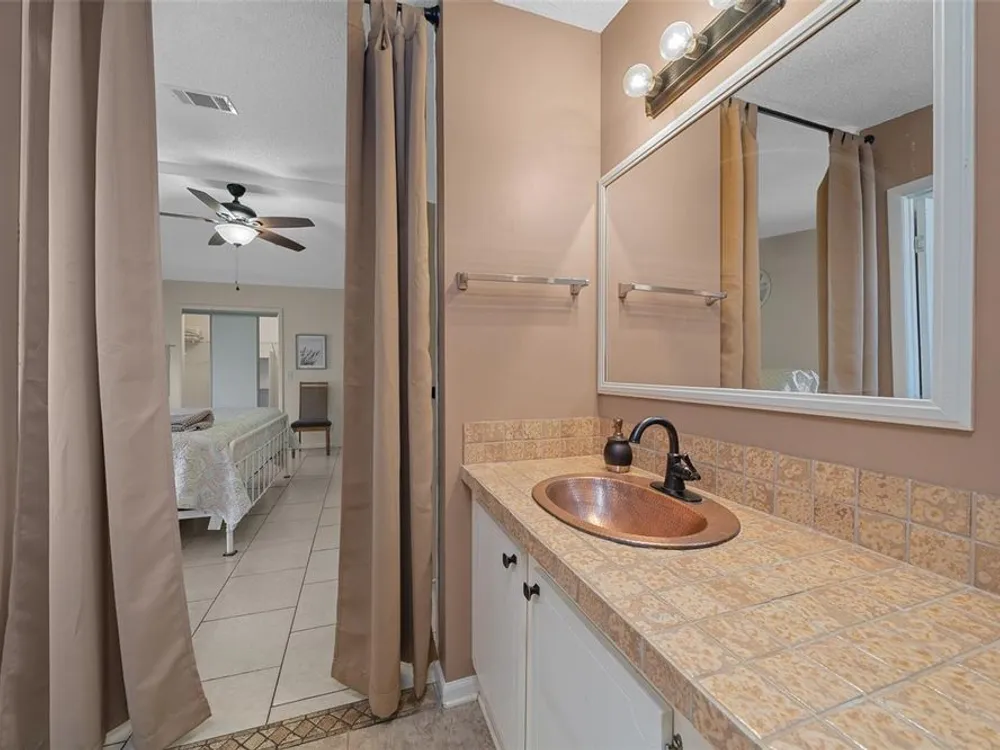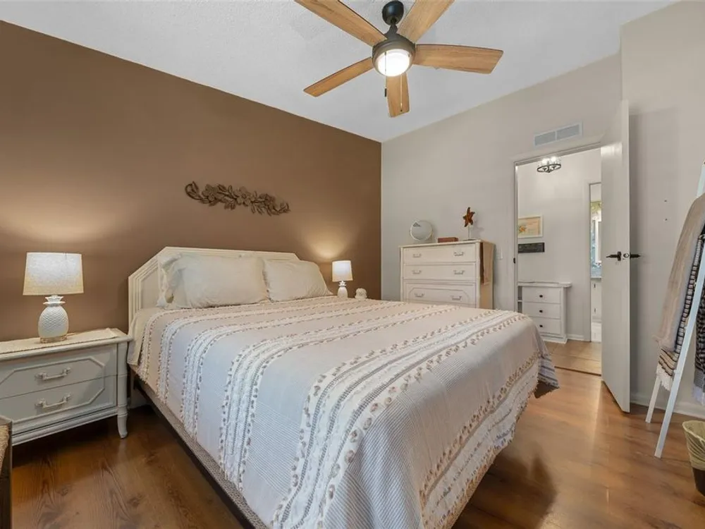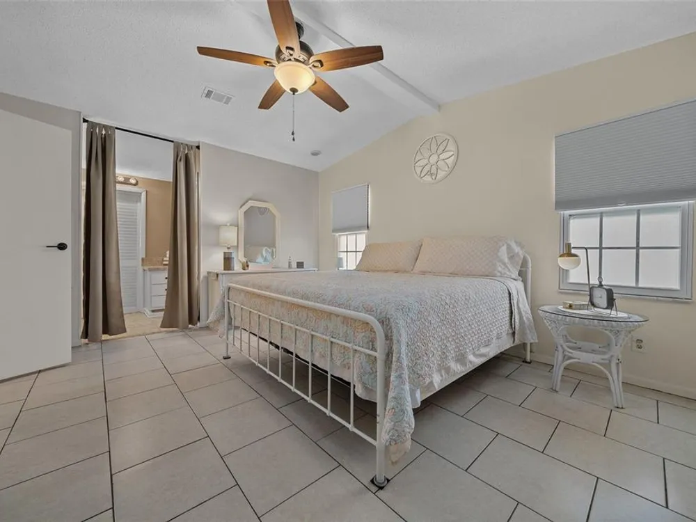 Discover this beautifully refreshed 2BR/2BA home with a GOLF CART GARAGE in the Village of Orange Blossom—just 1.5 miles to Spanish Springs and steps from the Hilltop Adult Pool. Nearly every feature has been updated for comfort and peace of mind: new roof (2022), HVAC (2022), double-pane tilt windows, fresh interior/exterior paint, updated lighting and ceiling fans, blinds, landscaping (2024 & 2025), and refreshed grout throughout (2024). The kitchen received a complete refresh in June 2025 in addition to upgraded plumbing, vented microwave, pull-down faucet, and matching appliances. Bathrooms include COMFORT-HEIGHT TOILETS, new sinks and faucets, and a glass shower door (2023). VAULTED CEILINGS and NO CARPET create a bright, low-maintenance interior. The spacious ENCLOSED LANAI offers new PRIVACY SCREENS and window film (2024), while the newly painted front PATIO with a TRELLIS and lighting extends your outdoor living. Additional highlights include INSIDE LAUNDRY with Whirlpool HE washer, golf cart garage with FRESHLY PAINTED, workbench and added outlets, plus a newly upgraded sprinkler control box (2024). The primary suite includes a walk-in closet, copper sink, and walk-in shower; the guest suite also features vaulted ceilings and a walk-in closet. This home is being offered w/ a separate turn-key (furniture and décor) package —just bring your toothbrush! With NO BOND or bond maintenance and 2024 taxes of $2,749 + fire ($124) + waste ($185) = $3,058, this property is truly move-in ready and perfectly positioned to enjoy The Villages lifestyle.