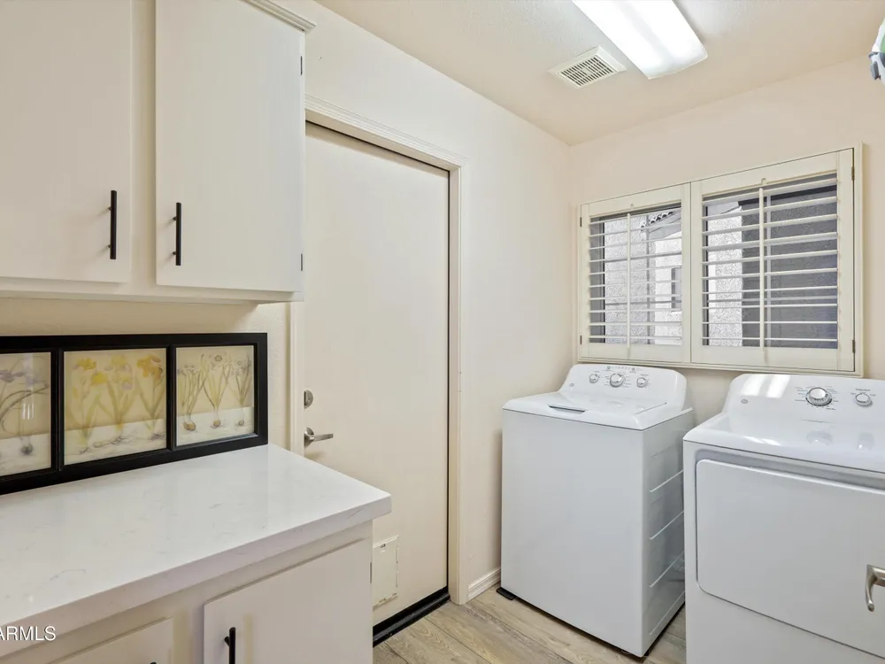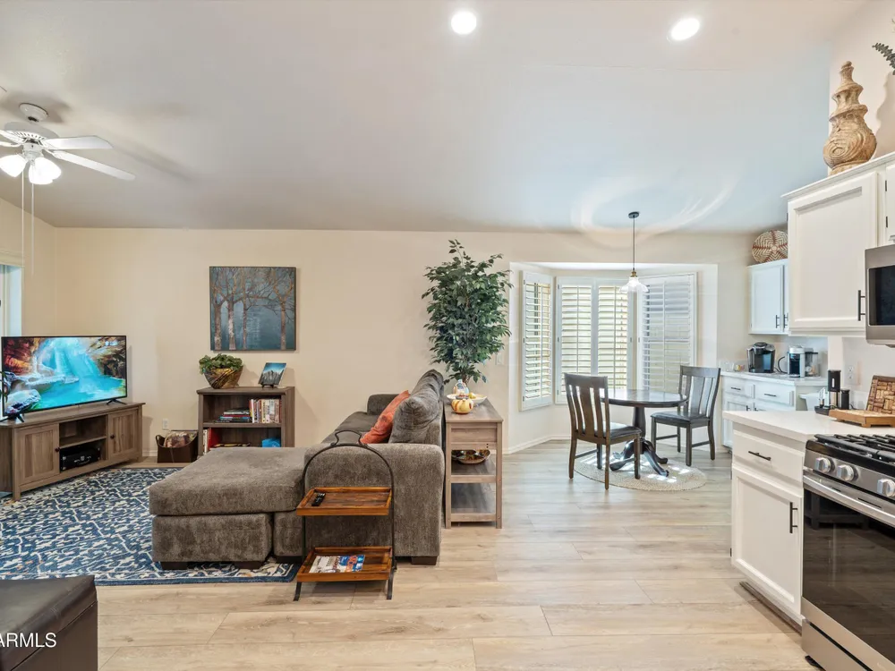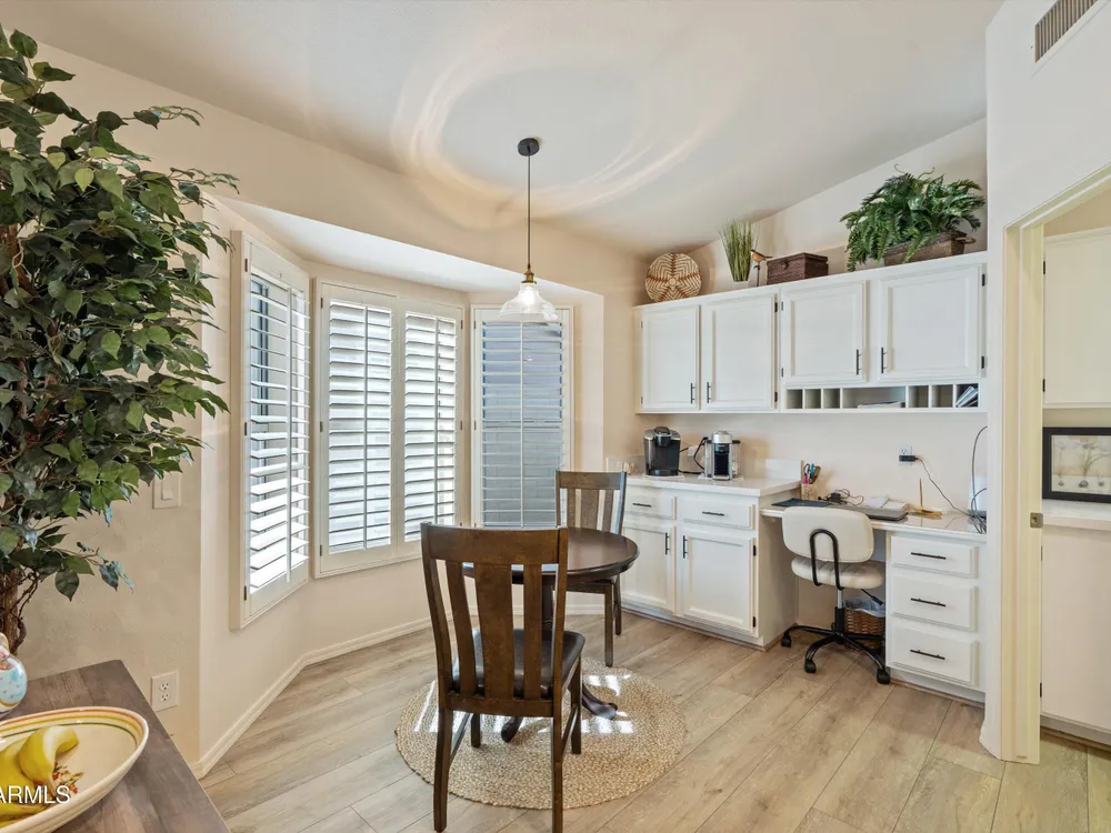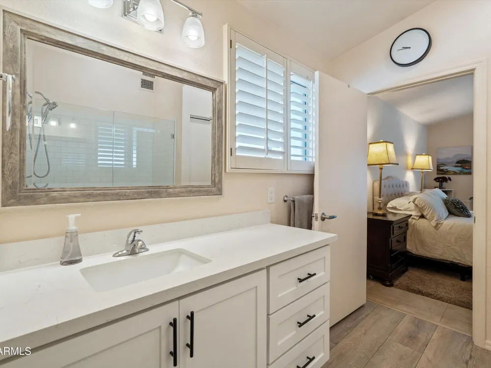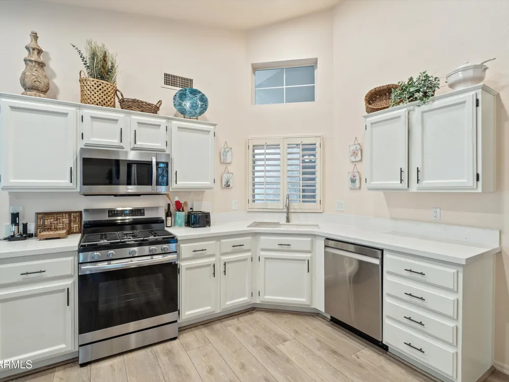 Welcome to this beautifully updated home in the vibrant PebbleCreek community, where every day feels like a getaway. This thoughtfully updated Heritage model in PebbleCreek is designed for both comfort and style, featuring two master suites, soaring vaulted ceilings, plantation shutters, and new vinyl plank flooring that flows seamlessly throughout. The remodeled kitchen shines with quartz countertops, stainless appliances, and a sunny dining nook, while the primary suite offers a spa-like retreat with a luxurious walk-in shower and custom California Closets. A spacious second suite with its own private bath creates the perfect setup for visiting family and friends, offering both comfort and privacy. What sets this home apart is its inviting outdoor living. The private backyard offers block walls for privacy, lush greenery, pet runs on both sides, and a covered patioideal for morning coffee, afternoon relaxation, or evenings spent entertaining friends. The finished garage, complete with built-in cabinetry and epoxy flooring, adds both convenience and function. All of this comes with PebbleCreek's unmatched resort-style amenities. Residents enjoy championship golf courses, indoor and outdoor pools, state-of-the-art fitness centers, pickleball and tennis courts, arts and crafts studios, and even a performing arts theater. With multiple clubhouses, restaurants, and countless clubs and activities, PebbleCreek offers a vibrant, active lifestyle that feels like vacation every day. This move-in ready home, with furniture available, is more than just a place to liveit's an opportunity to embrace the very best of Arizona living in one of the Valley's most sought-after communities.