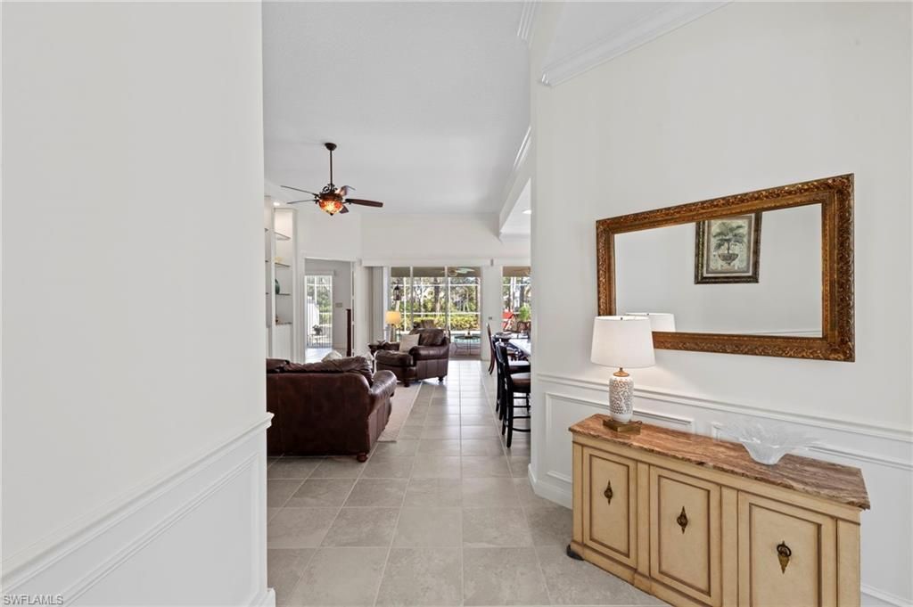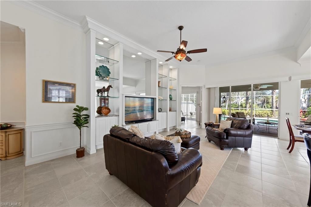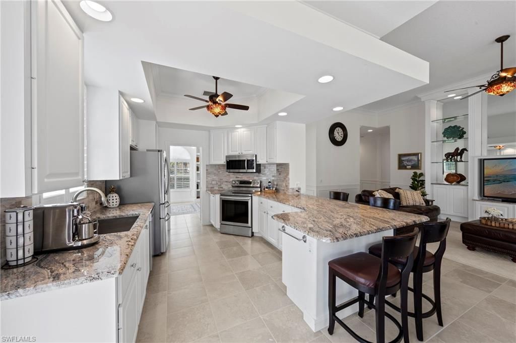Situated on a quiet cul-de-sac in the highly sought-after Village Walk of Bonita Springs, this popular DiVosta-built Oakmont model is known for its exceptional quality, featuring poured concrete and steel-reinforced construction. A timeless floor plan offers an open, bright, and inviting layout with three bedrooms, two full baths, a den, a two-car garage, and a private saltwater pool and spa. Thoughtfully updated, the home showcases fresh exterior paint completed in January 2026, elegant wainscoting, custom built-ins throughout, plantation shutters, and a no-carpet interior. Tile flooring flows through the main living areas, while luxury vinyl flooring enhances the guest bedrooms. The spacious kitchen is well suited for everyday living and entertaining, featuring granite countertops, a marble tile backsplash, and newer stainless-steel appliances. A formal dining area and generous family room provide comfortable gathering spaces. The primary suite offers ample closet space with a custom built-in system and double sliding doors that open directly to the expansive lanai. The outdoor living area features a heated custom pool and spa with serene views overlooking the Venetian Bridges—an ideal setting for relaxation or entertaining. Village Walk residents enjoy an impressive array of resort-style amenities, including multiple pools, a fitness center, tennis, pickleball, bocce, two on-site restaurants, a gas station, car wash, and over five miles of scenic walking paths. Cable, internet, and fiber optics are included in the HOA fees. This well-maintained home is perfectly suited for year-round living or seasonal retreat in one of Bonita Springs’ most desirable communities.