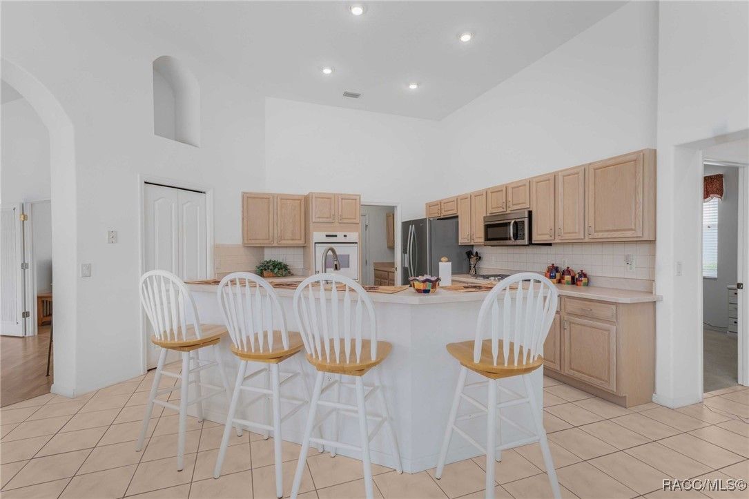 - Attic Access, Breakfast Bar, Eat-in Kitchen, High Ceilings, Laminate Counters, Open Floorplan, Pantry, Pull Down Attic Stairs, Split Bedrooms, Solid Surface Counters, Walk-In Closet(s), WoodCabinets, Window Treatments, Programmable Thermostat