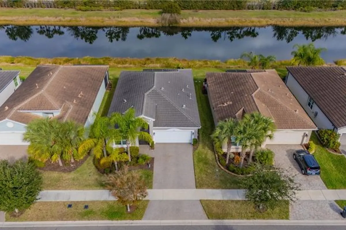 Welcome to 15433 Santa Pola Drive, a beautifully maintained 2019-built residence offering 2 bedrooms, 2 bathrooms, a versatile den, and serene water views, located within the highly desirable 55+ gated community of Valencia Del Sol. Lush landscaping and attractive curb appeal set the stage for this thoughtfully designed 1,599 sq. ft. home featuring a bright, open-concept floor plan ideal for everyday living and entertaining. Upon entry, the guest bedroom and full bath are privately situated at the front of the home, while glass double doors open to a flexible den—perfect for a home office, hobby room, or additional guest space. The heart of the home is the spacious great room, seamlessly connecting the kitchen and dining area, and highlighted by sliding glass doors that open to an extended screened lanai with tranquil water views—the perfect setting to relax or host guests. The well-appointed kitchen features granite countertops, a large center island with stained maple cabinetry, white cabinets, pot and pan drawers, vented microwave and stainless steel appliances, including a new Samsung dishwasher and new French-door refrigerator. The owner’s suite is privately tucked away at the rear of the home and showcases a tray ceiling, spacious dual closets, and a spa-inspired en-suite bath with dual sinks, Corian countertops, a built-in linen cabinet, and an oversized tiled shower with built-in seating. Additional highlights include a dedicated laundry room with upgraded washer and dryer, ample storage cabinetry leading out to the spacious two-car garage. Recent upgrades add exceptional value, including a new HVAC system with a 7-year parts and labor warranty, front entry screen enclosure, glass front entry door, 4-foot lanai extension, garage overhead storage rack, water softener system, and more. Valencia Del Sol is a natural gas community with NO CDD, offering world-class resort-style amenities such as a grand clubhouse with ballroom and theater, state-of-the-art fitness center, yoga studio, sports lounge, zero-entry resort pool, lap pool, pickleball and tennis courts, bocce ball, dog park, an on-site upscale restaurant, and a vibrant calendar of clubs and activities. Conveniently located near shopping, dining, medical facilities, and major roadways, with easy access to Tampa, Sarasota, St. Petersburg, airports, and award-winning Gulf beaches, this home delivers the perfect blend of comfort, luxury, and active community living.