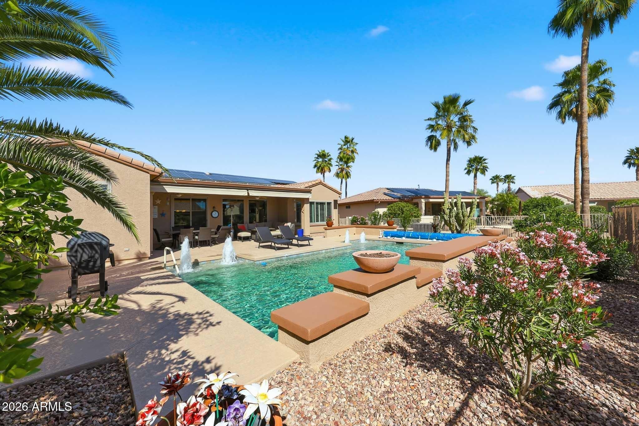 Expanded Borgata you just have to see. 2108 Sq. feet with extended Primary Suite, Custom Extended 2nd Bedroom Suite with a Bath & door onto patio/pool area. Large closet with sliding glass doors. A Window added to over look patio pool area. Paid Leased Solar, New Andersen Windows ,Doors & Slider installed. New HVAC 2022, New Hot Water Heater 2023,New Built In BBQ Grill 2025, New Awing Fabric 2024, Exterior Painted 2020 and Kool Decking 2020. Heated Pool with water features. Large Tile Floors and Wood Look Tile Throughout home. Kitchen Gas Range, SS Appliances, Laundry Room Built In Utility Sink and extra Storage Cabinets, Garage Extended Length, Cabinets, Over Head Storage . Don't Miss Walking through this one of a kind home.