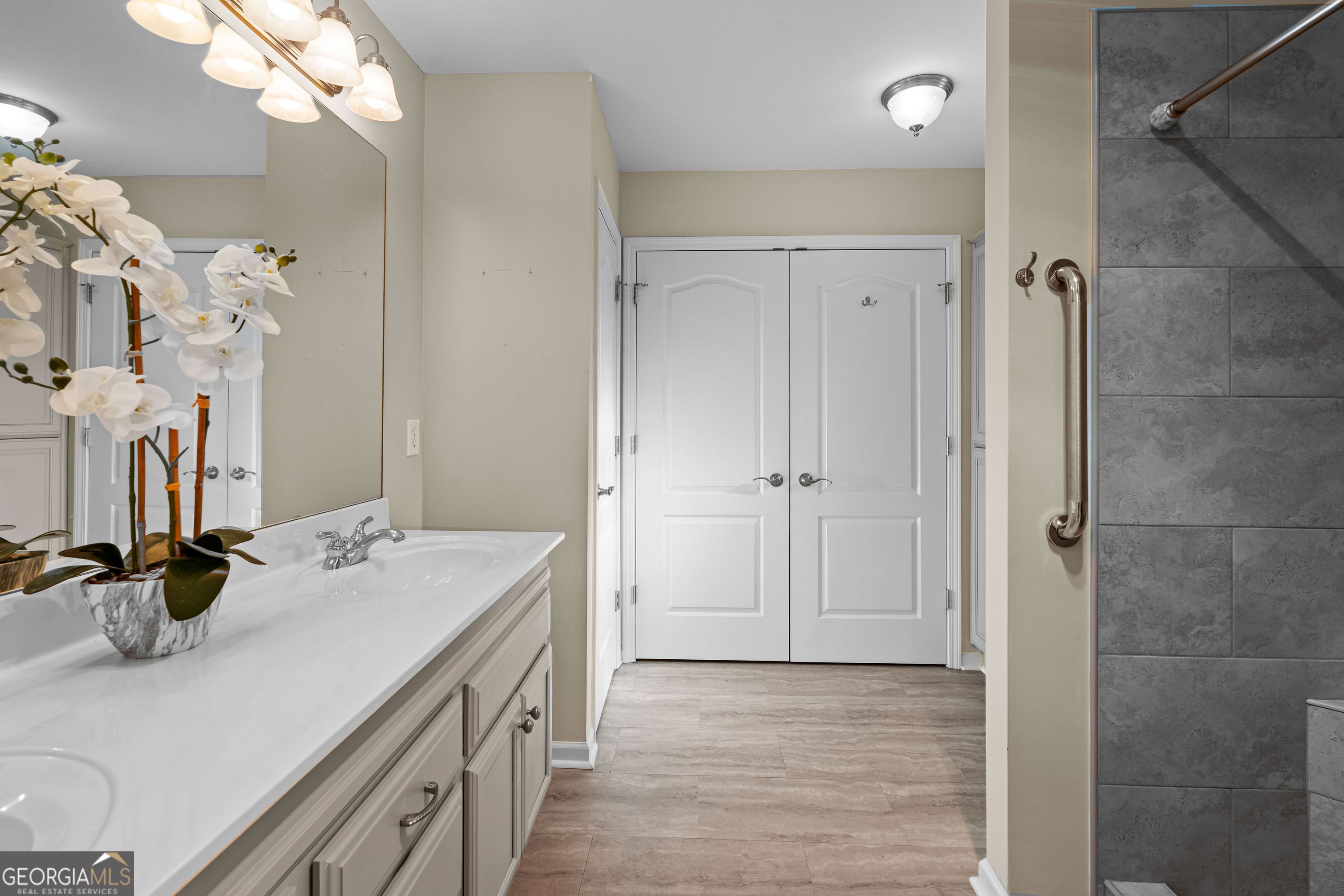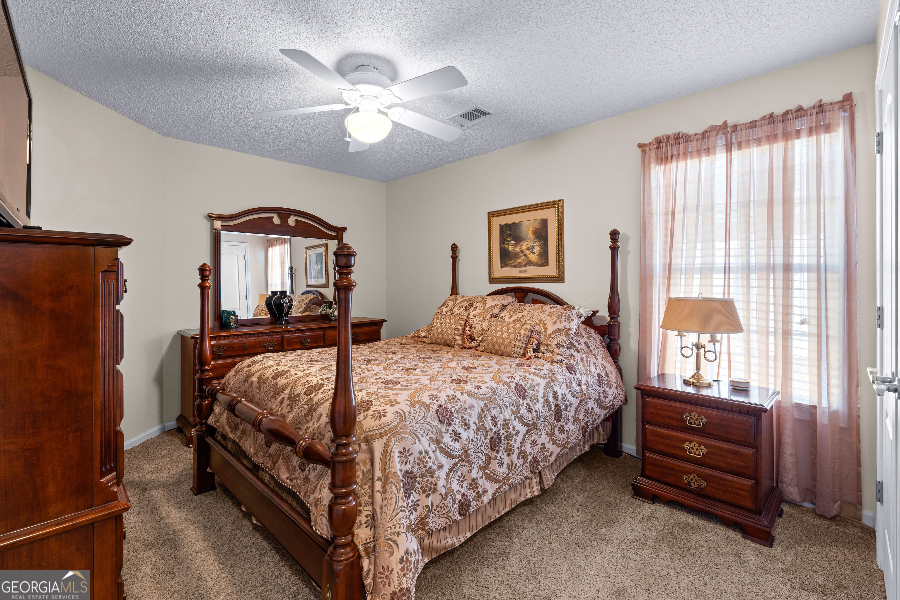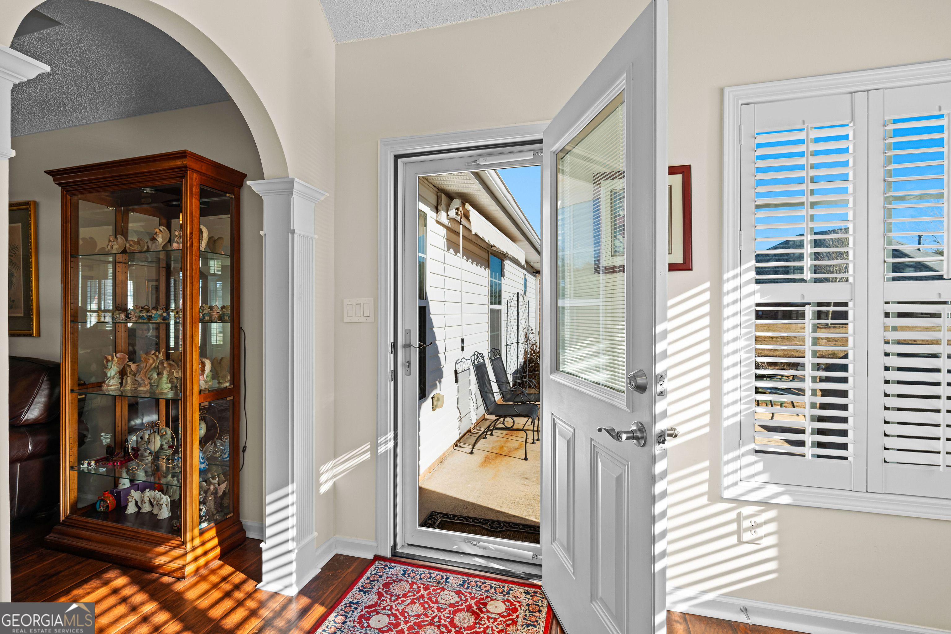 In The Retreat at Westridge, one of Henry County's 55+ communities, this well-cared-for home delivers the space you want with a layout that simply works. Step into a welcoming foyer that opens to hardwood floors and bright living areas framed by plantation shutters throughout. The living room centers around a classic fireplace, and the separate dining room is ready for everything from weeknight dinners to holiday gatherings. The kitchen is truly generous, with abundant cabinetry, granite countertops, a tile backsplash, recessed lighting, and a gas range, plus easy connection to the main living spaces. A mud room adds the kind of everyday convenience you will appreciate, and storage shows up throughout in all the right places. Just off the main living area, the sunroom gives you flexible space for morning coffee, reading, or hobbies. The primary suite feels comfortably sized, and the walk-in closet includes an organization system to keep things tidy. Both full baths feature walk-in, tiled showers with easy-entry details and grab bars, and seller reports 18 inches of insulation. One more bonus: a walk-up attic with traditional stairs offers excellent storage and unfinished space with potential to expand (verify feasibility and permits). Outside, enjoy a patio and a level backyard with open lawn and a treeline backdrop, plus room to garden and entertain.