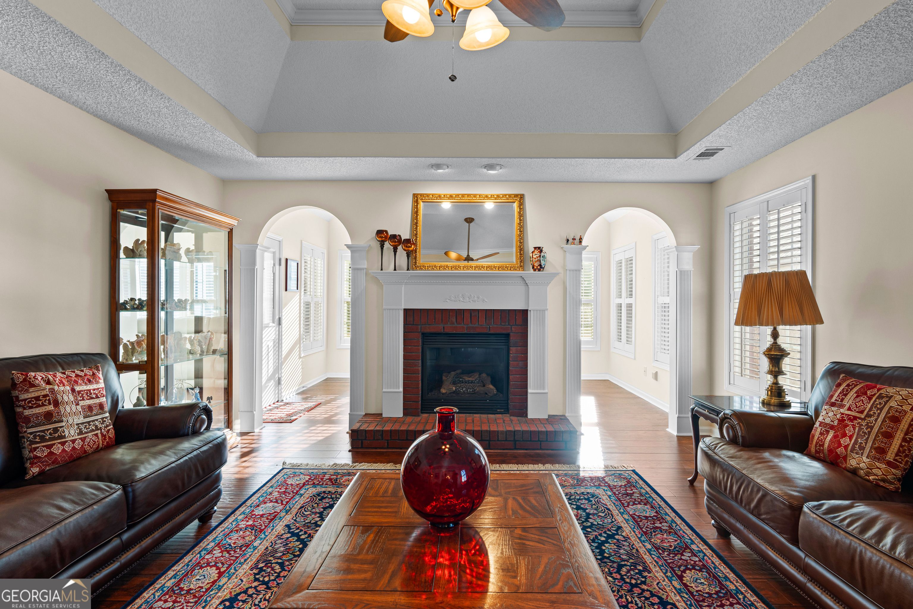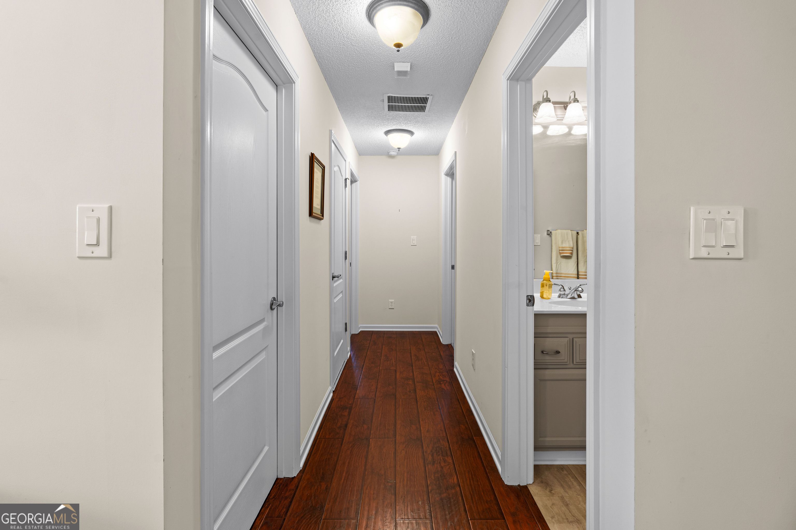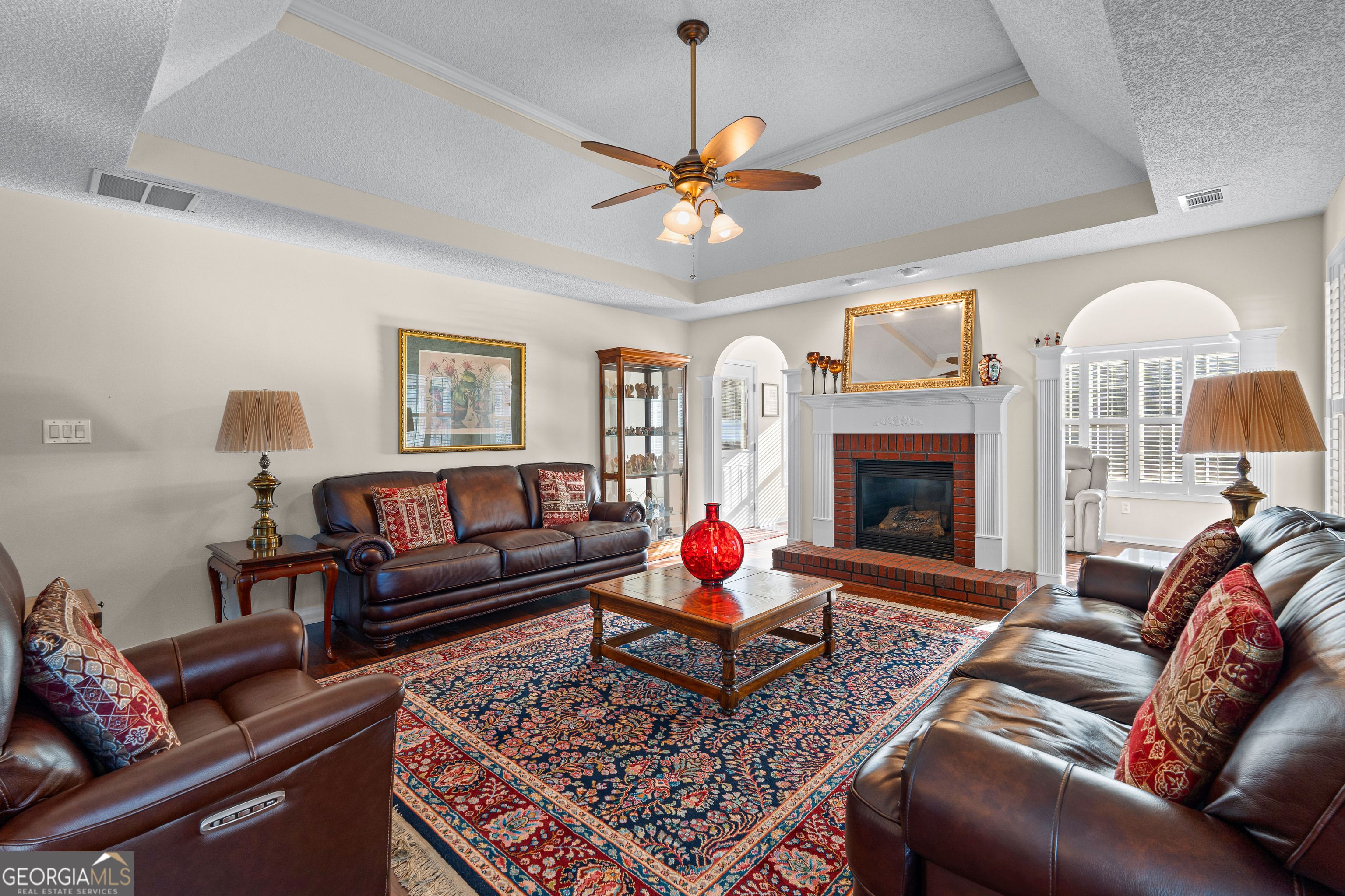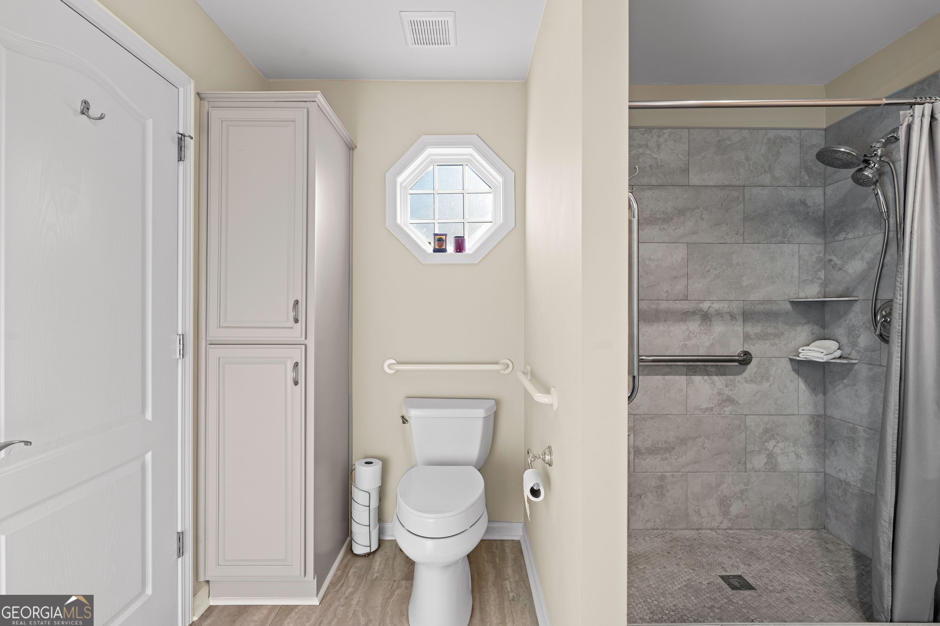 In The Retreat at Westridge, one of Henry County's 55+ communities, this well-cared-for home delivers the space you want with a layout that simply works. Step into a welcoming foyer that opens to hardwood floors and bright living areas framed by plantation shutters throughout. The living room centers around a classic fireplace, and the separate dining room is ready for everything from weeknight dinners to holiday gatherings. The kitchen is truly generous, with abundant cabinetry, granite countertops, a tile backsplash, recessed lighting, and a gas range, plus easy connection to the main living spaces. A mud room adds the kind of everyday convenience you will appreciate, and storage shows up throughout in all the right places. Just off the main living area, the sunroom gives you flexible space for morning coffee, reading, or hobbies. The primary suite feels comfortably sized, and the walk-in closet includes an organization system to keep things tidy. Both full baths feature walk-in, tiled showers with easy-entry details and grab bars, and seller reports 18 inches of insulation. One more bonus: a walk-up attic with traditional stairs offers excellent storage and unfinished space with potential to expand (verify feasibility and permits). Outside, enjoy a patio and a level backyard with open lawn and a treeline backdrop, plus room to garden and entertain.