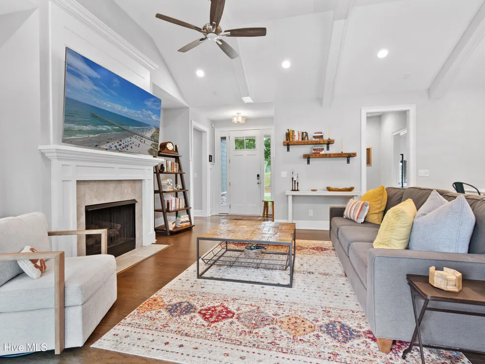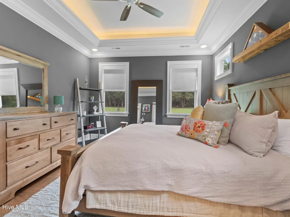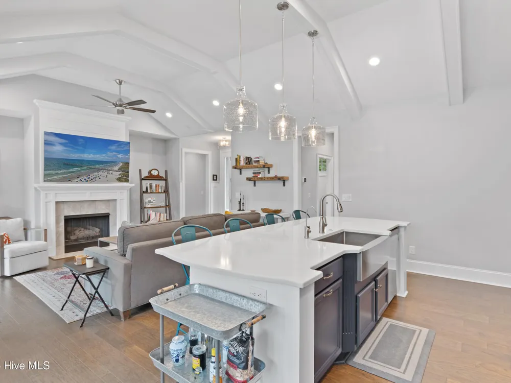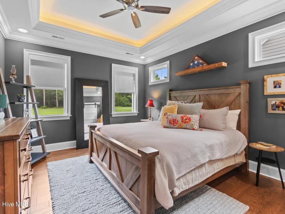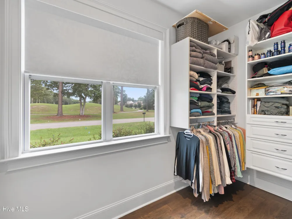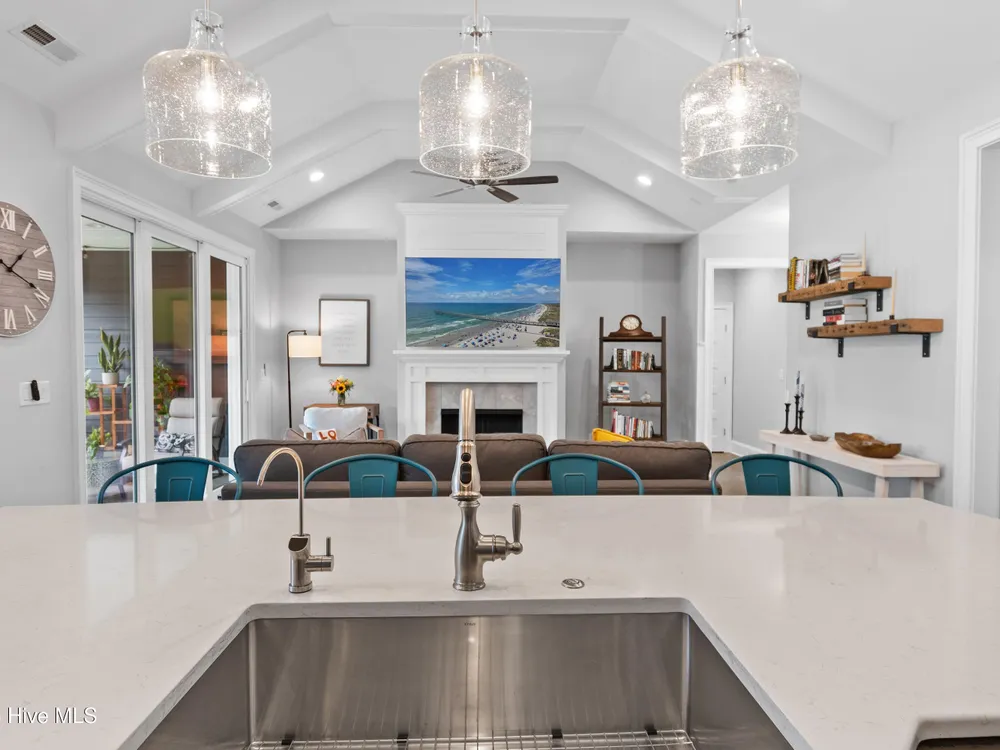 - Blinds/Shades, Solid Surface, Walk-In Closet(s), Walk-in Shower, Vaulted Ceiling(s), Tray Ceiling(s), Sound System, Pantry, Entrance Foyer, Master Downstairs, Kitchen Island, High Ceilings, Gas Log, Ceiling Fan(s)