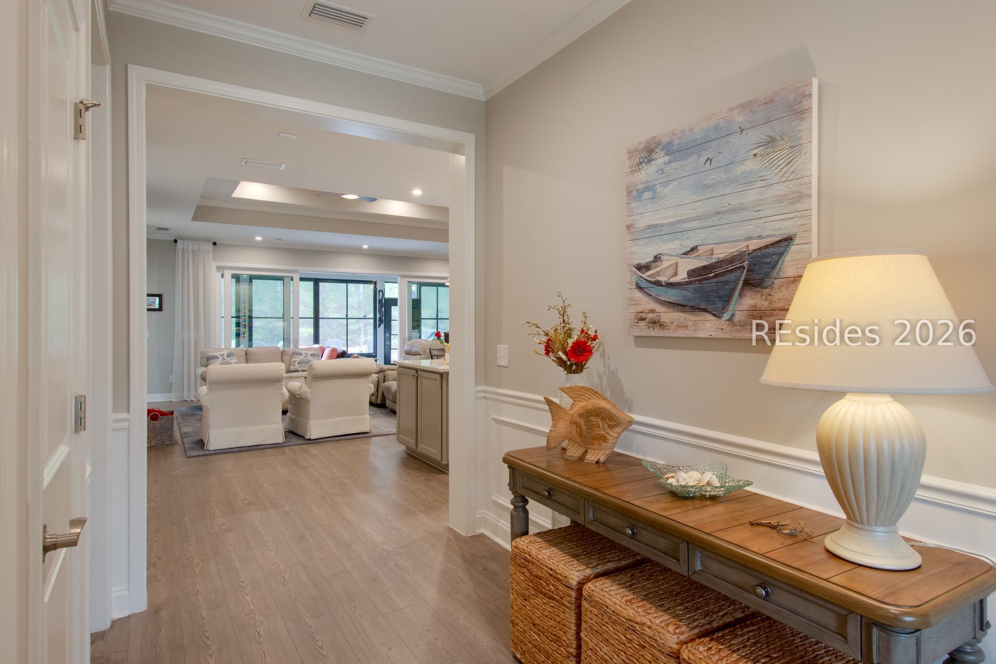Nearly new Stardom model with beaucoup upgrades in fabulous location. The upgrades start with the widened driveway, cozy front porch, hardy-plank siding, brick trim and landscape lighting as you approach the home. A generous foyer, Luxury Vinyl Planks in living areas draws you in. A spacious den/office is just inside the front door. The gourmet kitchen boasts counter level seating with pendant lighting, quartz countertops, convection mw/oven combo, SS appliances, pantry with wood shelving and bar area with wine refrigerator. Family room is open to the kitchen and dining area for great entertaining space. A remote gas fireplace with glass doors and blowers adds evening ambiance or warmth on those chilly mornings. Built-in cabinets on either side of the fireplace for displaying mementos. Tray ceiling, crown molding and ceiling fan in family room. Primary suite with tray ceiling, quartz countertops, dual vanities, super shower and walk-in closet. 2 guest bedrooms and on opposite side of the house allows for extra privacy. Step through the expanding slider from the family room into the enlarged, screened and vinyl-paneled porch with a mini split for year-round use. From there you can step out onto the pavered patio. The lagoon to nature preserve view can be enjoyed from the primary suite, guest bedroom, patio, porch, family room and kitchen. The laundry room has multiple cabinets and counter space. The 3-car oversized garage is equipped with a generous storage system in addition to floored attic storage space accessed by pull down stairs. Special additional features include: insulated garage door, whole house water filtration system, landscape watering system for bushes and planters, CPI security system, whole house dehumidification system, water line for a garage refrigerator, gas line in back for a grill and/or fire pit, 2 coats of quality paint on all interior doors, trim, walls and ceilings.