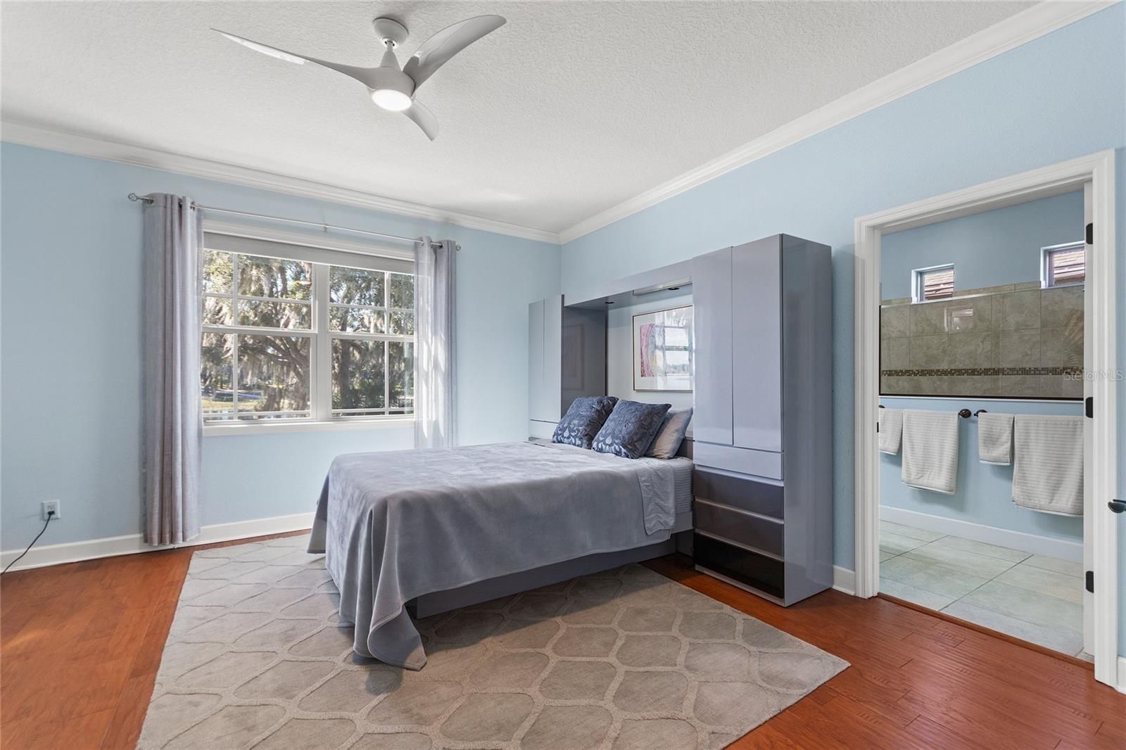 - Ceiling Fan(s), Crown Molding, Eat-in Kitchen, High Ceilings, Living/Dining Room, Open Floorplan, Main Level Primary, Split Bedrooms, Stone Counters, Walk-In Closet(s)