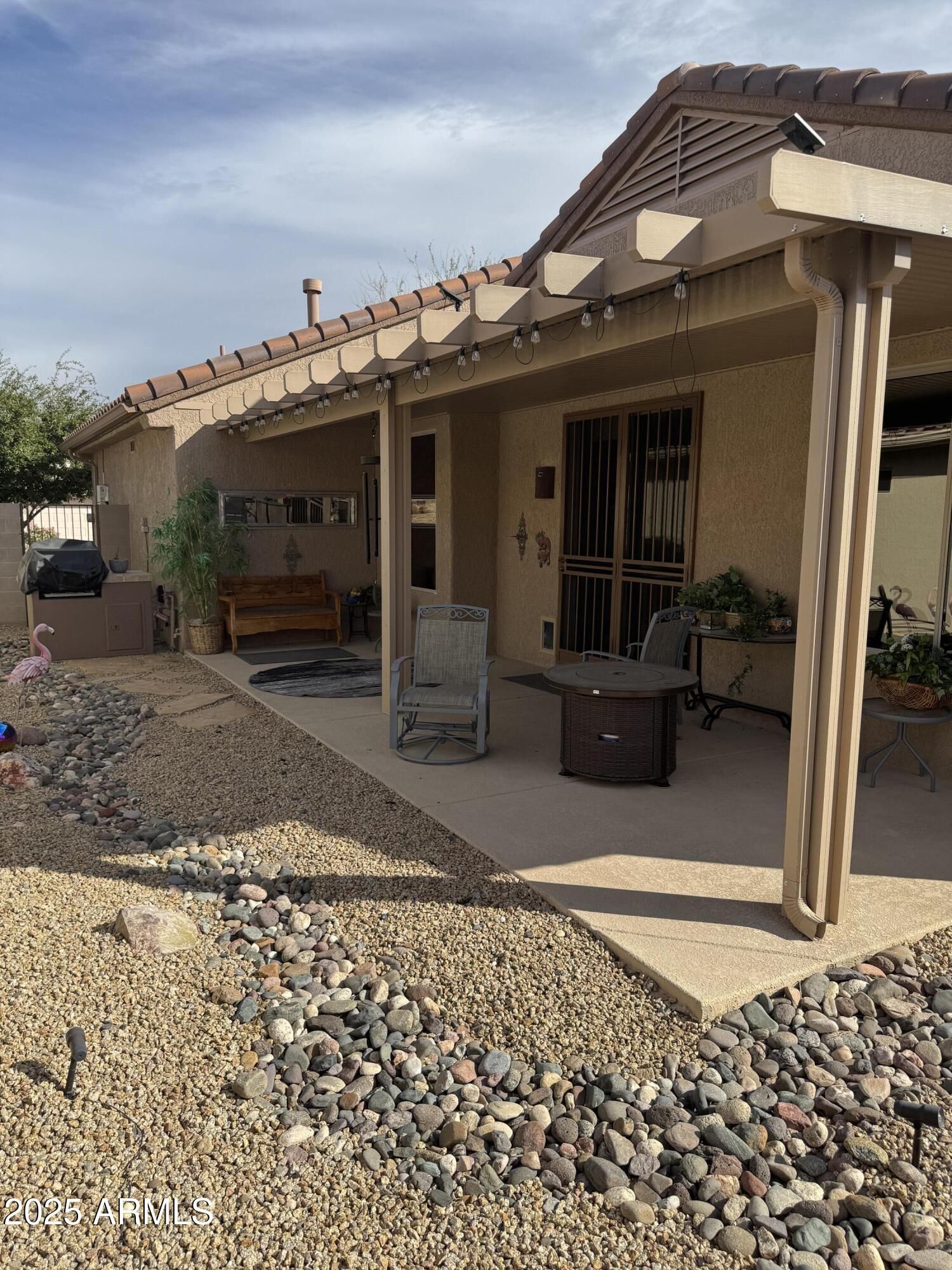 Welcome to this beautifully maintained 2-bedroom, 2-bath home in Sun City Grand. Enjoy a comfortable layout with a spacious great room, open kitchen, and desirable north-south exposure. The kitchen features granite countertops and granite backsplash, and newer KitchenAid appliances, perfect for everyday cooking or entertaining. Both bathrooms include custom-tiled showers and granite counters, while the owner's suite offers a walk-in closet with custom cabinetry for added organization. The garage features epoxy flooring and built-in storage cabinets. A newer HVAC system ensures year-round comfort and efficiency throughout the home. The Select Home Warranty Platinum Care plan is transferable through April 2026 for extra peace of mind. Step outside to a private backyard with a peaceful patio ideal for relaxing or entertaining. Additional highlights include the solar system installed in 2021 to keep energy costs low with a fixed $65 monthly lease, professionally tinted windows and sliding doors in the Great-room and Kitchen with custom valances and shades, security door screens for both front door and sliding patio doors, built-in great room shelving with accent lighting, and custom wooden blinds in both bedrooms. This move-in ready home offers the best of comfort and convenience in a welcoming 45+ community.