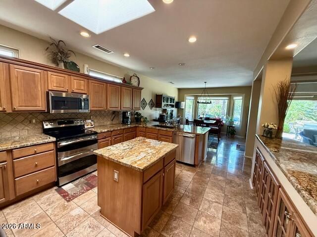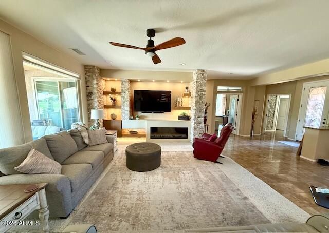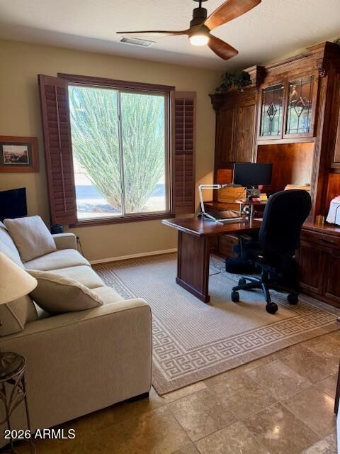 Gorgeous golf course views of Granite North #16! NO EXPENSE SPARED in this stunning Mission model w/travertine floors & plantation shutters. Kitchen features high-end granite counters & sink, custom stained cabinets w/pull-outs, glass fronts & crown molding, SS appliances, + bay window breakfast nook overlooking the course. Den w/built-ins & French doors--ideal 3rd sleeping area. Extended paver patio w/cool decking, built-in BBQ, gas firepit & roll-out awning. Owner's suite offers granite slab shower, dual sinks, bay window & slider w/GC views. Great room w/custom media wall, electric fireplace, stone accents & floating shelves. Extended 2.5-car garage w/cabinets, ceiling racks & service door. Updates: ext paint 2021, Water Htr 2023, low-E windows 2023 & sliders 2024 + NEW Trane HVAC 2026!