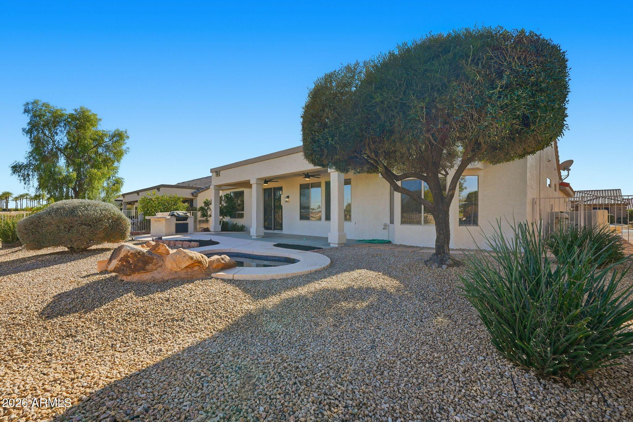 Come and see this freshly remodeled 2 bedroom plus den, 2 bath, 2 car garage golf course lot home in Surprise. Located within the highly sought-after active adult community of The Grand, this move-in-ready property combines modern upgrades with resort-style living. Pulling up to the home, you'll appreciate the mature, low-maintenance landscaping and freshly painted exterior that create excellent curb appeal. Through the front door, brand new wood look flooring flows throughout the main living areas, complemented by plush patterned carpet in the bedrooms. Just off the entry, the spacious living area opens seamlessly to the stunning new kitchen featuring white shaker cabinetry with brushed gold hardware, white quartz countertops, a large eat-at peninsula, custom tiled backsplash, and brand new upgraded stainless steel appliances. Down the hallway, the primary suite is a true retreat with large-format marble-look tile flooring, a spacious walk-in shower, dual black shaker vanity with white quartz countertops, private toilet room, and a generous walk-in closet. On the opposite side of the home, you'll find the secondary bedroom, hall bath, and a large denperfect for an office, hobby room, or guests. Step outside to enjoy the expansive covered patio, mature landscaping, and a private in-ground whirlpool tiled spa while taking in golf course views. The oversized garage offers ample storage and space for a golf cart. Additional highlights include paid-off solar and a new roof underlayment for added peace of mind. The Grand offers an exceptional lifestyle with golf, pools, fitness centers, dining, clubs, and endless activities. Don't miss this beautifully updated home in one of Surprise's premier active adult communities.