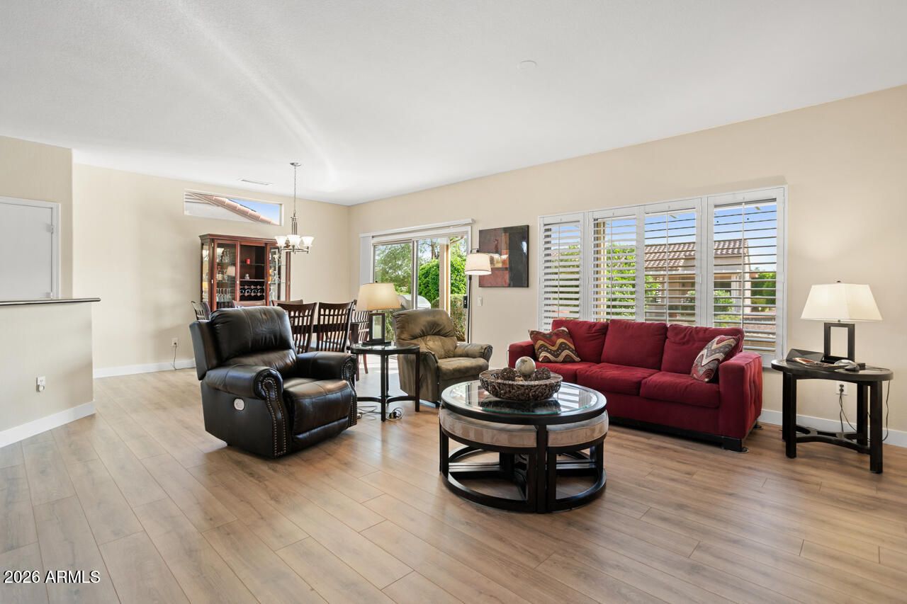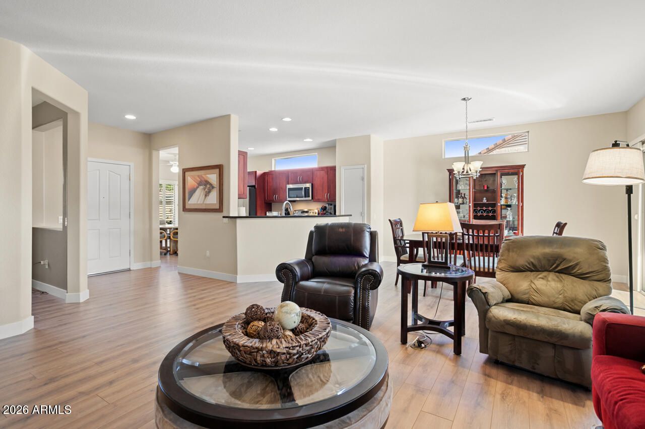 Nicely updated Madera with great curb appeal in a desirable location! This home features new luxury vinyl flooring (2026) with newer carpet in the bedrooms, quartz countertops, and neutral tones throughout. Additional highlights include updated vanities in both the primary and guest bathrooms and a bay window in the primary suite. The spacious 2-car garage includes a sink and workbench. Upgrades include new roof (2026), exterior paint (2024), and HVAC (2018). The yard is equipped with PVC irrigation and offers low-maintenance landscaping. Enjoy the inviting outdoor space with a covered patio, with cool decking, decorative knee wall and mature citrus trees--perfect for relaxing or entertaining.