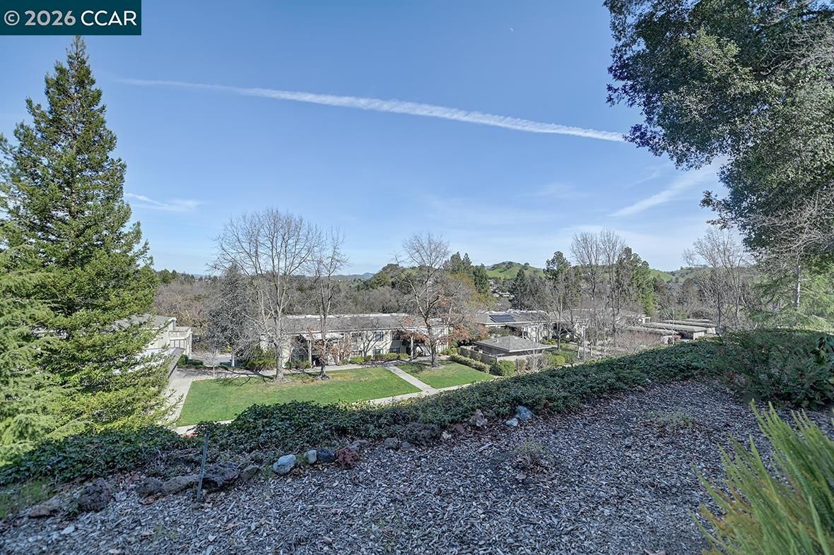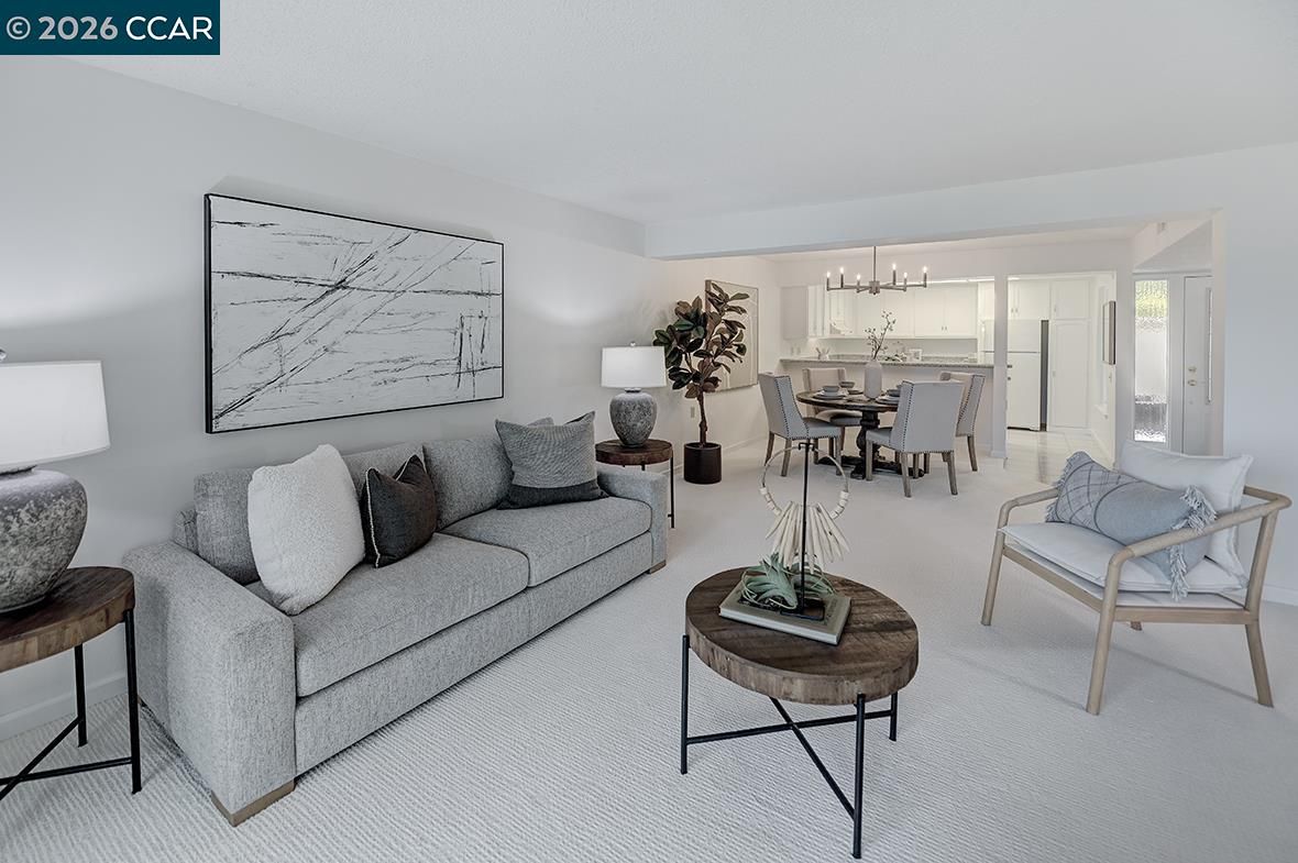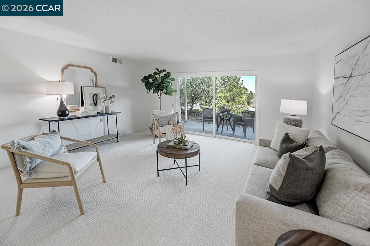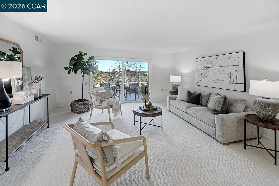 Charming Carmel model in a private, serene setting! This light and bright two-bedroom, one-bath home is move-in ready and beautifully refreshed with new carpet, fresh interior paint, and a stylish new dining room light fixture. Enjoy the spacious landscaped front patio — perfect for morning coffee or outdoor entertaining. The back patio offers a lovely grassy area and expansive views of the Tice Valley hills, creating a peaceful retreat. Complete with a full-size washer and dryer, this inviting home offers comfort, charm, and exceptional outdoor living, perfect for you and your furry friend. Rossmoor is a 55+ active adult gated community.