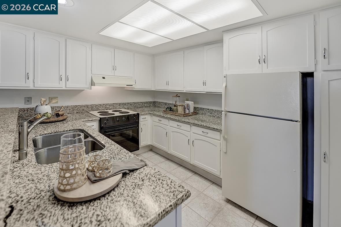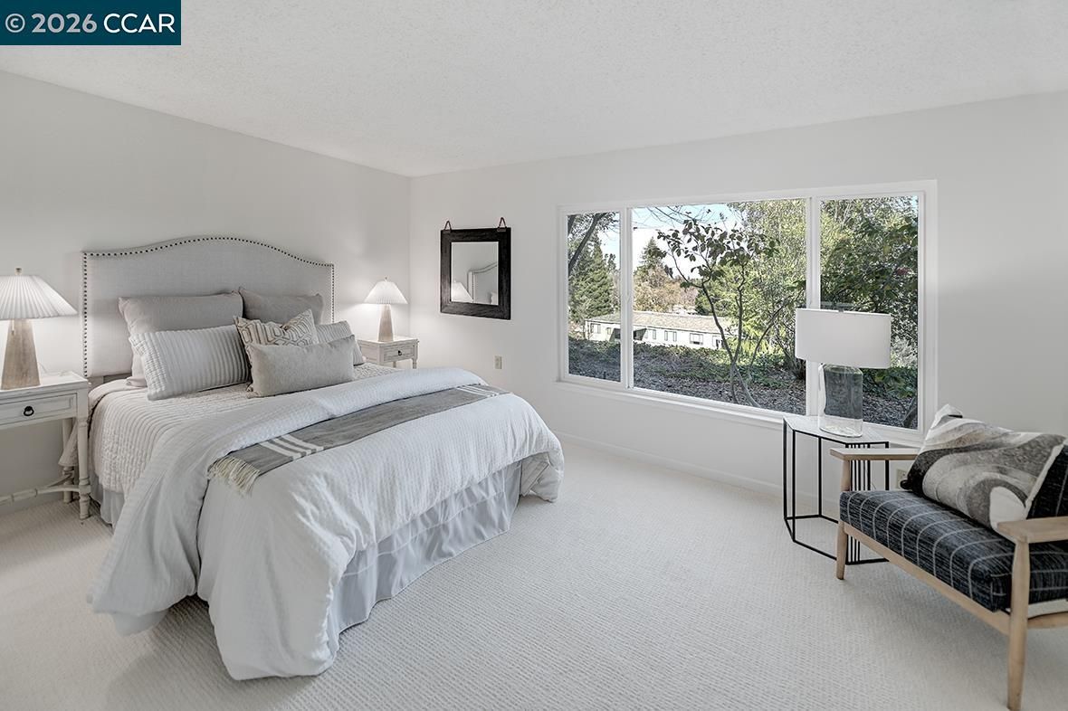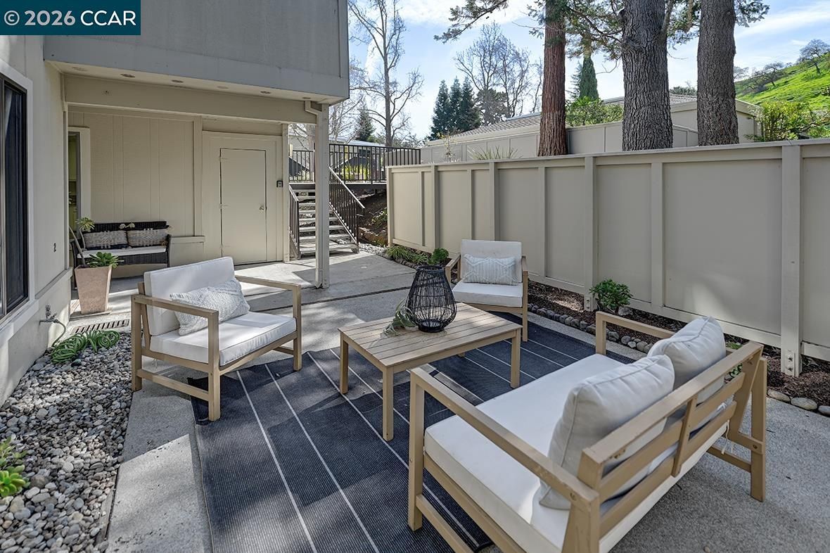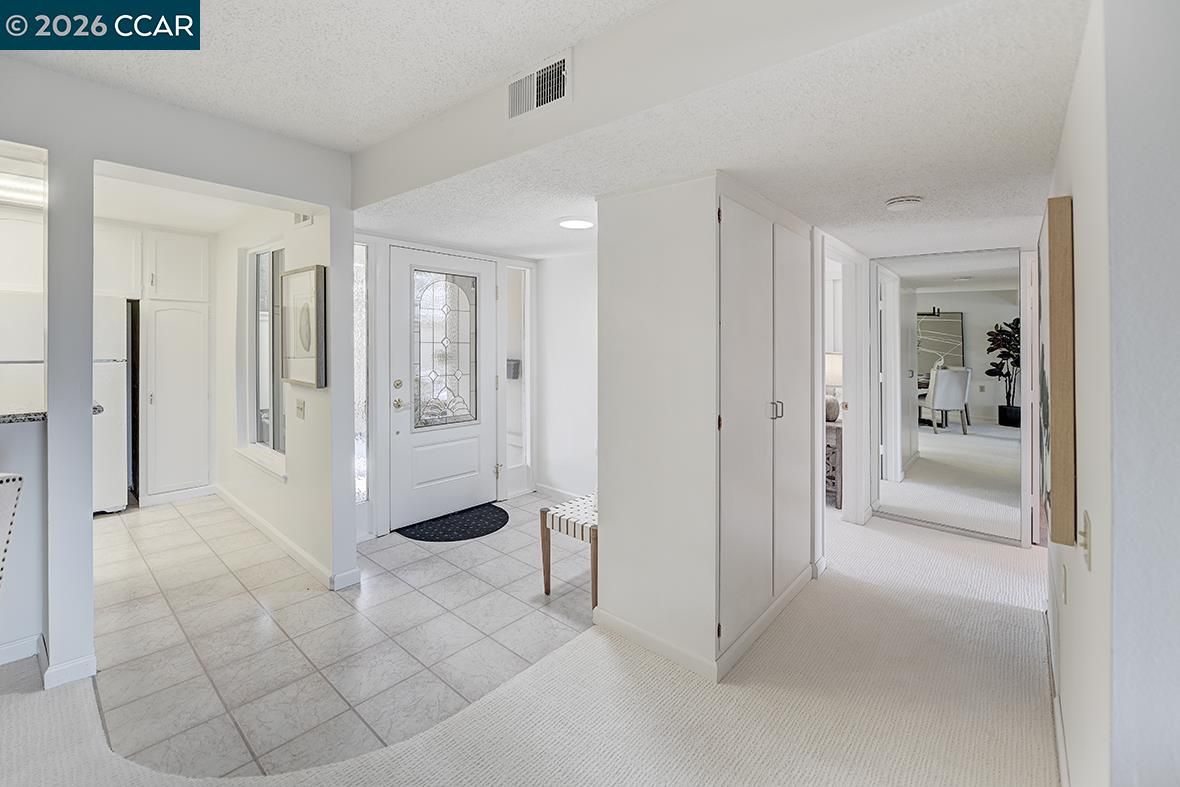 Charming Carmel model in a private, serene setting! This light and bright two-bedroom, one-bath home is move-in ready and beautifully refreshed with new carpet, fresh interior paint, and a stylish new dining room light fixture. Enjoy the spacious landscaped front patio — perfect for morning coffee or outdoor entertaining. The back patio offers a lovely grassy area and expansive views of the Tice Valley hills, creating a peaceful retreat. Complete with a full-size washer and dryer, this inviting home offers comfort, charm, and exceptional outdoor living, perfect for you and your furry friend. Rossmoor is a 55+ active adult gated community.