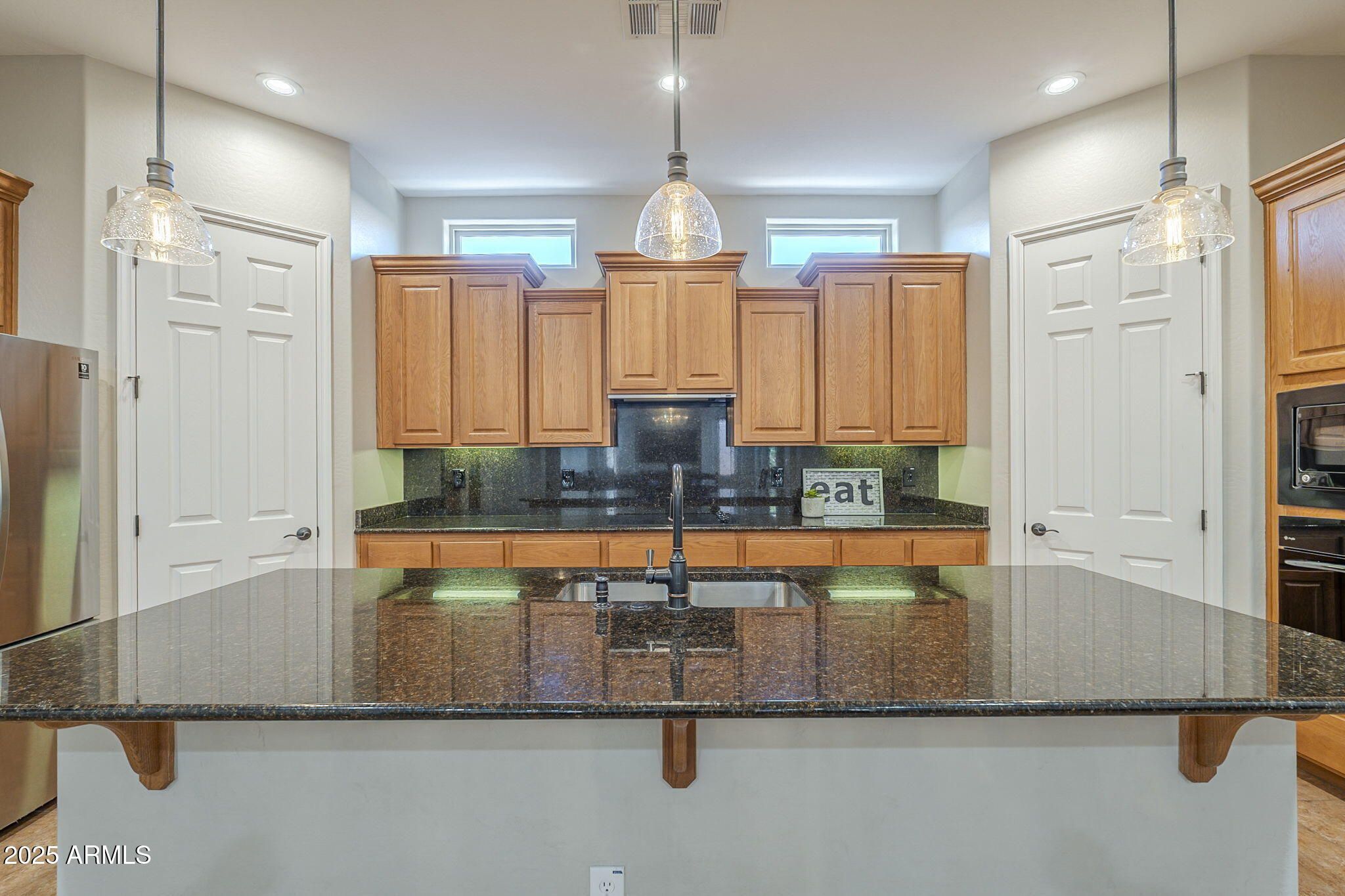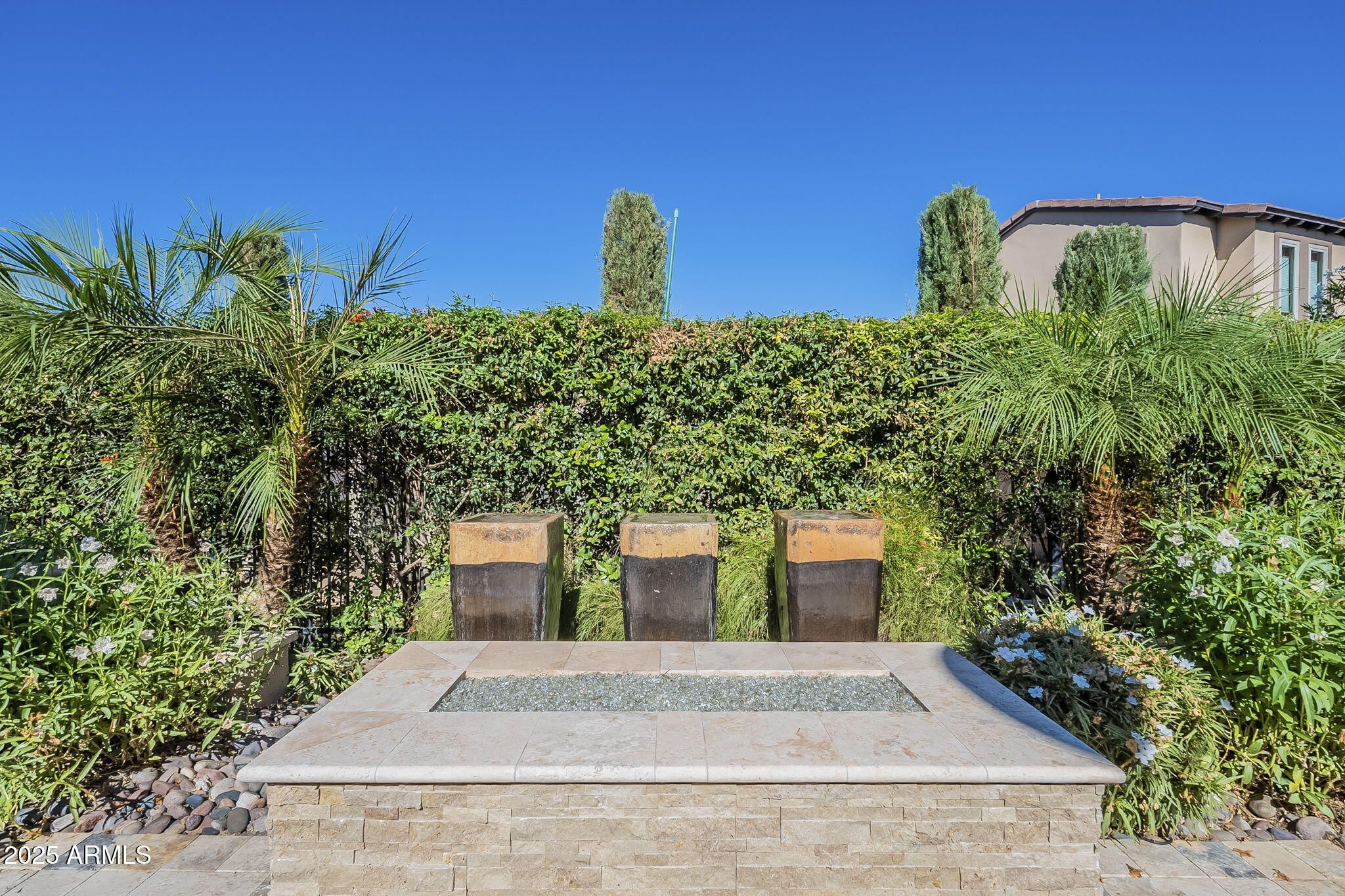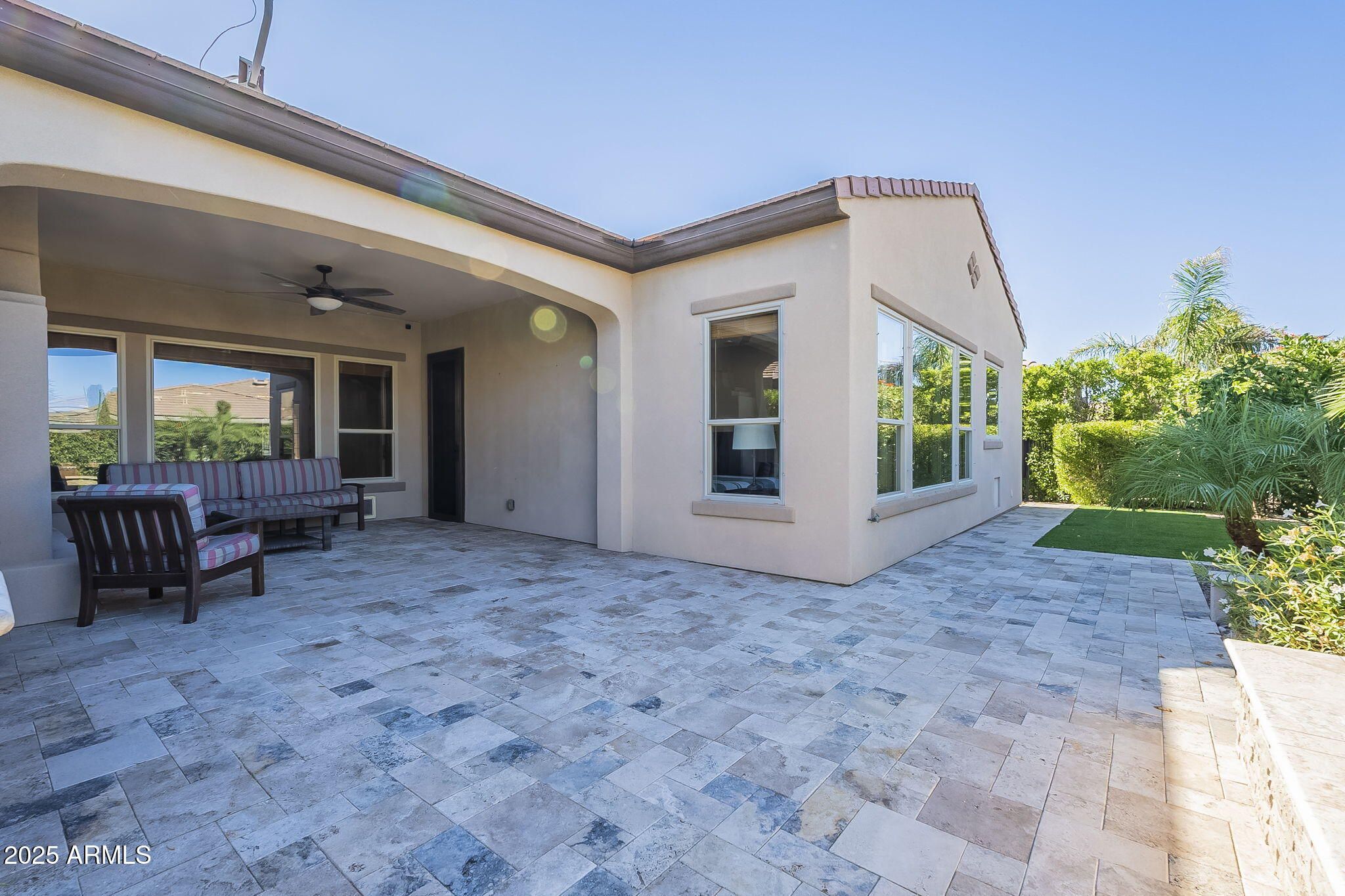 Turnkey and energy smart at Encanterra. This 3 bedroom 2.5 bath home with a 2.5 car garage features owned solar for low utilities. The backyard is an entertainer's retreat with turf, expanded travertine pavers, a relaxing fountain, built-in BBQ, and a covered patio with fireplace. Inside, an open kitchen with granite counters and two pantries flows to bright living and dining. Tile is throughout the home. Spacious bedrooms and ample storage keep life organized. Sold fully furnished so you can move in and start enjoying the Encanterra lifestyle on day one!