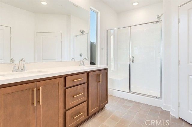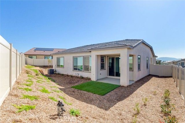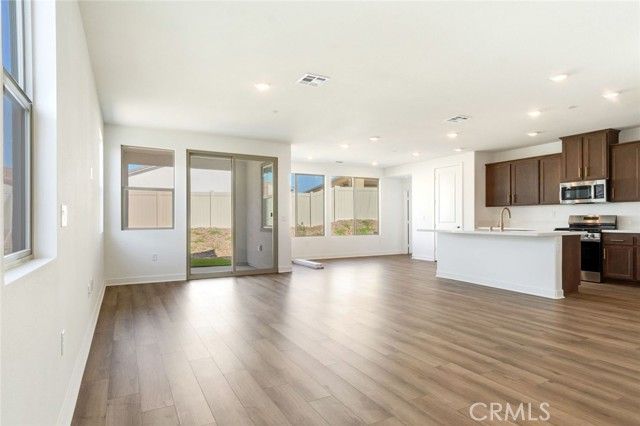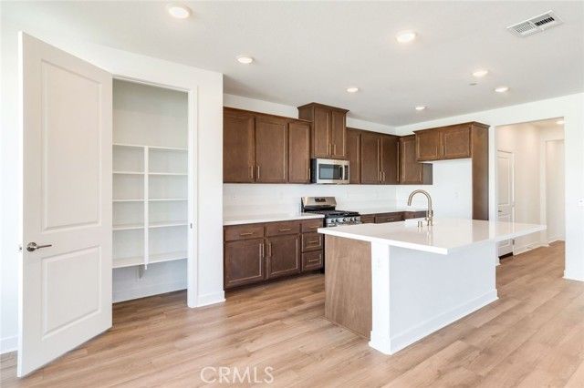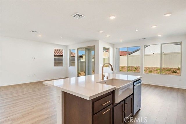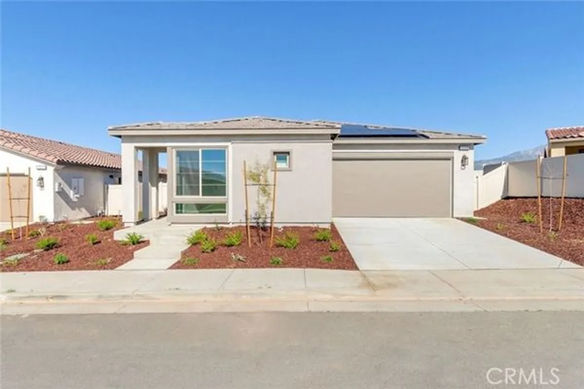 Move-in Ready Home! This beautifully appointed residence features a stucco patio cover, an 8’ entry door, and thoughtfully selected interior upgrades throughout. The primary bath includes a fiberglass shower, while Bath 2 offers a fiberglass tub with a classic subway pattern. The kitchen is equipped with a GE 30” freestanding gas range appliance package with stainless steel microwave hood, Nutmeg shaker cabinets with satin bronze 7” bar pulls, Simply White quartz countertops, an upgraded champagne bronze pull-down faucet, and an upgraded Elkay white farmhouse single-bowl fireclay sink. Additional highlights include pendant light pre-wiring at the island, luxury vinyl plank flooring in common areas, carpeted bedrooms, and vinyl flooring in bathrooms and laundry. The covered patio is prewired for a ceiling fan, and the great room is flat-screen TV ready with conduit. Situated on a 5,887 SF lot.