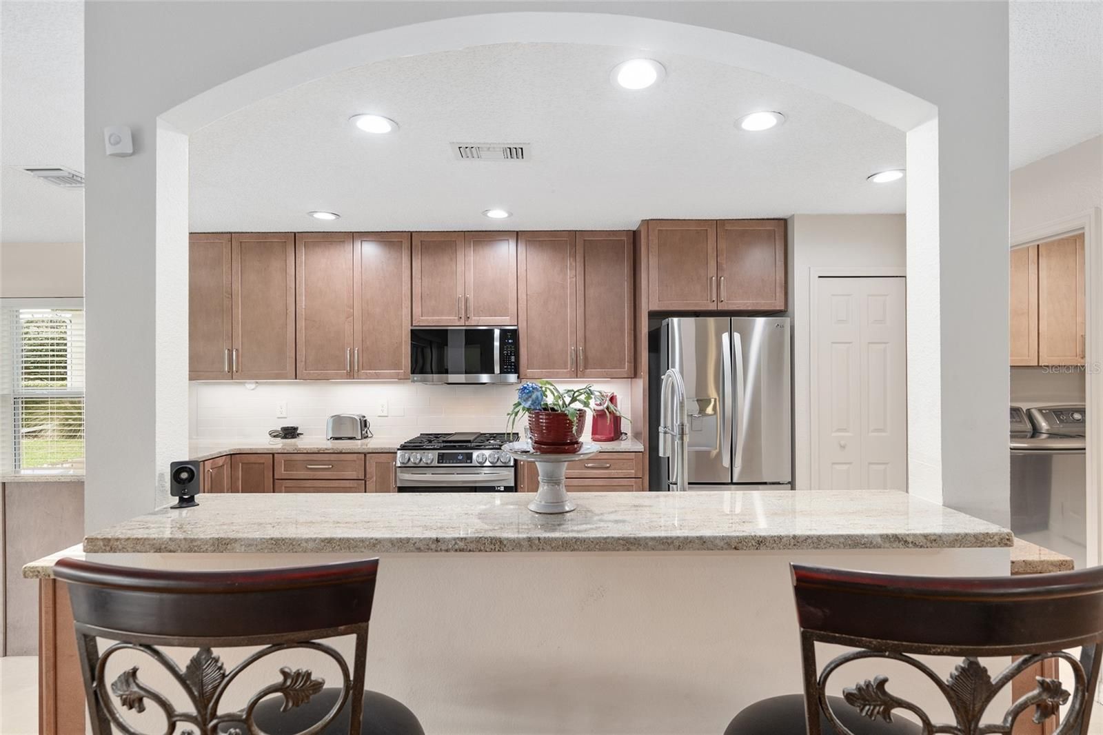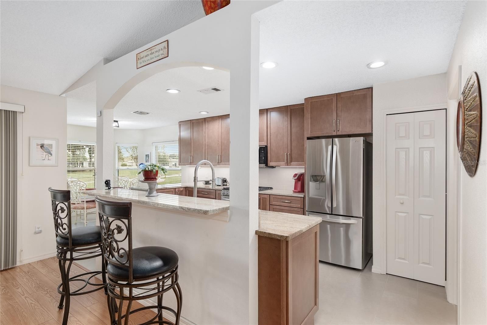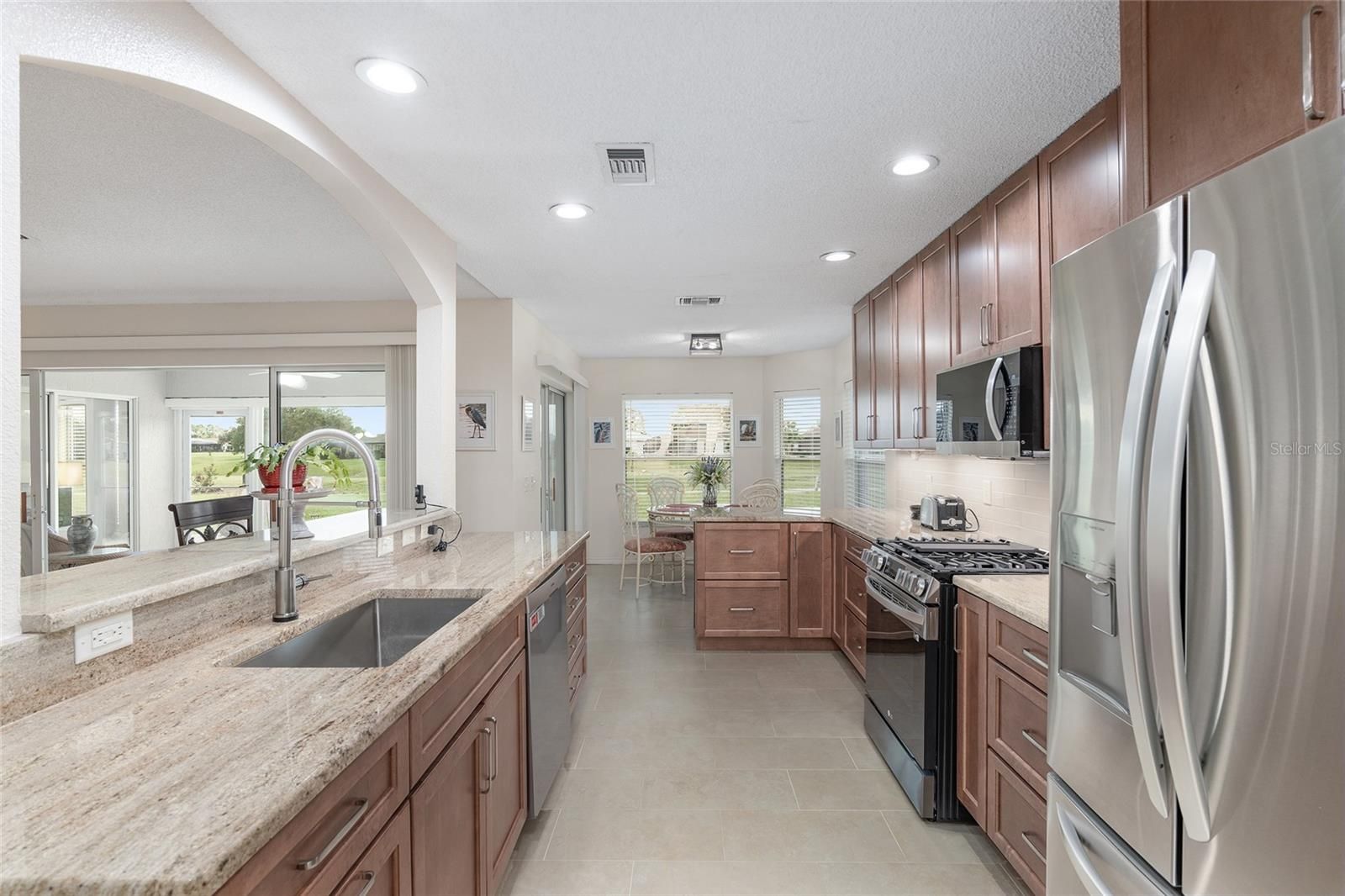 Beautiful 3/2/2 home on the golf course in the popular Summerglen 55+ gated golf course community with FREE GOLF FOR A YEAR! BETTER THAN NEW with so many upgrades! New roof, HVAC, water heater, KITCHEN REMODEL, appliances, PRIMARY SHOWER, irrigation, landscaping, screened front porch, garage door opener, windows, and more! With the GOLF COURSE in front and back of the home, you have great views from every window! Immaculate ~ move-in ready! NO CARPET. OPEN FLOOR PLAN. Living room is spacious with vaulted ceilings and has a dining area too! Florida room has new custom shades and new door with great views of the golf course. Gorgeous NEW KITCHEN has an eat-in area, plenty of upgraded cabinets and granite counters, SS appliances including gas range, breakfast bar, and pantry. Split bedrooms. Primary suite has Florida room access, walk-in closet, dual sinks, linen closet, and NEW ceramic tile walk-in shower. Inside laundry includes washer/dryer and extra storage matching the kitchen cabinets. The back patio is a great spot to grill or enjoy the view/sunsets. The HOA includes lawn care, Xumo Spectrum cable/internet with 3 boxes, trash, guarded entrance, and wonderful amenities (golf course, pool and spa, fitness center, tennis courts, dog park, pickleball, softball, sports/recreation fields, and more). Retirement living at its best! Furniture may be purchased separately. FREE GOLF FOR A YEAR (ANNUAL SINGLE MEMBERSHIP)!