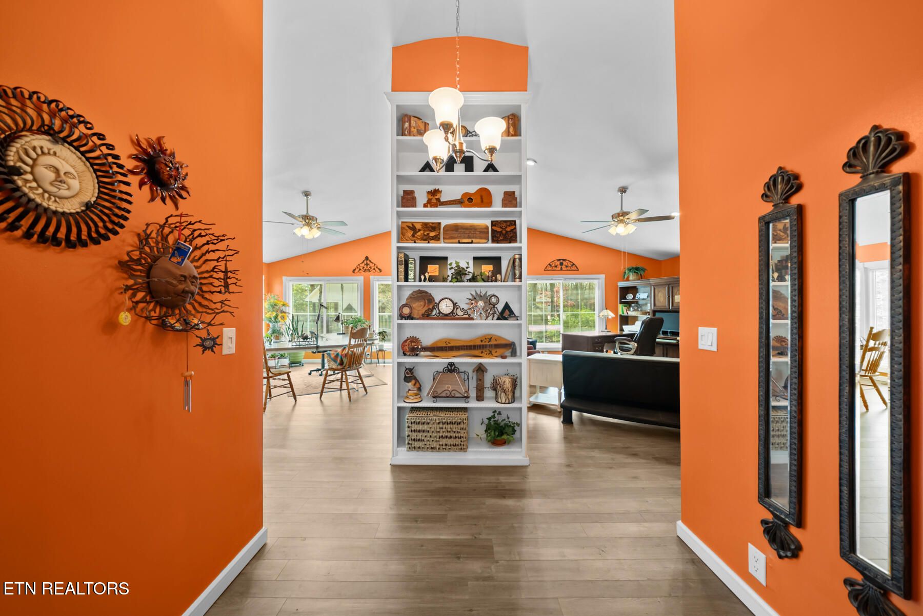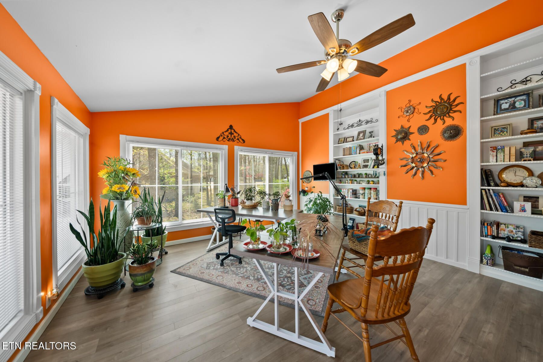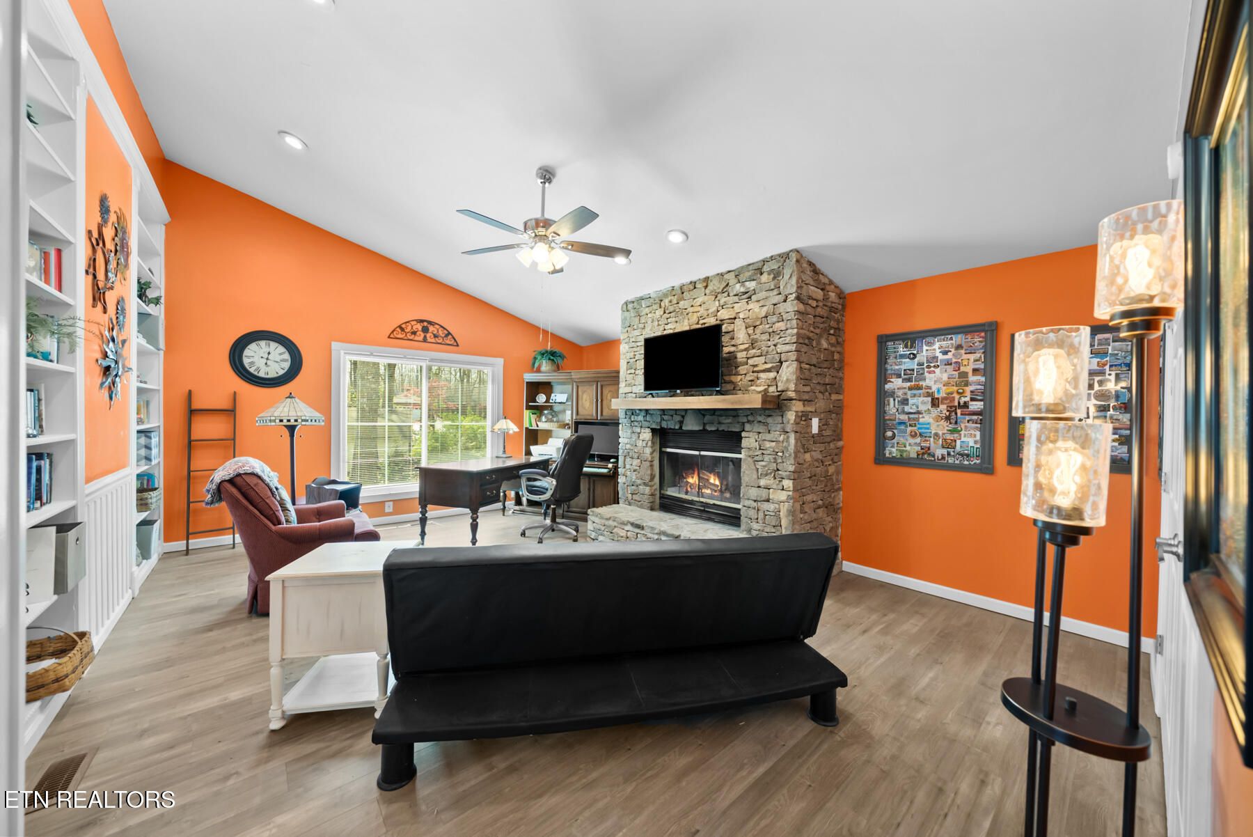 Beautifully updated home featuring new laminate flooring throughout most of the living areas, with tile in the bathrooms. Enjoy peaceful lake views from the front porch--perfect for relaxing mornings or unwinding in the evening. This spacious home offers 2 bedrooms, a dedicated office, and a bright sunroom, all with abundant storage. The fully renovated kitchen showcases white cabinetry, granite countertops, a stylish backsplash, stainless steel appliances, and a center island--ideal for both everyday living and entertaining. Both the office and sunroom feature impressive floor-to-ceiling bookshelves. The sunroom is a true highlight, complete with a stunning stone wood-burning fireplace and expansive windows that create a warm, inviting space for gatherings or cozy nights in. All bathrooms feature tile showers, with the primary suite offering a zero-entry tile shower for a sleek, modern touch. Additional upgrades include a new roof, new windows in the living room, sunroom, and office, as well as several new doors. The oversized garage offers a workshop area, built-in cabinetry, and a new garage door for added convenience. The partially fenced backyard is perfect for a small dog, adding to the home's charm and functionality.
