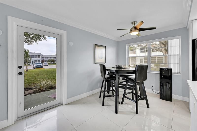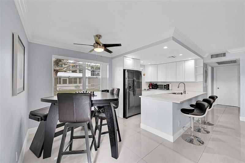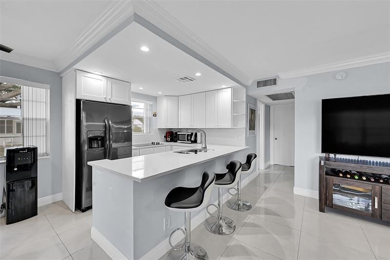 Fully renovated beautiful, ground floor corner unit. Open living concept with tastefully update kitchen with quartz countertops, black stainless refrigerator & dishwasher, induction stove top. New white tile flooring through-out including sunroom. Designer, updated bathrooms. Hurricane impact windows & doors, and accordion shutters on the windows. This 2-bedroom, 1.5-bathroom home offers incredible community amenities, including 16 heated pools (1 indoor), tennis, pickleball, volleyball, bocce ball, shuffleboard, community bus, and more. Barbecue area with a gazebo & dance floor, plus a 145,000 sq. ft. million dollar clubhouse with a theater, fitness center, billiards, library, arts studios, and social spaces. This 55+ community is perfect for Florida living!