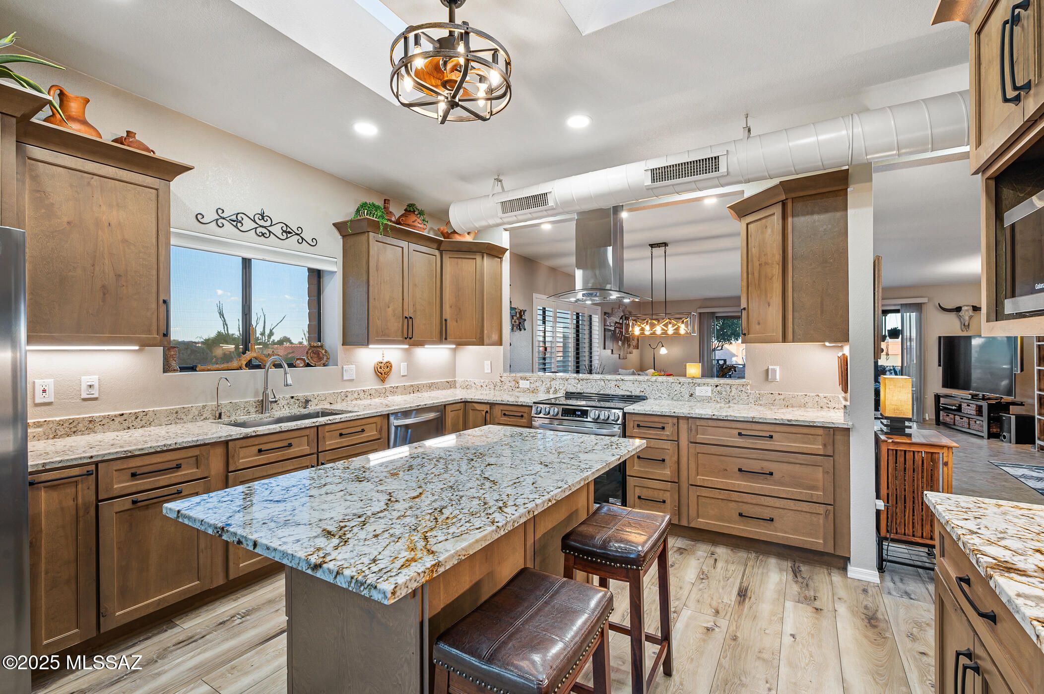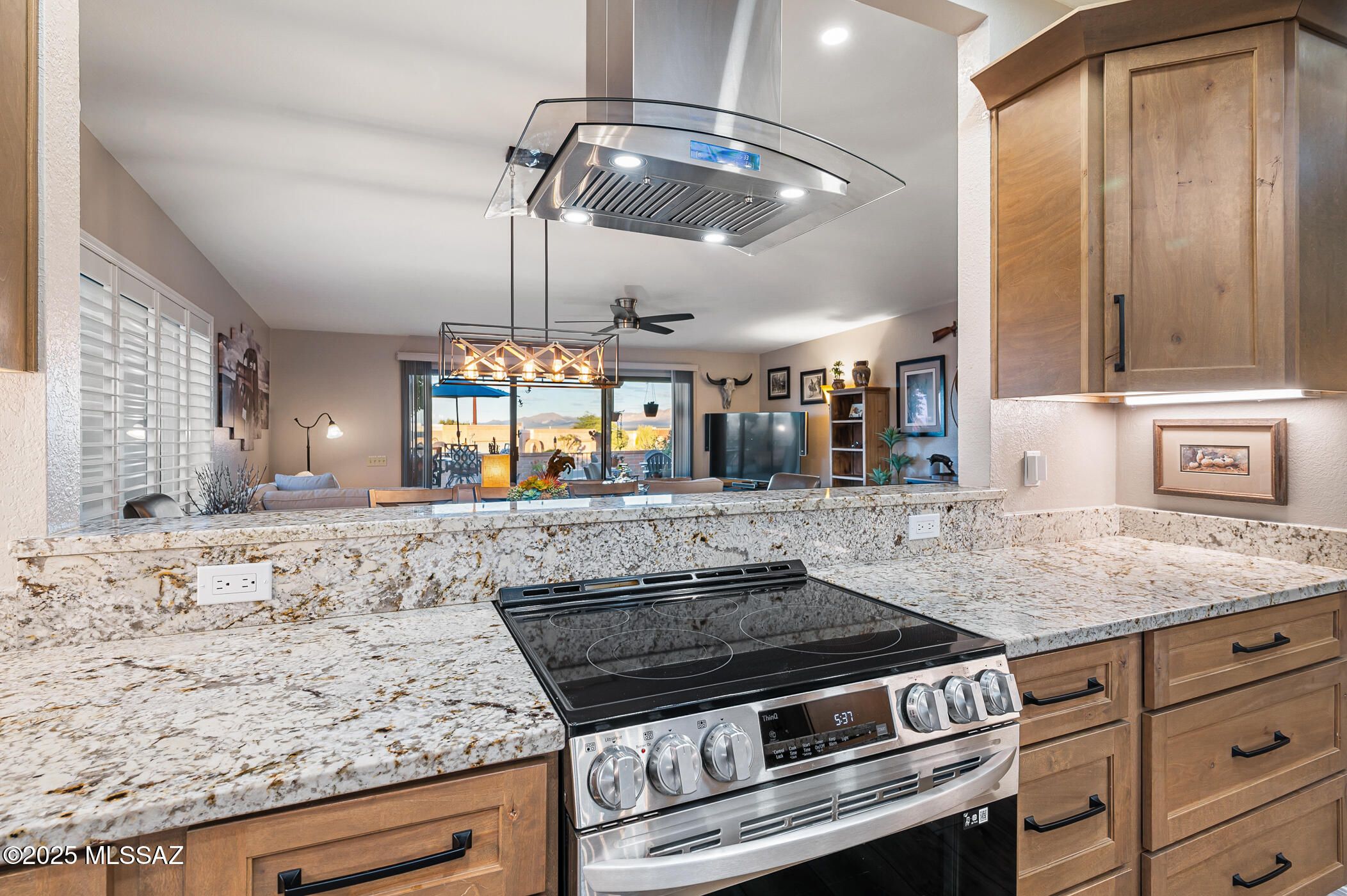 Nestled in the heart of Green Valley's serene desert landscape, this spectacular retirement home presents a perfect fusion of luxury and comfort, tailored for those who seek the tranquil Southern Arizona lifestyle. As you step inside this impeccably renovated residence, you're greeted by a spacious, open-concept design where the living, dining, and kitchen areas flow seamlessly together beneath raised ceilings, creating an inviting atmosphere for relaxation and entertainment. The gourmet kitchen stands as the home's crown jewel, boasting exquisite cabinetry accented with crown moldings, striking granite countertops, and a functional center island that invites social gatherings. The earth-toned tile flooring, laid on the diagonal, infuses warmth and sophistication into the living spaces,
