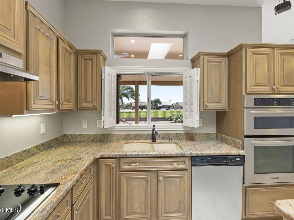 Very special home where the owners have maintained the property in immaculate condition.Truly a find located on Trail Ridge Golf Course #11.Extended Ventana model has 1,993 sf, 2 suites,den,2.5 baths & 2.5 car garage.Newer Roof Underlayment,HVAC & Hot water heater.Interior: Luxury vinyl & tile floors,Window shutters throughout except liv/din rms.Beautiful remodeled chef's kitchen (stubbed for gas),granite counters, ss appliances,skylight,island.Extended Arizona room entertainment wall with gas fireplace. Whole house interior neutral paint.Primary Bedroom bay windows & New bath walk in shower, toilet.Guest suite bath new tiled shower.Exterior: Spacious covered rear patio kool coated & sidewalk, wrought iron fence.Garage epoxy floors,cabinets,whole house water cond system.Low Tax Area! New HVAC / Furnace / 2 return ducts added Repaired / painted golf shed exterior wall Replaced attic solar fan - 25 yr. warrantyRebuilt both showers and Shutters - Kitchen, 2nd Bath & Hallway Installed concrete sidewalk w/Kool Deck coating Installed and painted block concrete wall fence Refinished front entry and back patio surfaces with Kool Deck concrete coating 3M Sun Control window film throughout home Installed Duette window treatments and 2 Duette Verti glides (patio door/master bath) Installed hot water recirculation system in 2nd bath Floor grout cleaned and re-stained