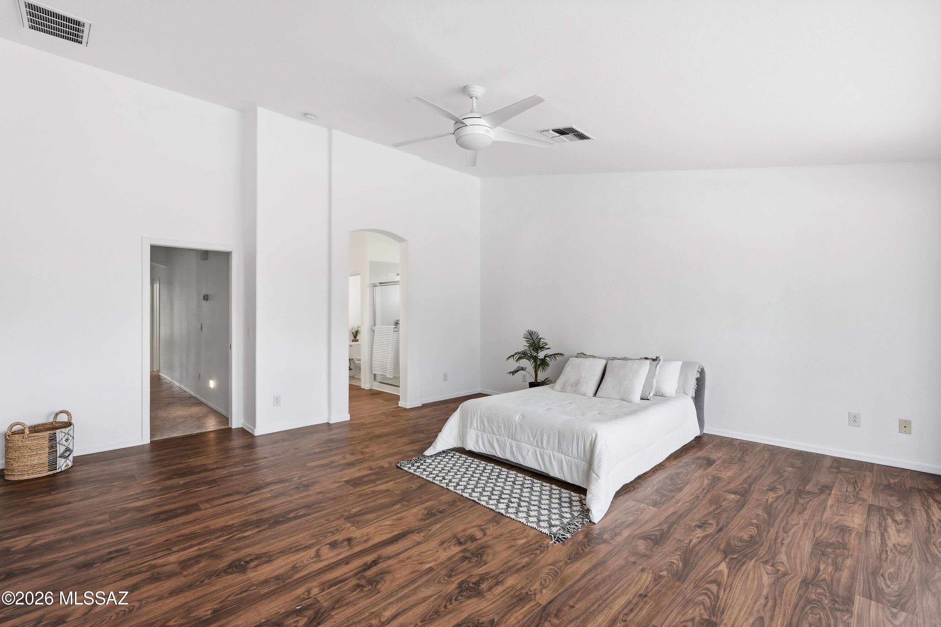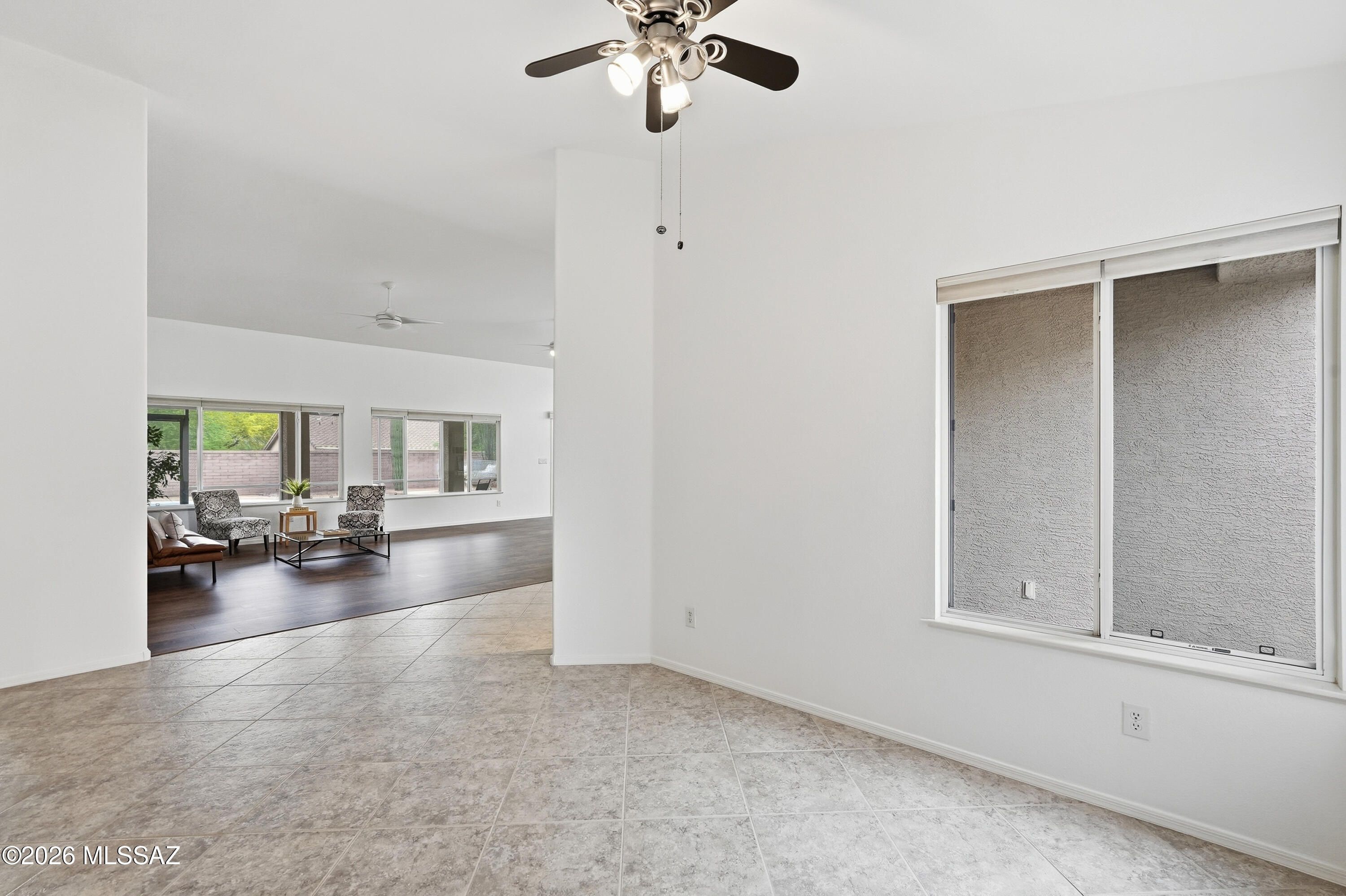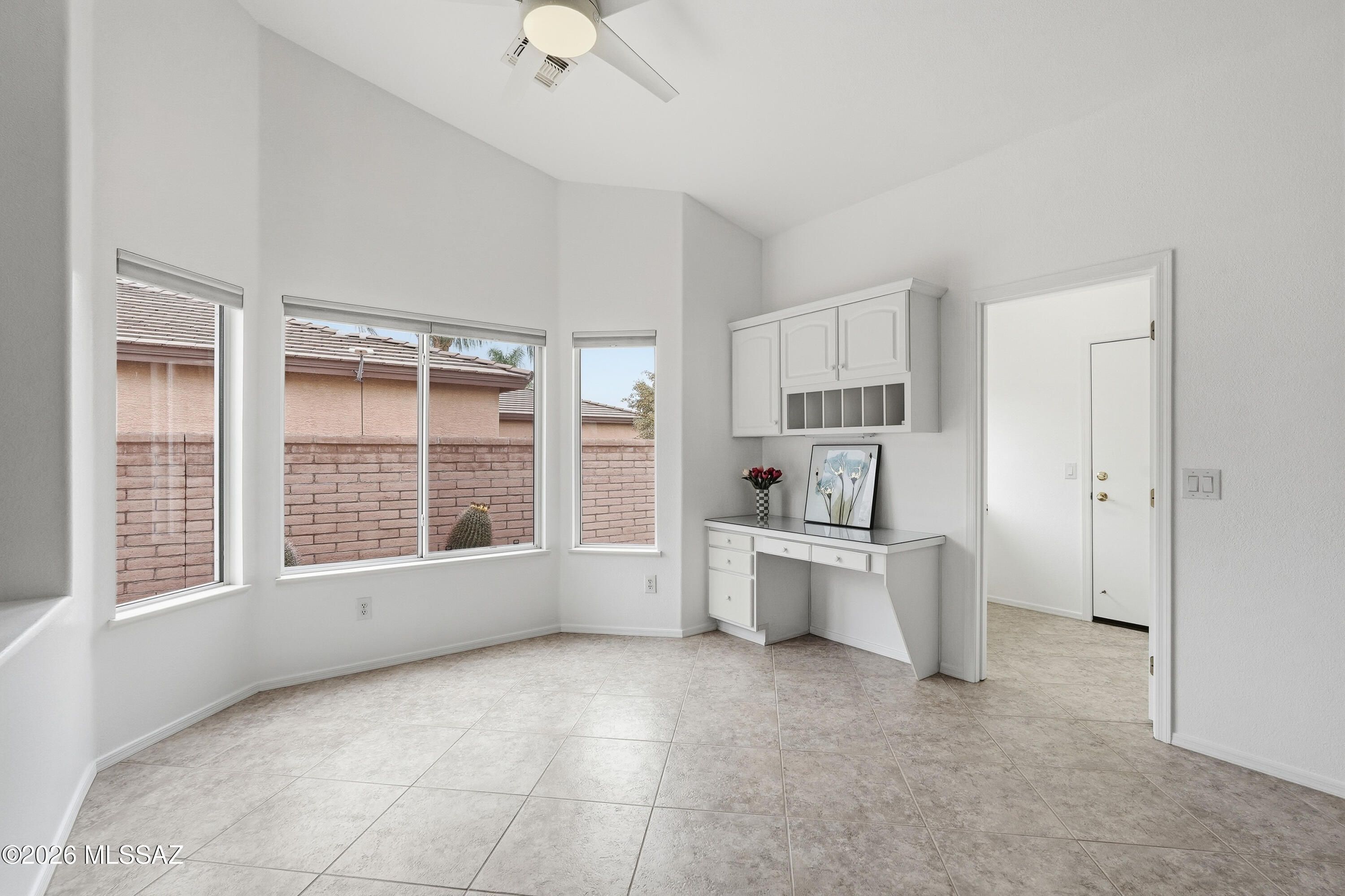 Experience true pride of ownership in this expanded Montana model, offered for the first time by its original owners. Situated on a desirable corner lot, the home welcomes you with beautiful desert landscaping, featuring majestic Saguaros and Ocotillos that perfectly captures the Arizona aesthetic.Inside, 2,361 sq. ft. of light-filled living space awaits, highlighted by soaring high ceilings and a versatile layout. Currently configured as a 2-bedroom plus a light filled den, this home can easily be converted into a 3-bedroom retreat to suit your needs. Welcome to an expansive, light-filled sanctuary with vaulted ceilings and seamless open-concept living. A private backyard oasis for you to enjoy a refreshing dip in the energy-efficient 3.4ft fiberglass pool or unwind in the spa section
