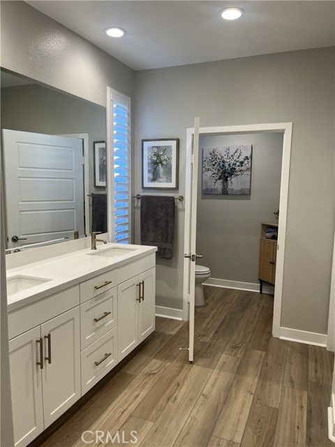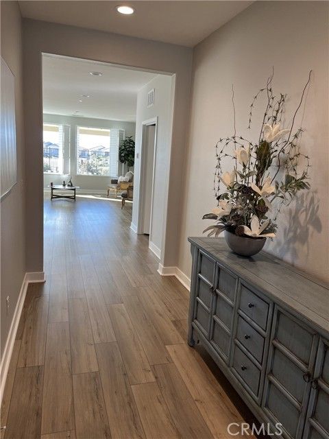 This home is located in Altis for residents aged 55 or older. The home features numerous upgrades including waterproof wood-look flooring, shutters, and a chef's kitchen featuring a farmhouse sink. There is white cabinetry throughout the home with brass hardware. The house has been professionally painted in neutral tones. Situated on a premium corner lot, the property provides views from both the front and back, with no home behind it, just the HOA maintained trail. The front and backyard was professionally landscaped for low maintenance. The community has a resort like feel with a clubhouse, pools, spa, fitness gym, and pickleball courts to name a few. The home is equipped with smart technology and keyless entry. Welcome to Beaumont!