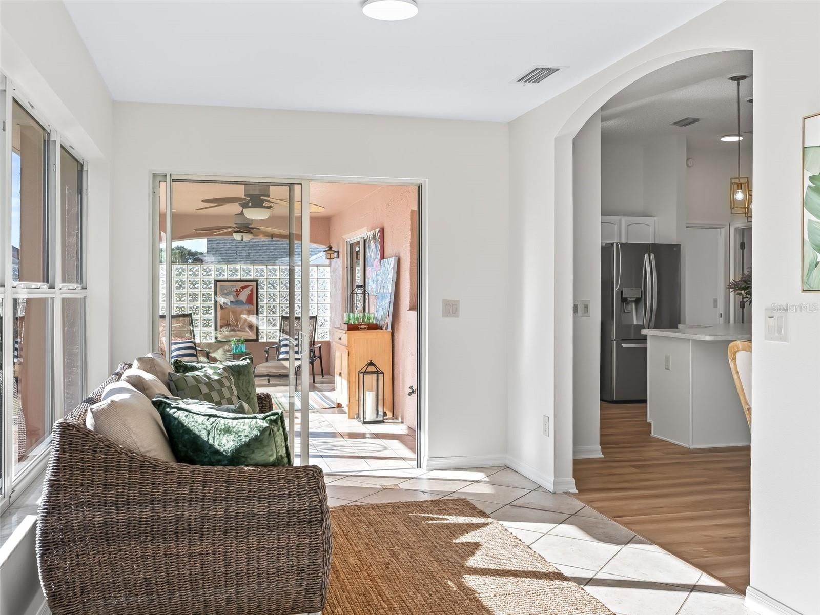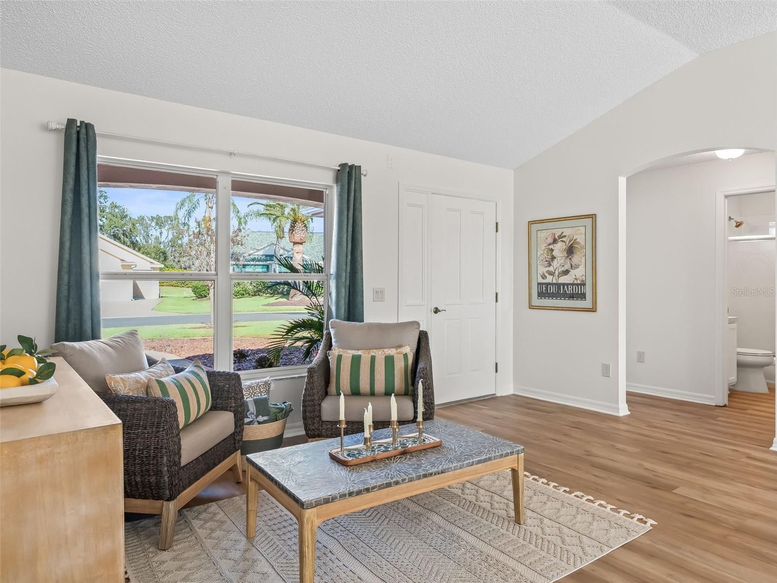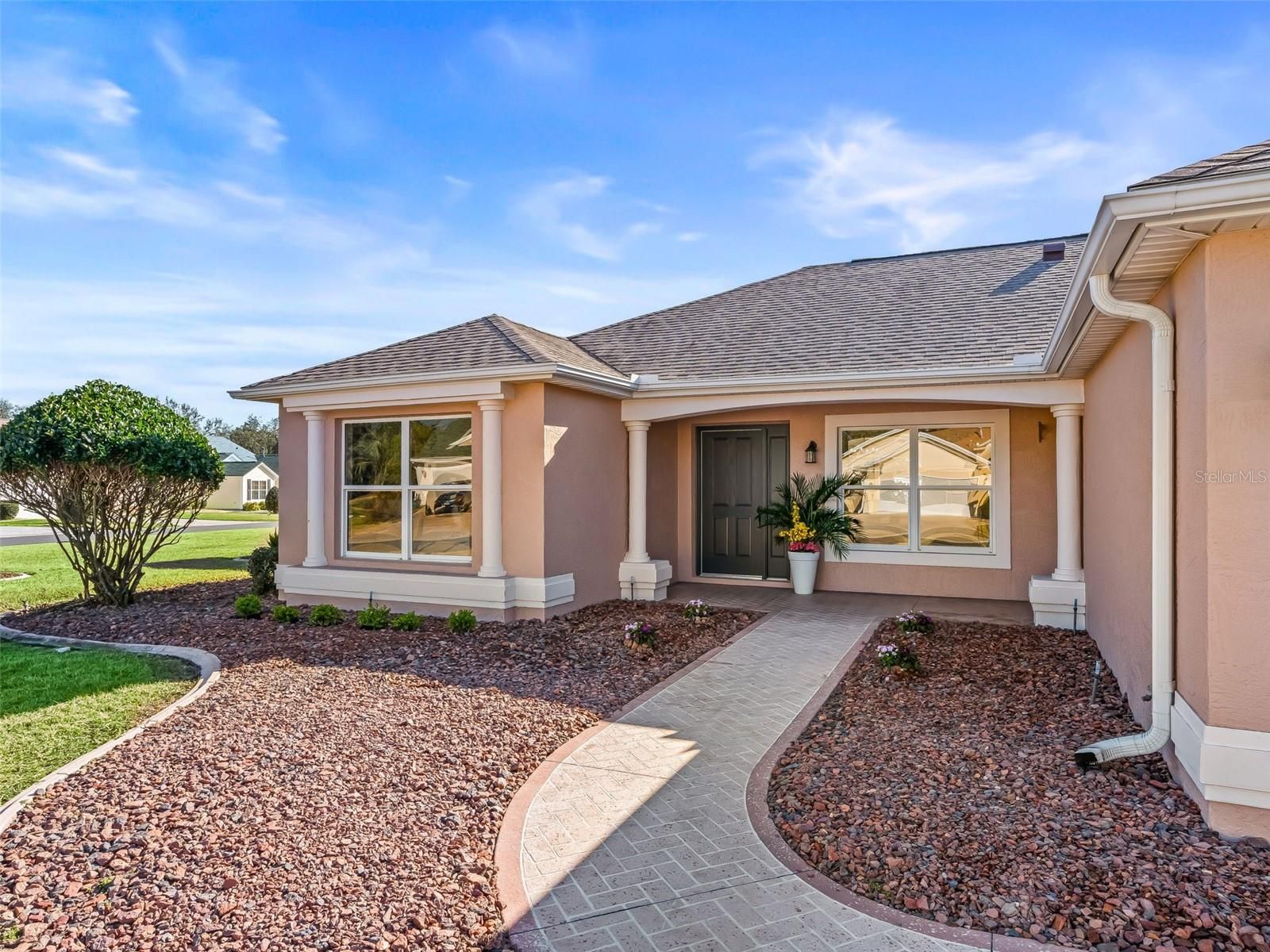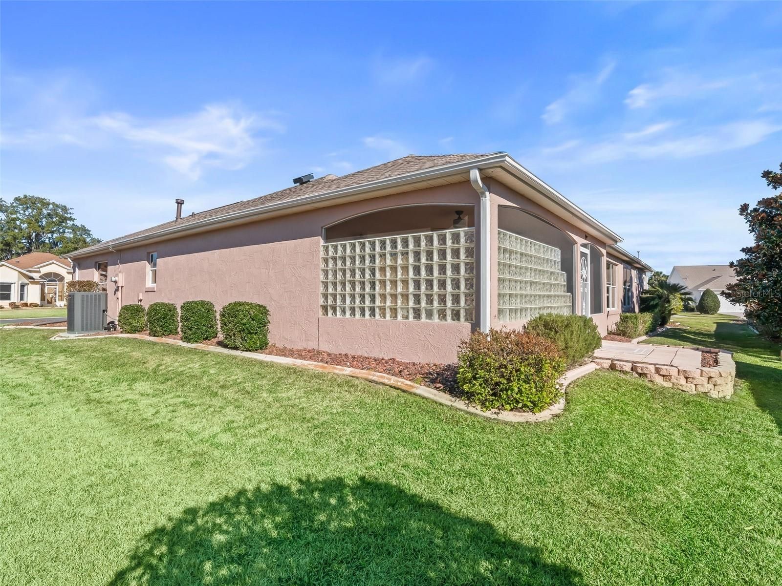 Wow! A Glenwood fully UPDATED & MOVE-IN READY MUST SEE HOME! And, a 5 minute golf cart ride to GOLF! TENNIS! PATIO DINING and spectacular Florida sunsets. NO BOND!!!! What's more, this designer Azalea/Maple model boasts over 2,000 sq ft with a custom 400 sq ft (approx) BONUS ROOM perfect for entertaining, gaming, big screen TV, quilting, art or crafting studio, music studio or grande piano!. Prime corner lot just minutes to the awarded Glenview Golf & Tennis Country Club. NEW PAINT (interior) and NEW Luxury Vinyl FLOORING (2026)! The open living/dining/kitchen combo is bright with vaulted ceilings, and large windows in the Florida room bring in the sunshine. No carpet! Guests will enjoy added privacy of the split floor plan. A large lanai offers Florida living at its best. The owner's ensuite offers 2 master closets and double sinks. Ensuite opens to the lanai with sliding glass door. Other upgrades: NEWER ROOF (2021) NEWER KITCHEN APPLIANCES (2021) gas oven, NEWER A/C (2022) NEWER exterior paint (2023) NEWER gutters (2021). NEWER HOT WATER HEATER (2023). Extra cabinetry in laundry room & garage and solar tube. Home is centrally located between vibrant Spanish Springs Square and the serene Lake Sumter Landing Market Square. Minutes away from the Savannah Entertainment Center and near First Responders Rec Center, VA Clinic and convenient to retail shopping, banking and medical offices at Southern Trace Shopping Plaza. Enjoy live music, cocktails, patio dining, driving range, golf & tennis minutes from your front door at Glenview Country Club! Enjoy The Villages lifestyle at nearby squares and recreation centers! This custom home has it all! All measurements are approximate and to be verified by buyer.